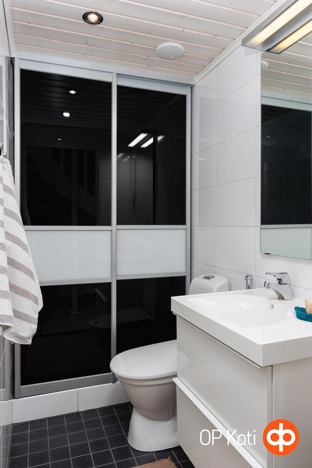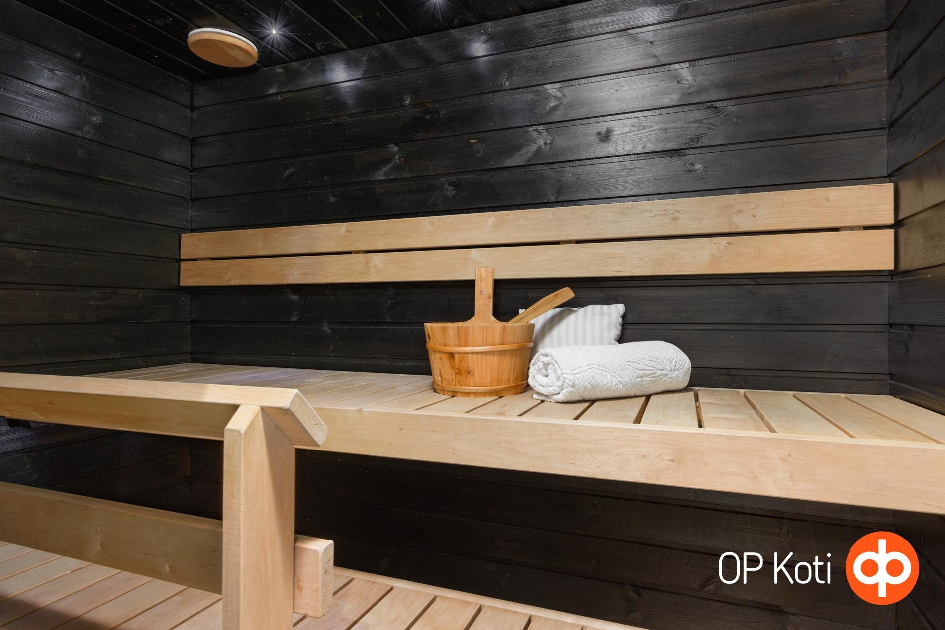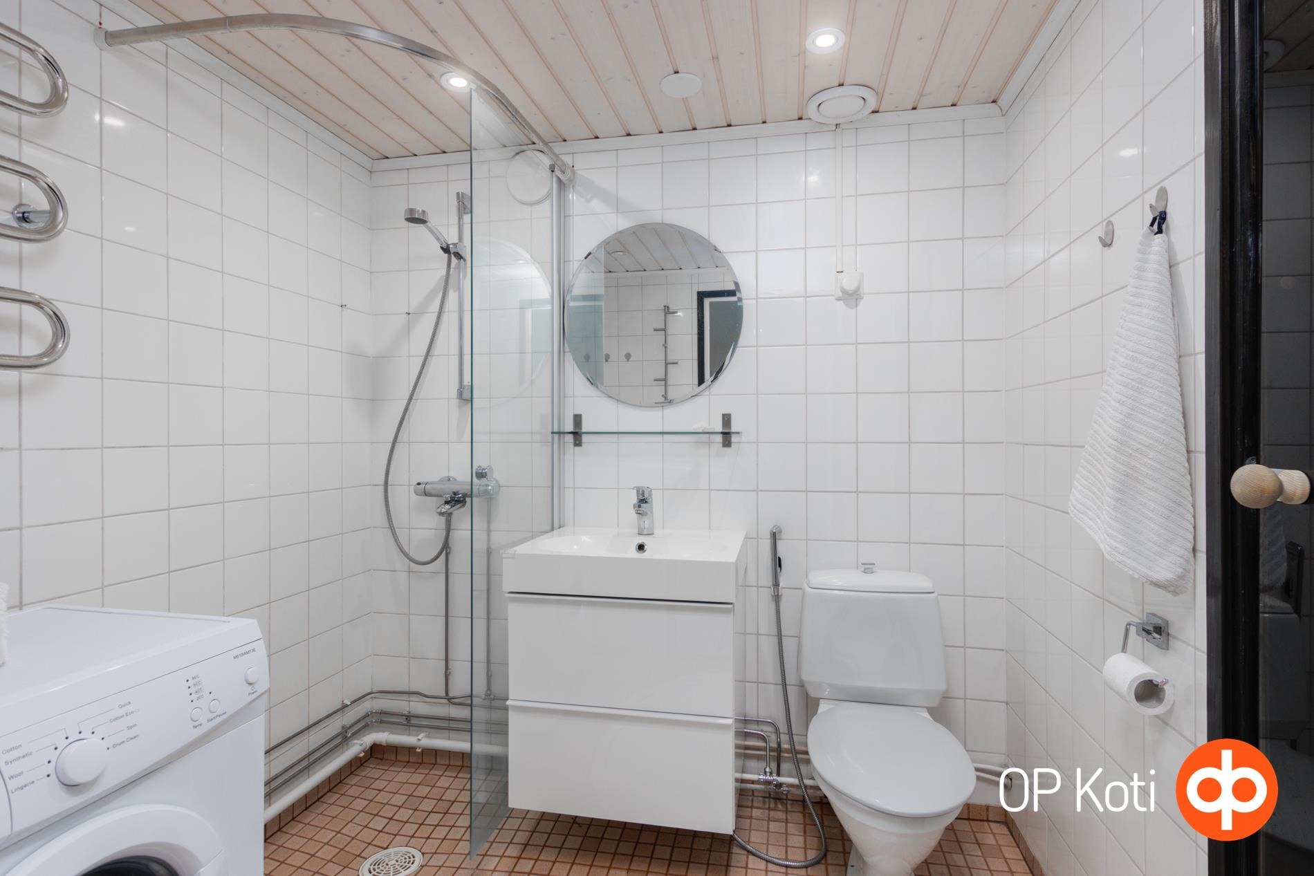 - Sauna, sähkökiuas, kylpyhuone Yläkerrassa, erillinen wc Alakerrassa, suihku, suihkuseinä, peilit, allaskaappi, pesukoneliitäntä Kylpyhuoneessa, lattialämmitys Alakerran wc, kiinteät valaisimet.