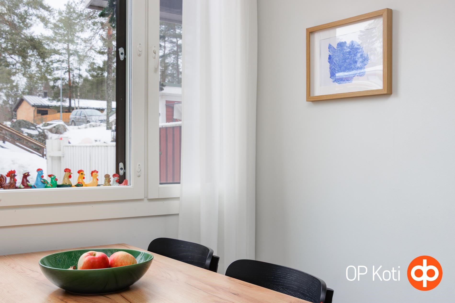 Tervetuloa kotiin, jossa arki tuntuu kevyemmältä ja jokainen huone kutsuu viihtymään. Tämä valoisa ja lämminhenkinen kaksikerroksinen, saunallinen kolmio on vuosien varrella uudistettu tyylillä ja tunteella - juuri sellaiseksi paikaksi, jossa on helppo viihtyä.Alakerran kodikas keittiö kutsuu kokkaamaan ja kokoontumaan, ja olohuoneen ikkunoista tulviva luonnonvalo luo pehmeän tunnelman niin arki-iltoihin kuin viikonloppujen hetkiin. Erillinen wc tuo toimivuutta arkeen.