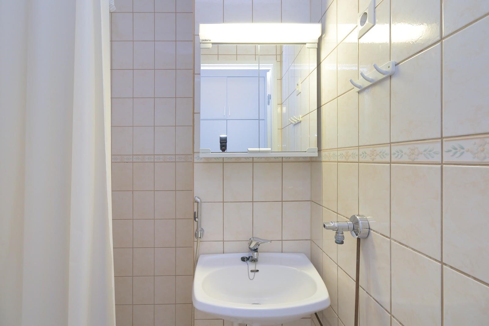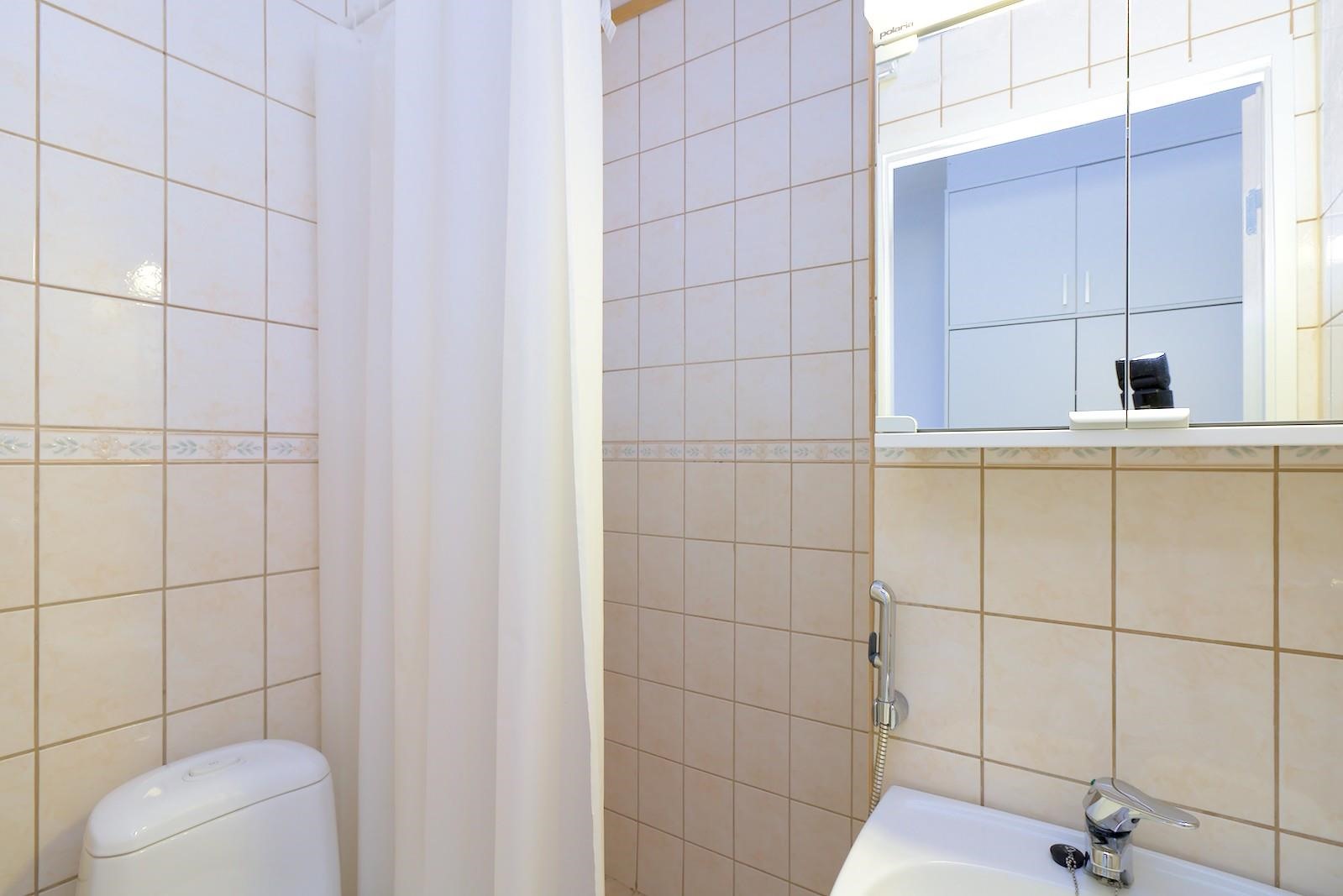 - Kylpyhuone, suihku, peilikaappi, pesukoneliitäntä mahtuu kapea pyykkikone.