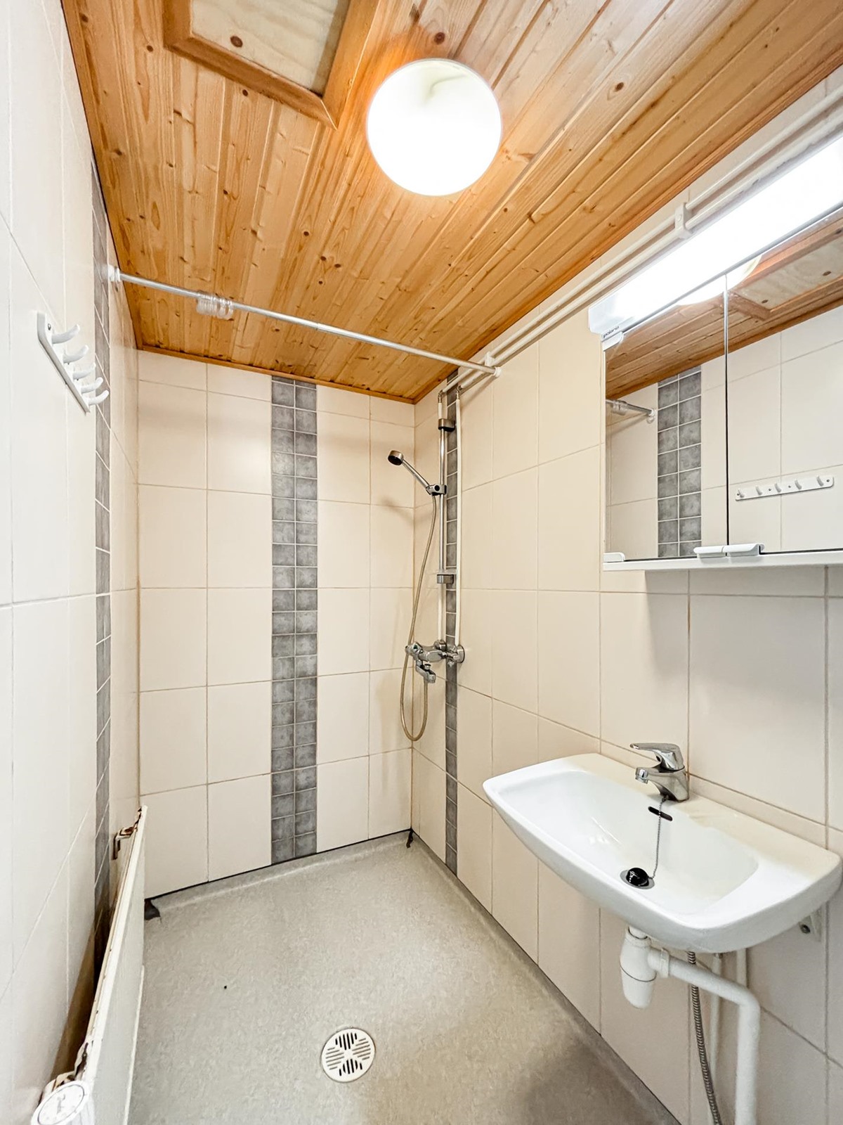 - Kylpyhuone, suihku, peilikaappi, pesukoneliitäntä, kiinteät valaisimet.