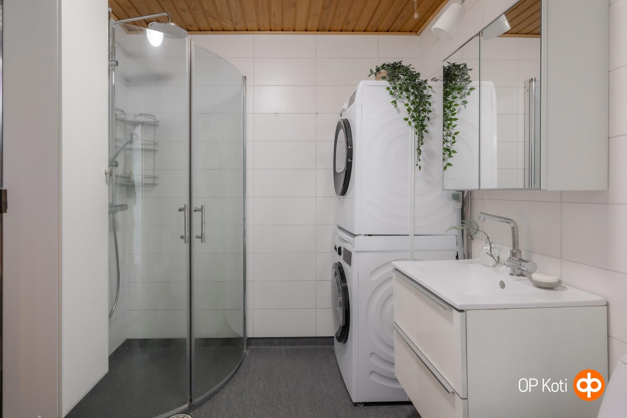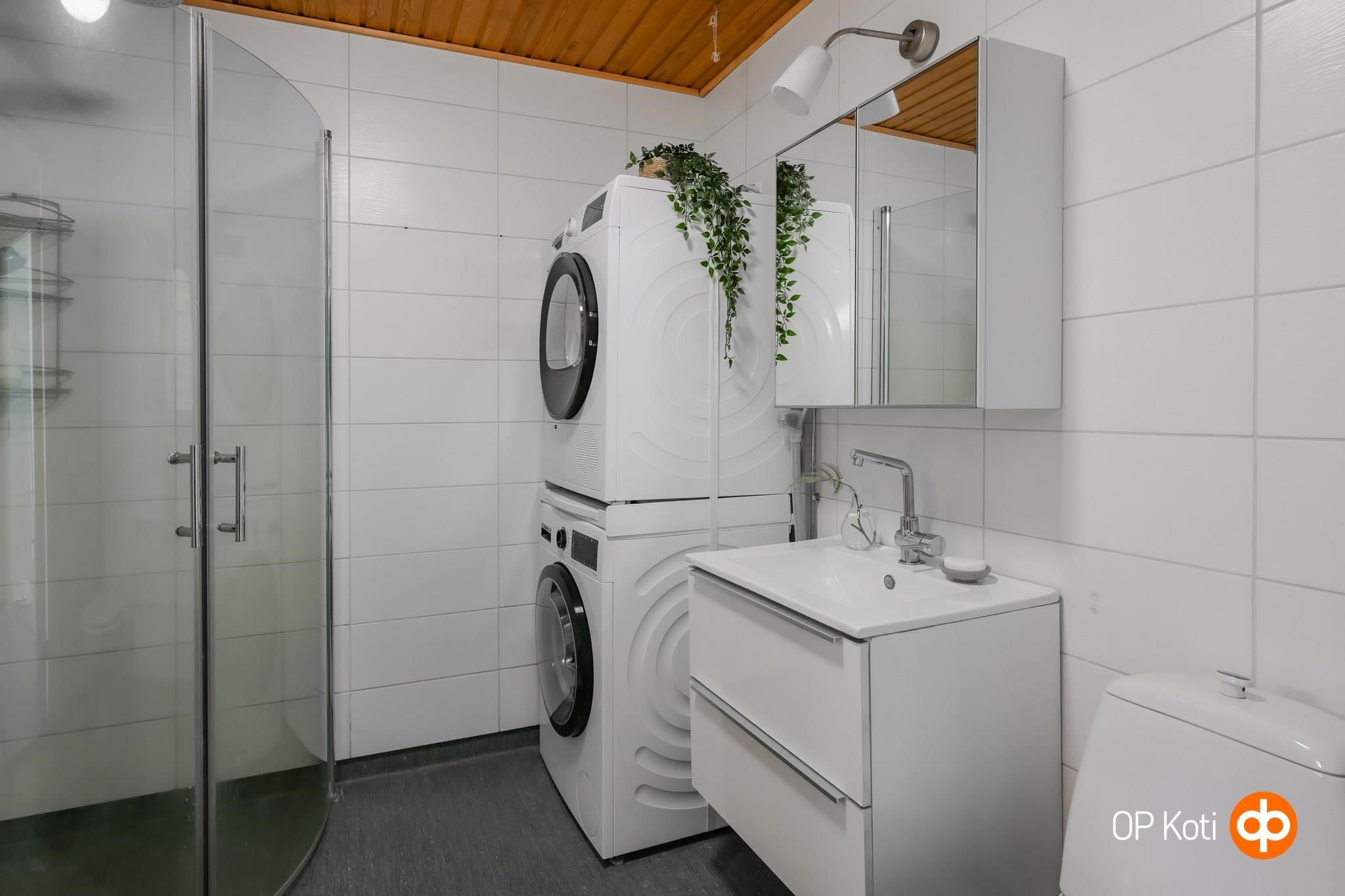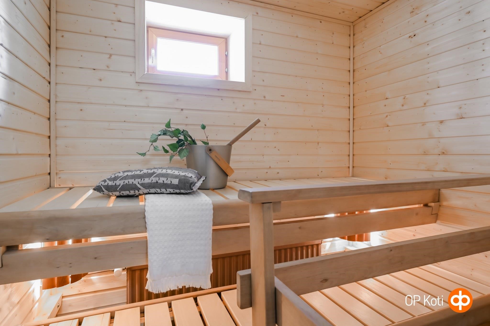 - Sauna, sähkökiuas, kylpyhuone, erillinen wc, suihku, suihkuseinä, peilit WC:ssä, peilikaappi Kylpyhuoneessa, allaskaappi WC:ssä, pesukoneliitäntä, kiinteät valaisimet.