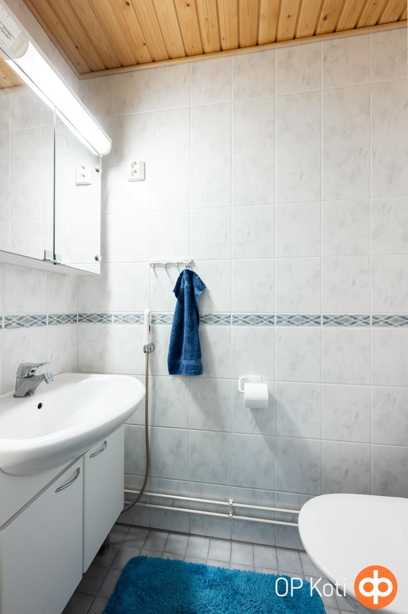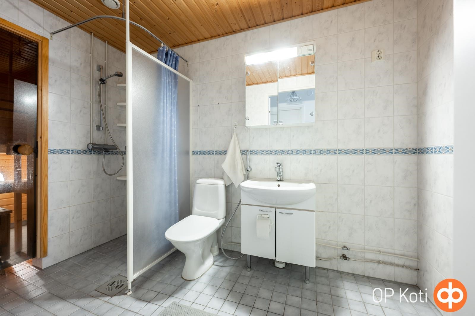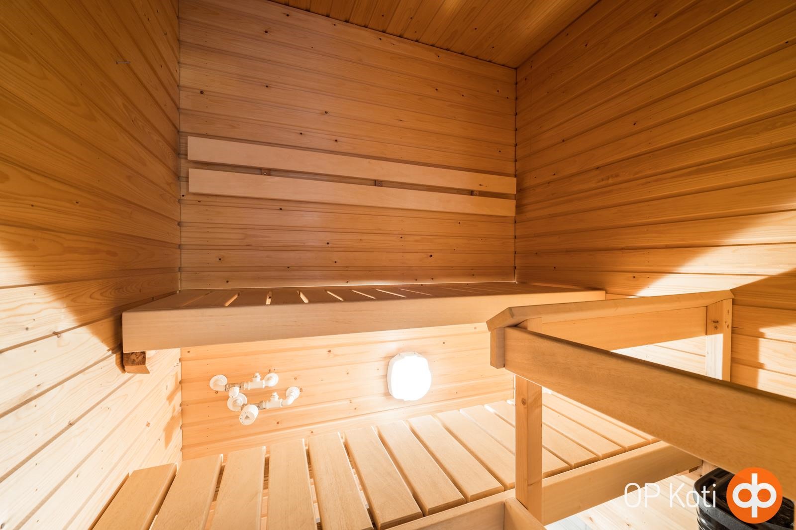 - Sauna, sähkökiuas, kylpyhuone, erillinen wc, suihku, peilikaappi, allaskaappi, pesukoneliitäntä.
