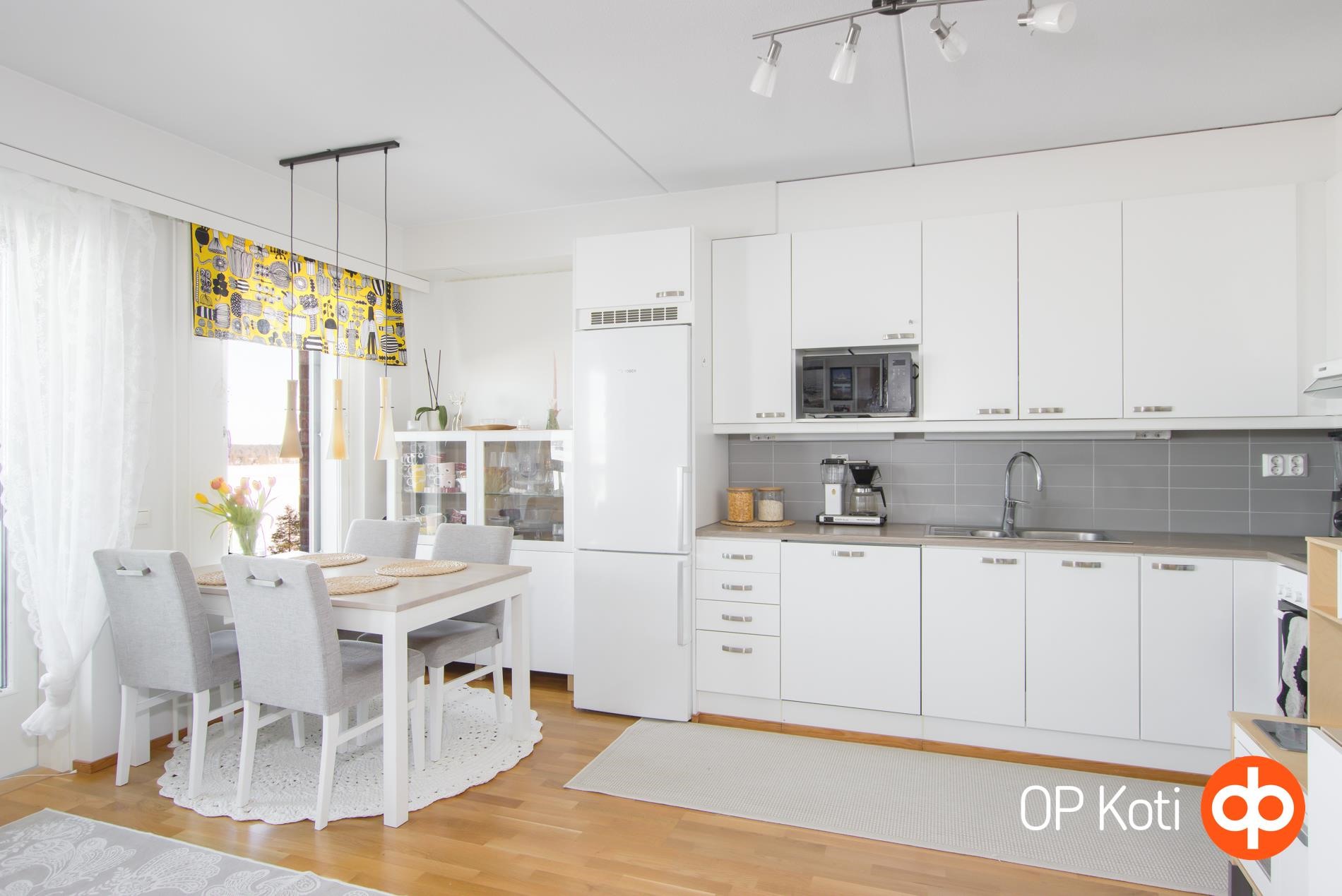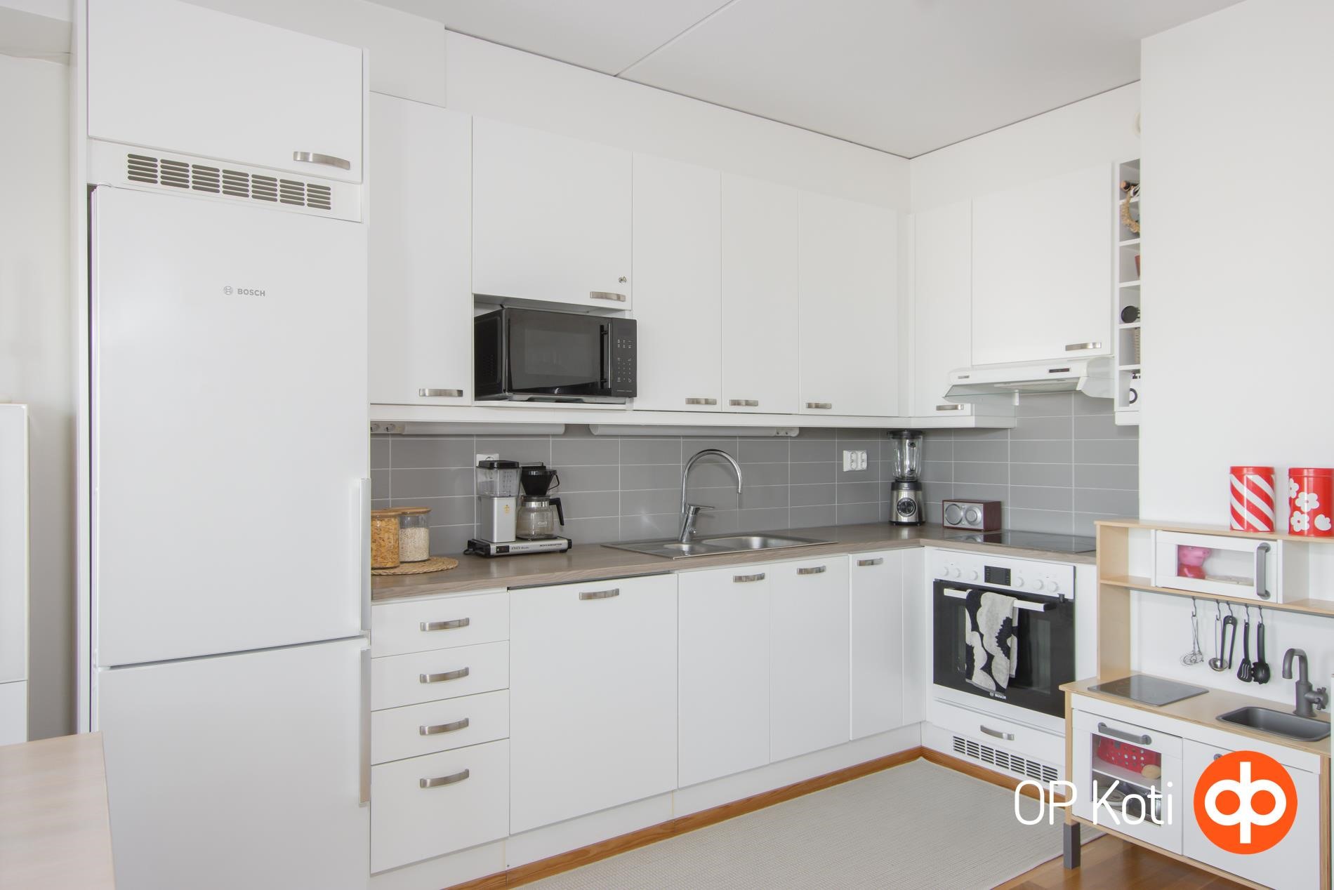 - Jääkaappipakastin, erillisuuni, keraaminen liesi, liesituuletin, astianpesukone, kaapistot, kiinteät valaisimet.