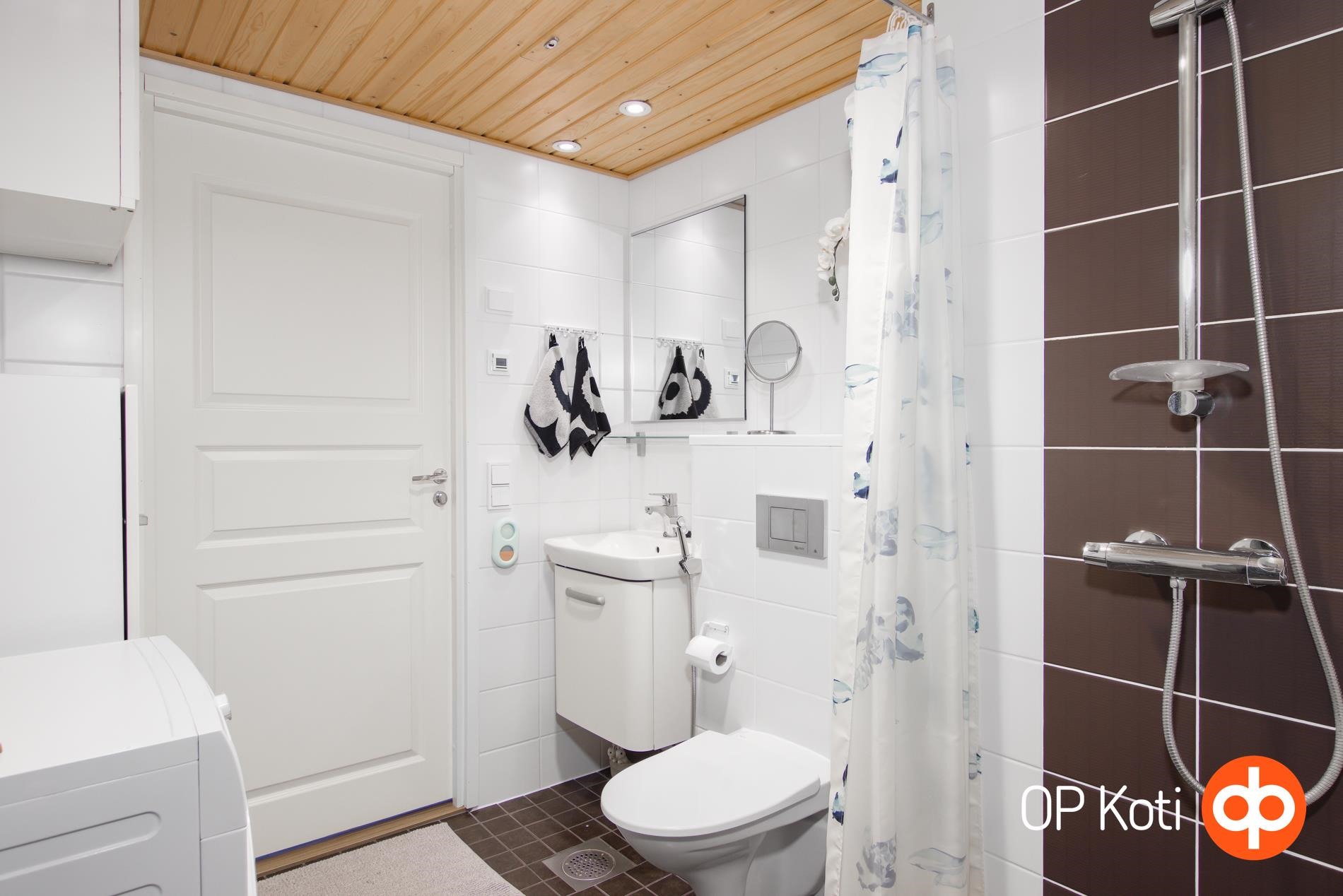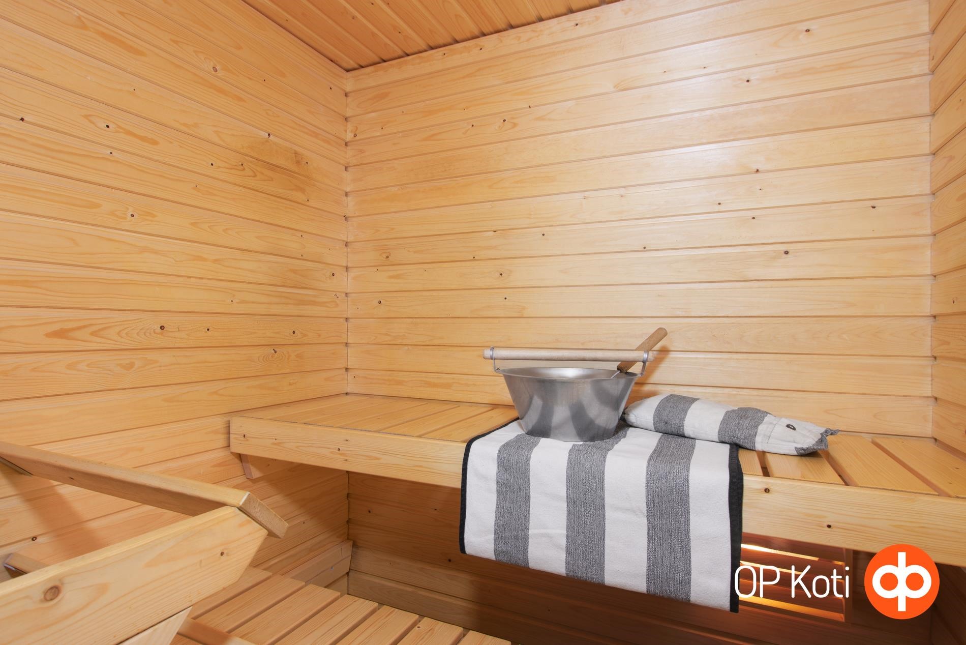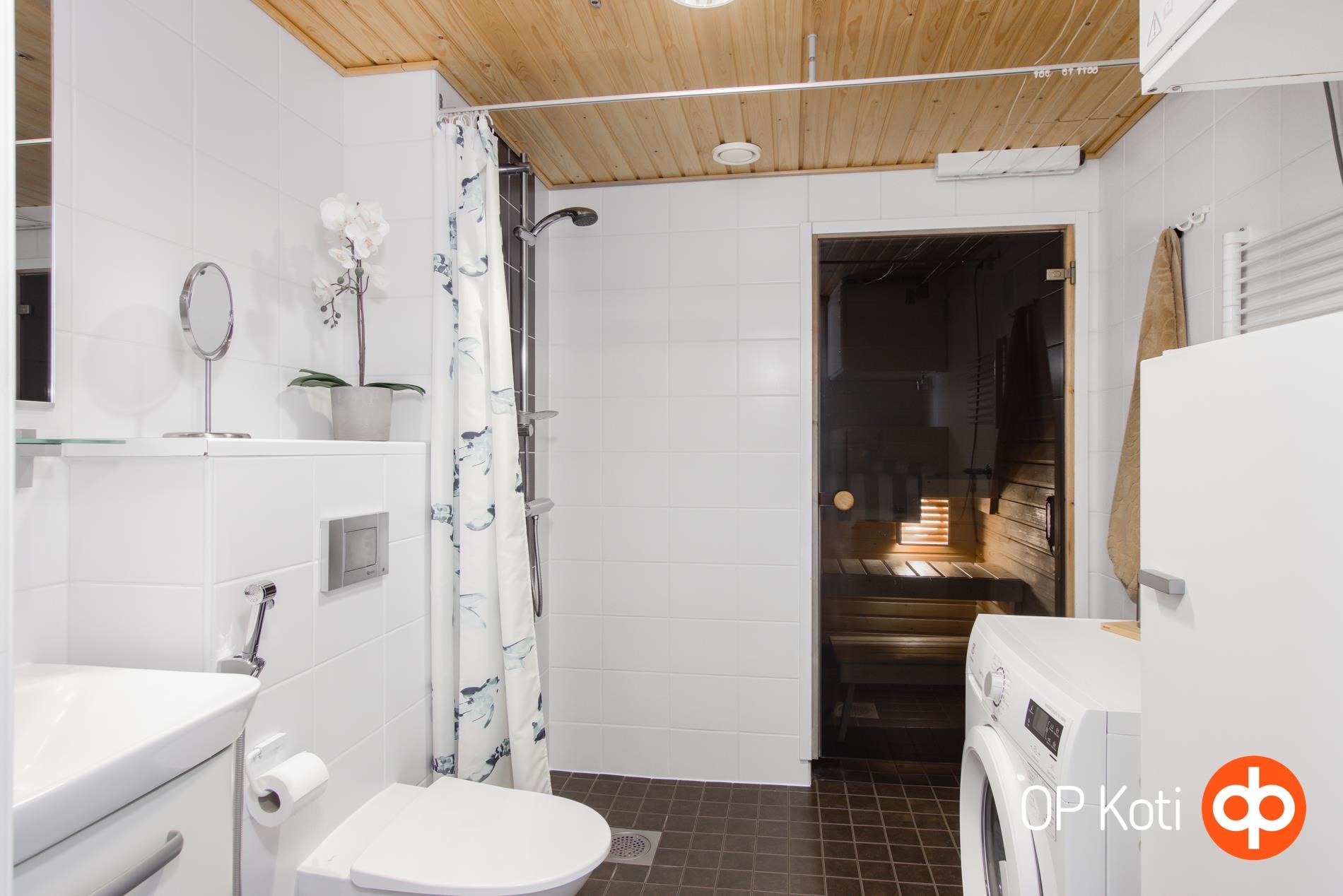 - Sauna, sähkökiuas, kylpyhuone, suihku, peilit, allaskaappi, pesukoneliitäntä, lattialämmitys sähköinen, kiinteät valaisimet.