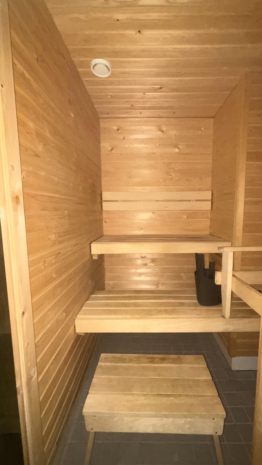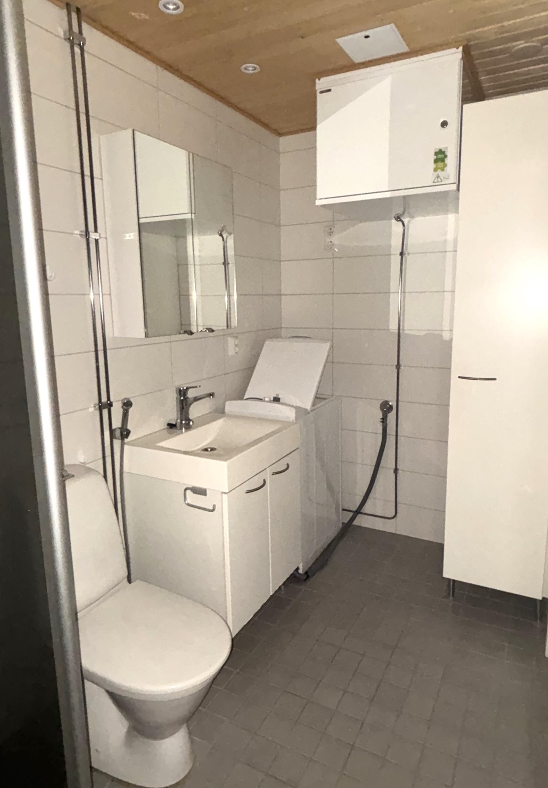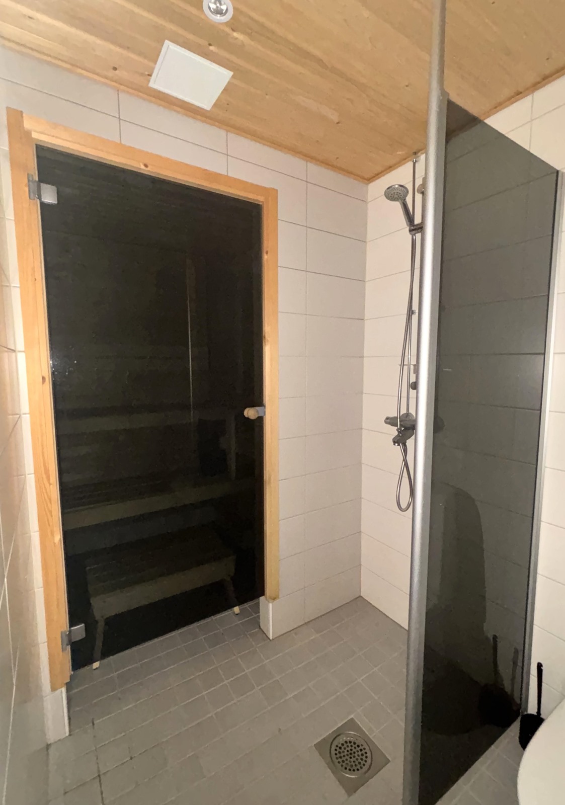 - Sauna, sähkökiuas, kylpyhuone, suihku, suihkuseinä, peilikaappi, allaskaappi, pesukoneliitäntä, lattialämmitys, kiinteät valaisimet.