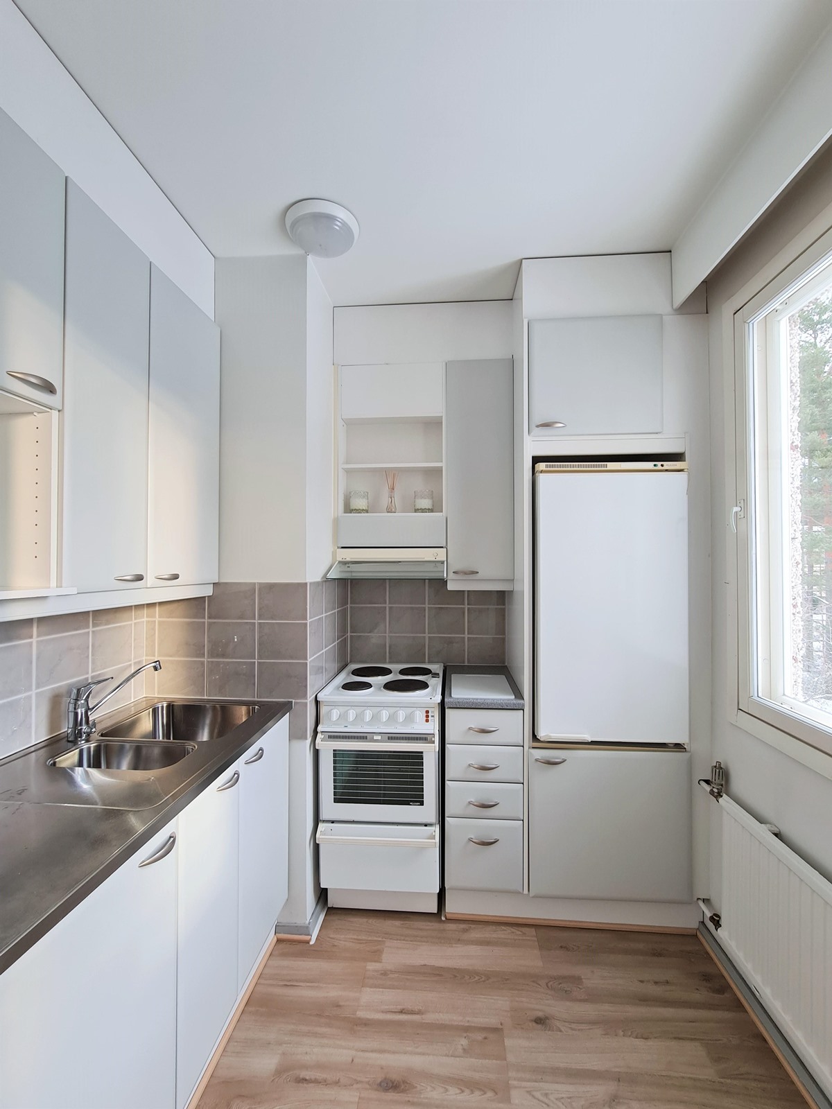 - Jääkaappi, lattialiesi, liesituuletin, kaapistot, kiinteät valaisimet.