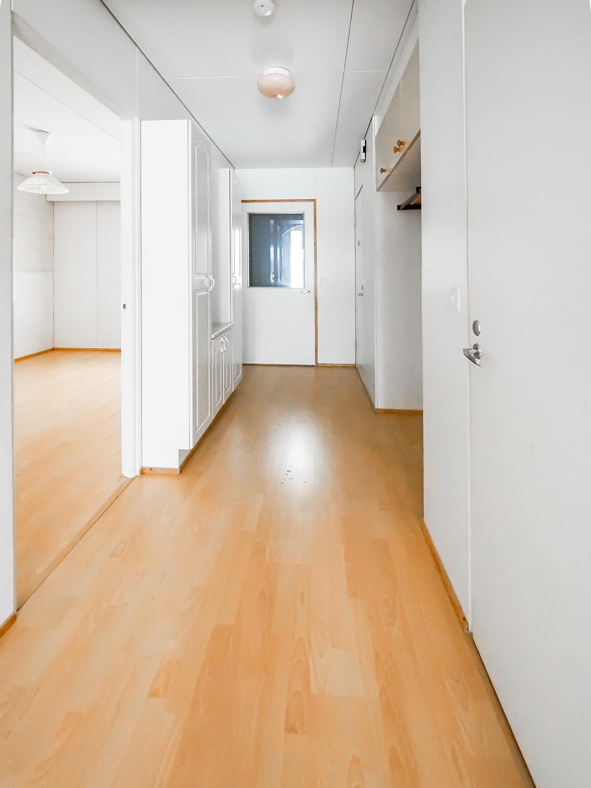 Keittiö: Laminaattilattia, seinät maalattu/puolipaneeli. Olohuone: Laminaattilattia, seinät maalattu. Makuuhuone 1: Laminaattilattia, seinät maalattu/tapetoitu. Sauna: Lattia kaakeloitu, seinät paneloitu. Kylpyhuone: Kaakeloitu. Eteinen: Laminaattilattia, seinät maalattu.