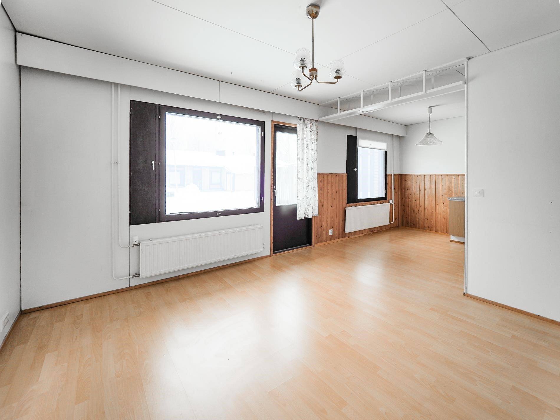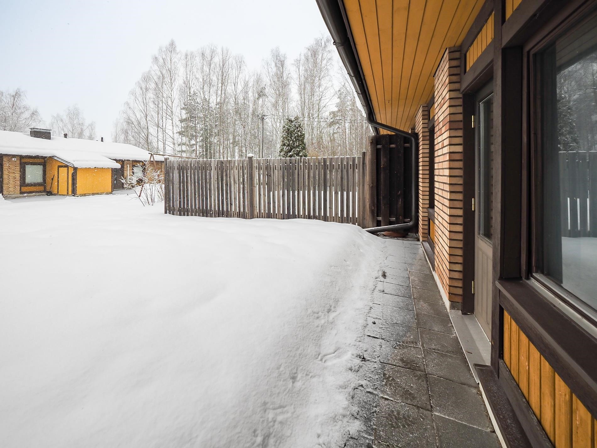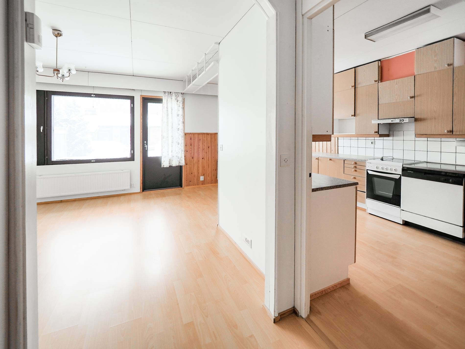 Kodissa on makuuhuone, olohuone, keittiö ja ruokailutila sekä pesuhuone ja sauna. Huoneet ovat tilavia ja iso vaatehuone tarjoaa reilusti säilytystilaa. Olohuoneesta on käynti takapihalle ja ulkovarasto löytyy etupihalta. Mikäli omistat auton voit säilyttää sitä autokatoksessa.