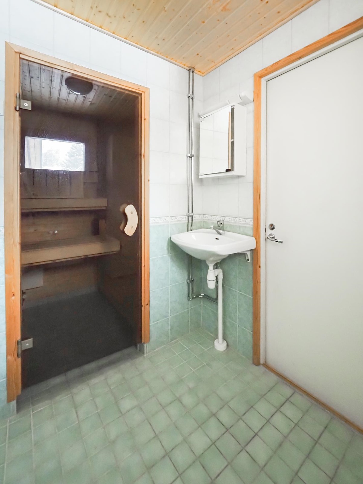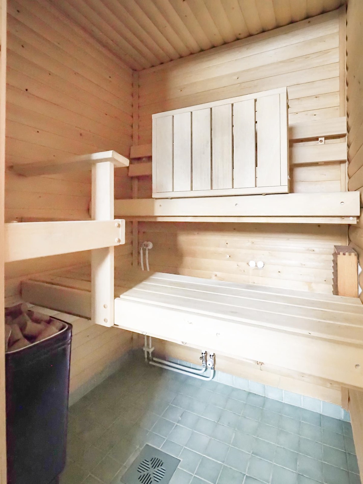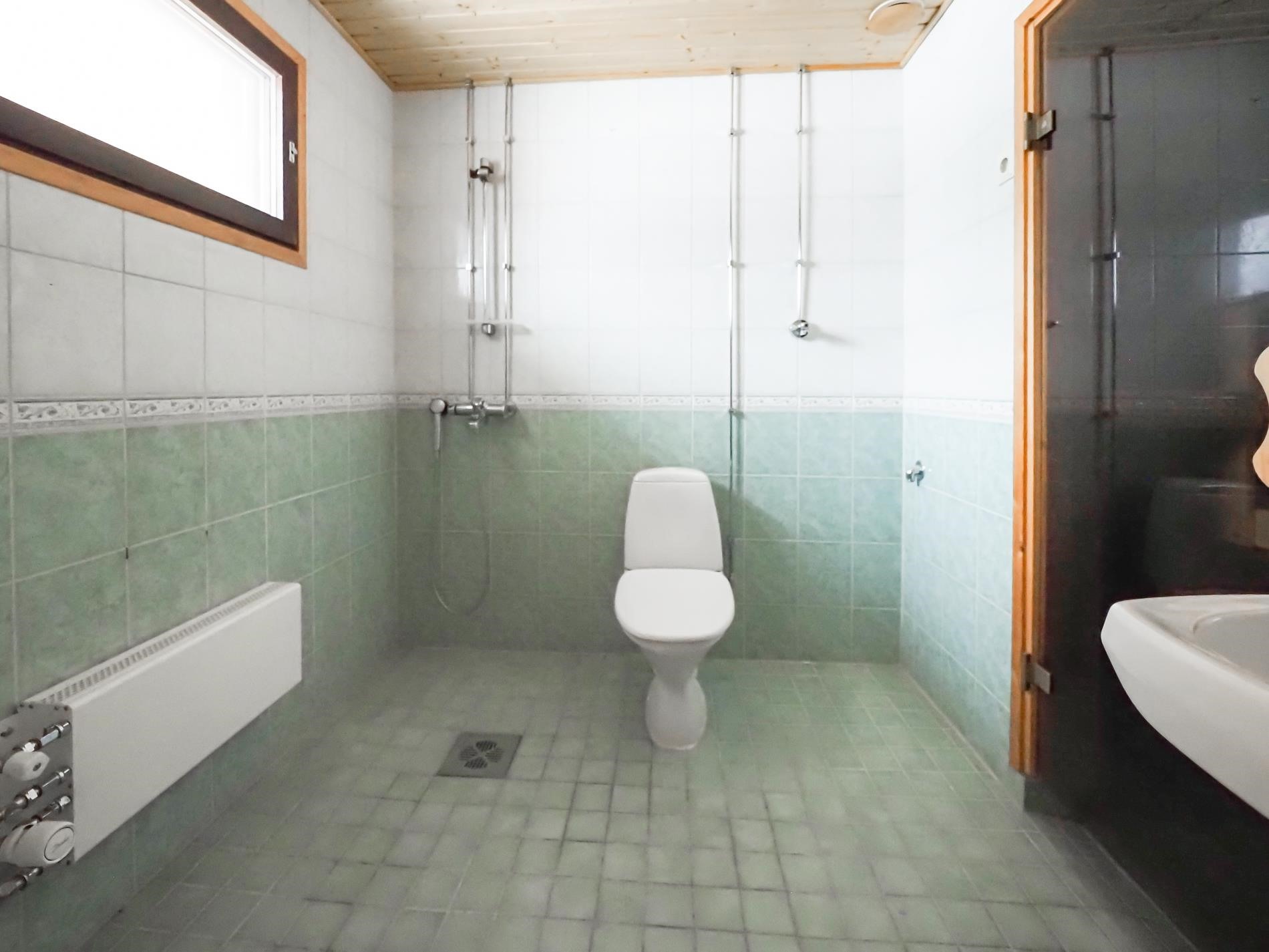 - Sauna, sähkökiuas, kylpyhuone, suihku, peilikaappi, pesukoneliitäntä, lattialämmitys, kiinteät valaisimet.