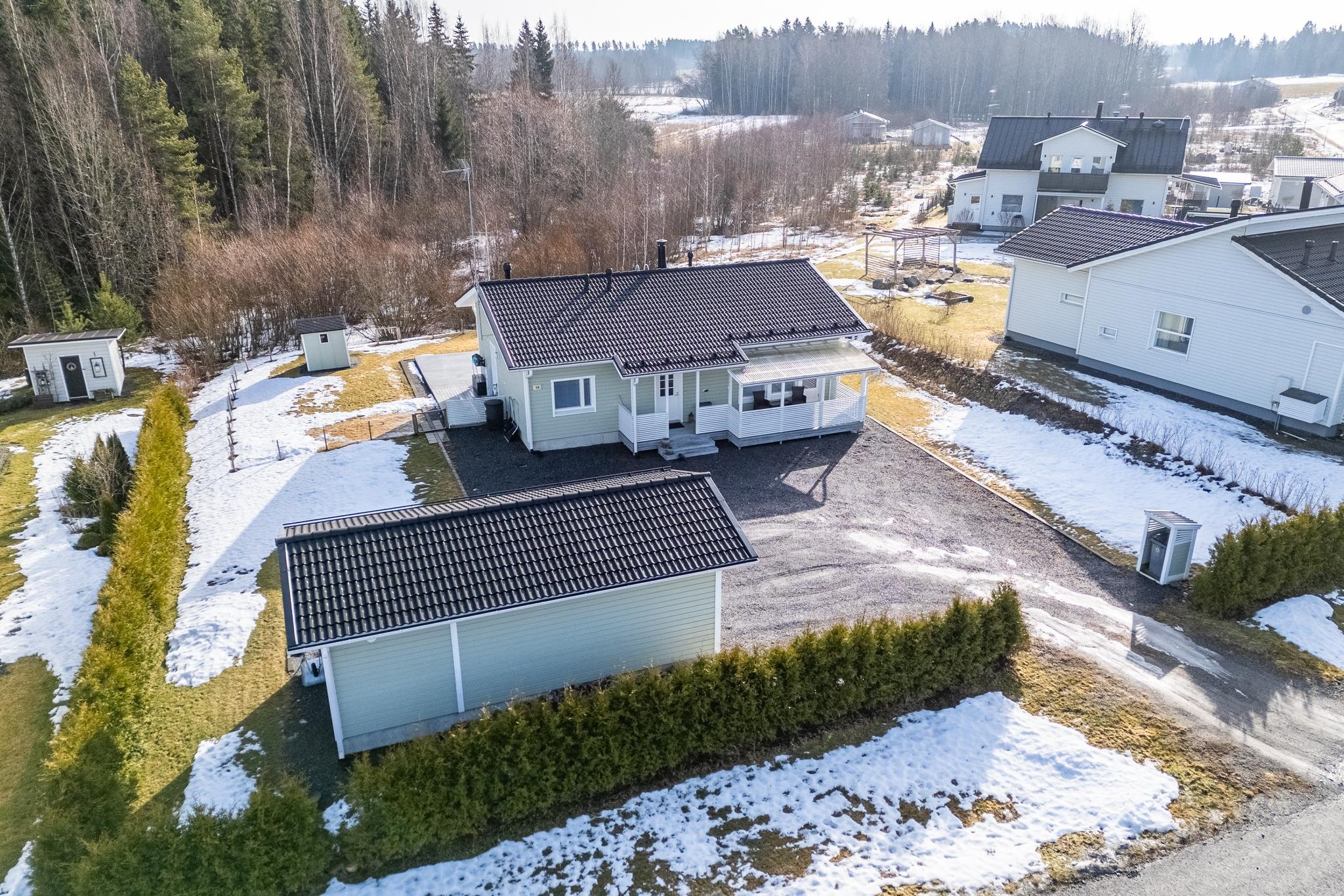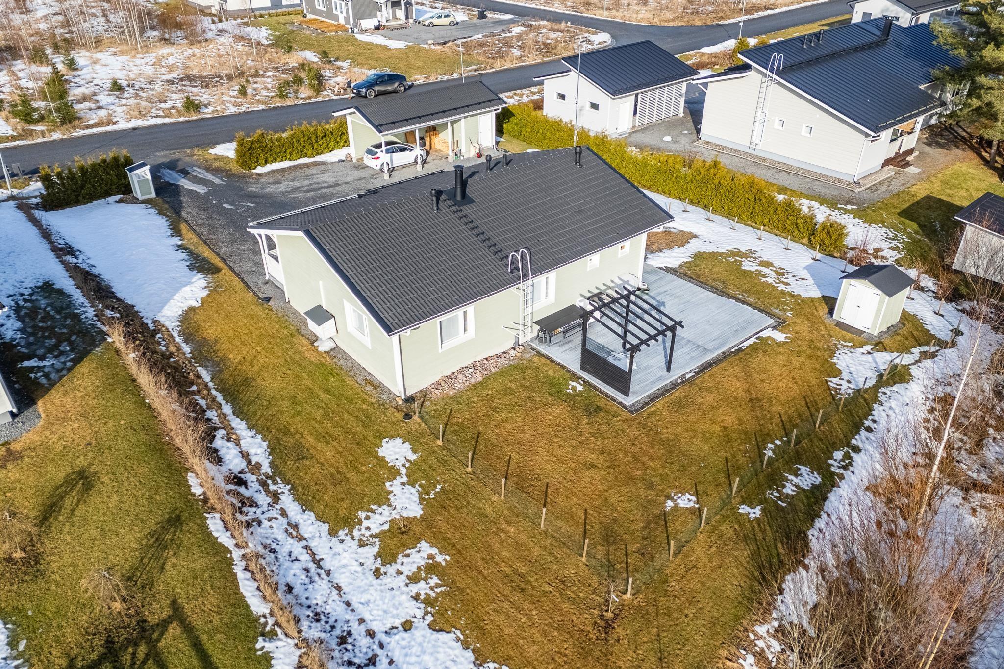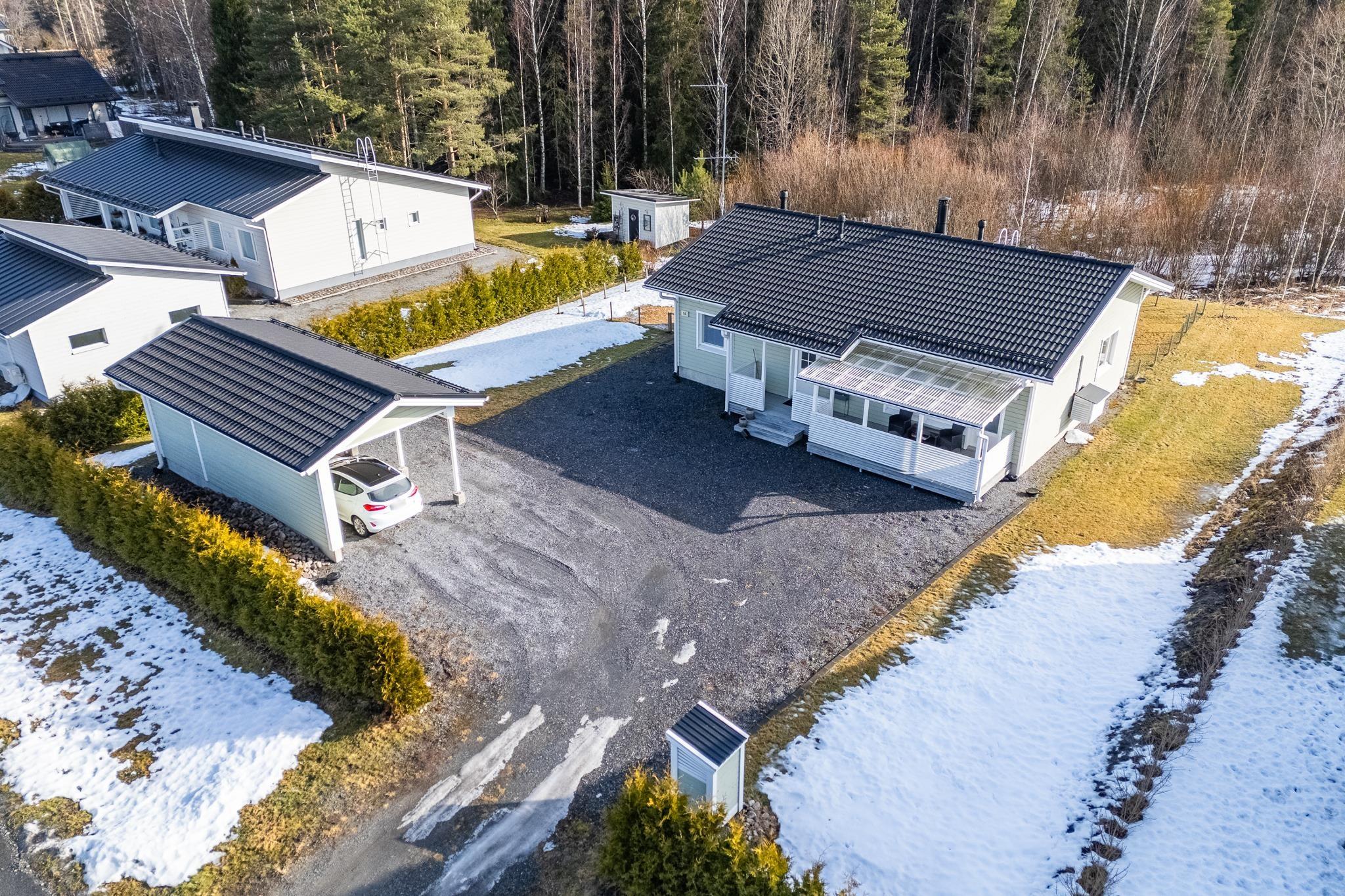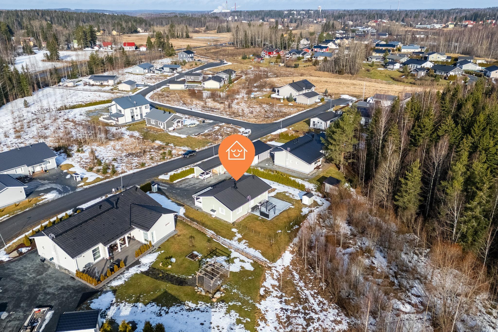 Tervetuloa tutustumaan tähän vuonna 2018 valmistuneeseen kotiin, joka todella ihastuttaa valoisuudellaan, skandinaavisella ilmeellään ja kauneudellaan. Kodin pohjaratkaisu on suunniteltu arkeen toimivaksi ja tilat on jaettu selkeästi. Oleskelutiloissa on kauniit, vaaleat pinnat jotka korostavat tilan valoisuutta entisestään. Keittiö, ruokailutila ja olohuone muodostavatkin täydellisen kokonaisuuden perheen ja ystävien yhteisiin hetkiin! Tunnelmaa ja lisälämpöä oleskelutilaan tuo varaava takka. Kodinhoitotilat tarjoavat hyvät puitteet niin pyykkihuollolle kuin muulle kodinhoidolle. Lisäksi tila toimii erinomaisesti esimerkiksi koiraperheelle, sillä tilasta on oma käynti aidatulle piha-alueelle. Pihassa lisäksi autokatos ulkovarastolla, sekä taloa koristaa terassit etu- sekä takapihalla. Takapiha on aidattu ja tontti rajautuu takapihalta taajamametsään.