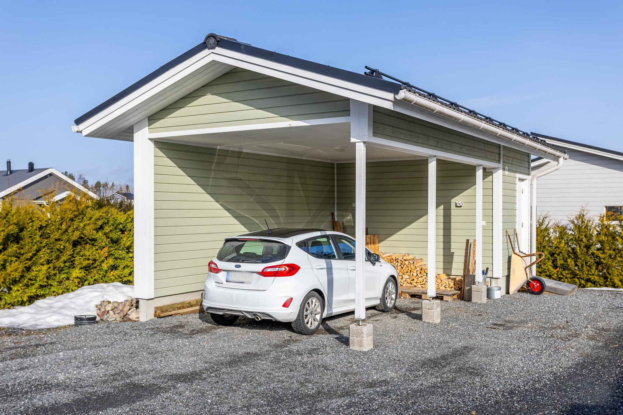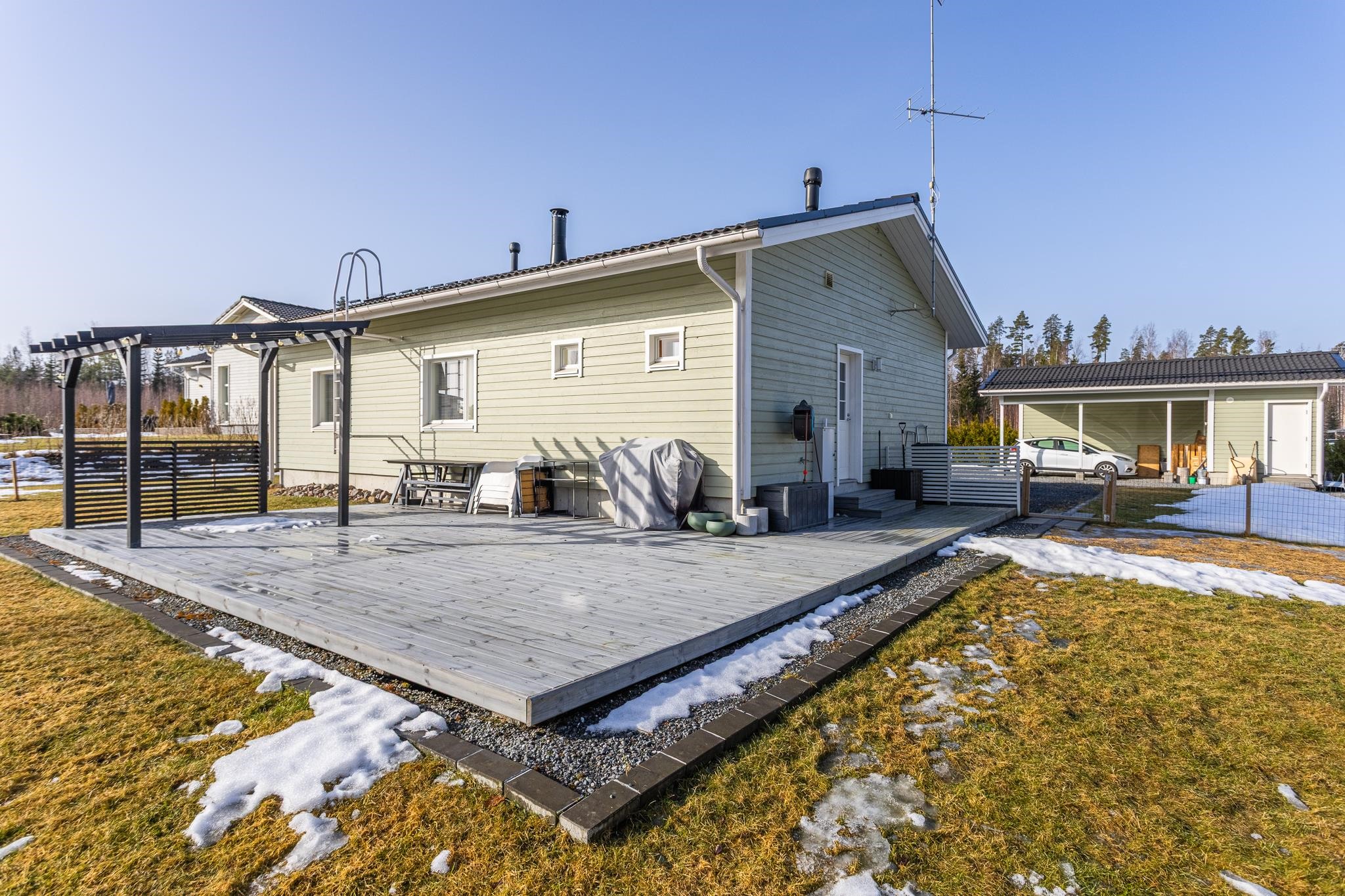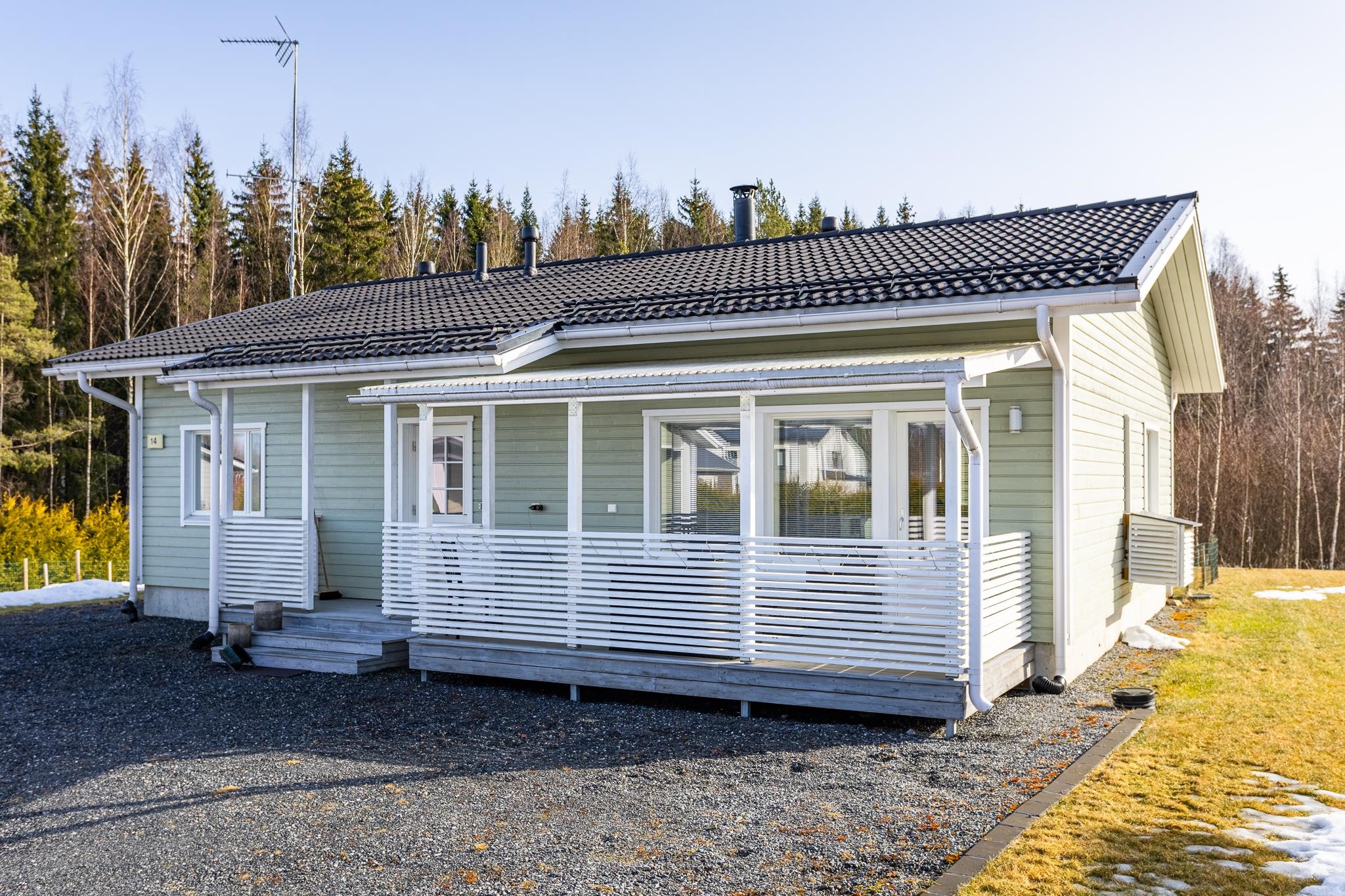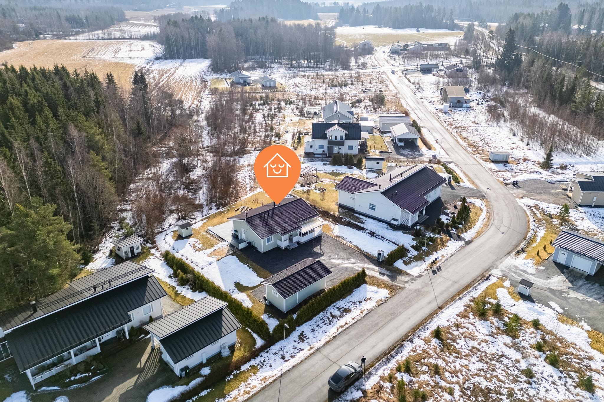 Tervetuloa tutustumaan tähän vuonna 2018 valmistuneeseen kotiin, joka todella ihastuttaa valoisuudellaan, skandinaavisella ilmeellään ja kauneudellaan. Kodin pohjaratkaisu on suunniteltu arkeen toimivaksi ja tilat on jaettu selkeästi. Oleskelutiloissa on kauniit, vaaleat pinnat jotka korostavat tilan valoisuutta entisestään. Keittiö, ruokailutila ja olohuone muodostavatkin täydellisen kokonaisuuden perheen ja ystävien yhteisiin hetkiin! Tunnelmaa ja lisälämpöä oleskelutilaan tuo varaava takka. Kodinhoitotilat tarjoavat hyvät puitteet niin pyykkihuollolle kuin muulle kodinhoidolle. Lisäksi tila toimii erinomaisesti esimerkiksi koiraperheelle, sillä tilasta on oma käynti aidatulle piha-alueelle. Pihassa lisäksi autokatos ulkovarastolla, sekä taloa koristaa terassit etu- sekä takapihalla. Takapiha on aidattu ja tontti rajautuu takapihalta taajamametsään.
