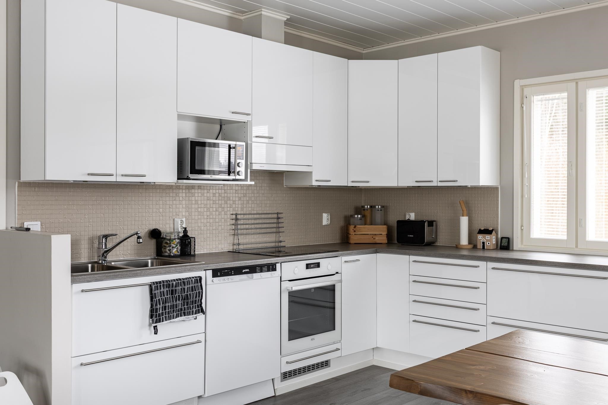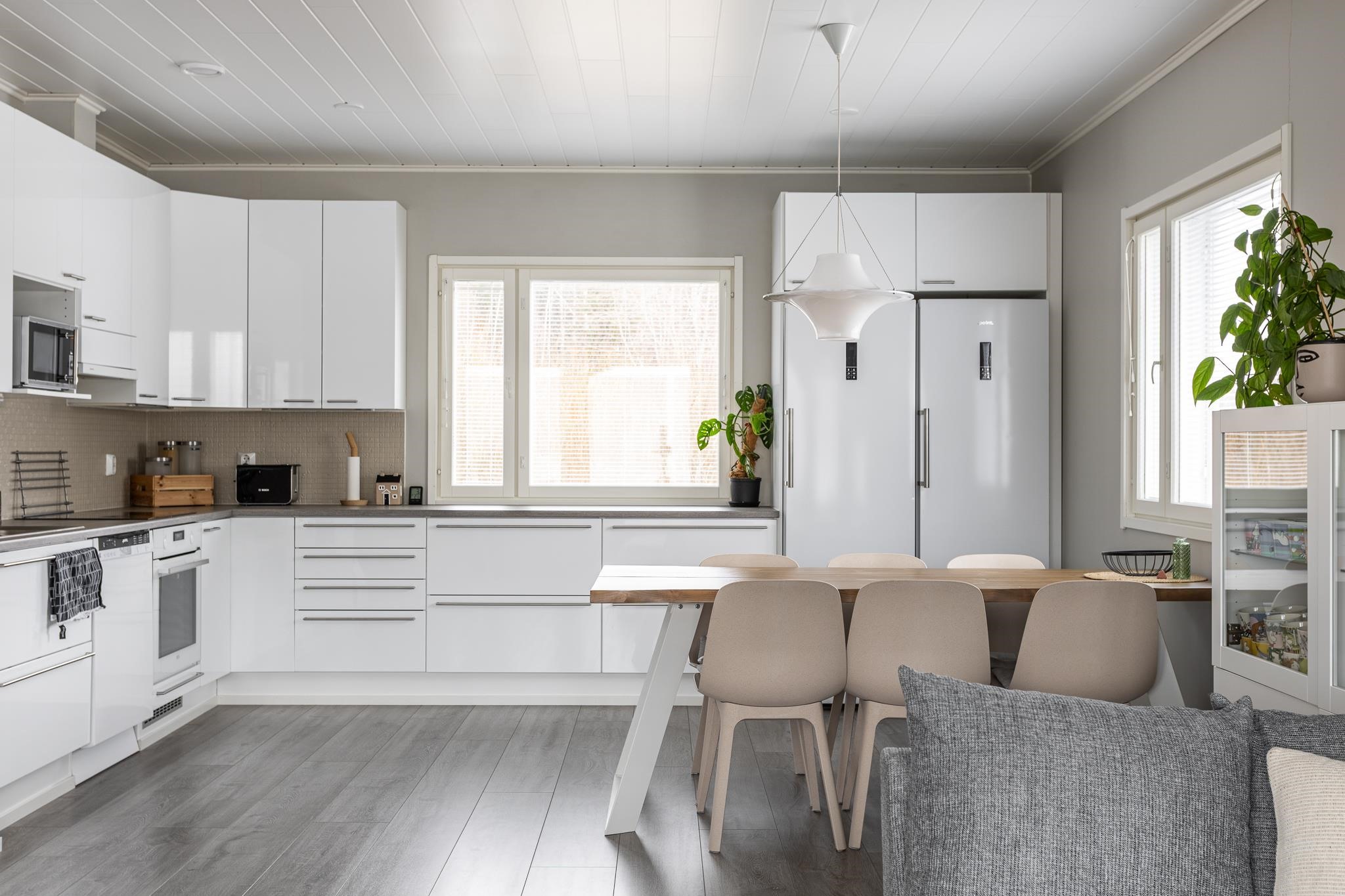 - Jääkaappi, pakastekaappi, erillisuuni, induktioliesi, liesituuletin, astianpesukone, kiinteät valaisimet.