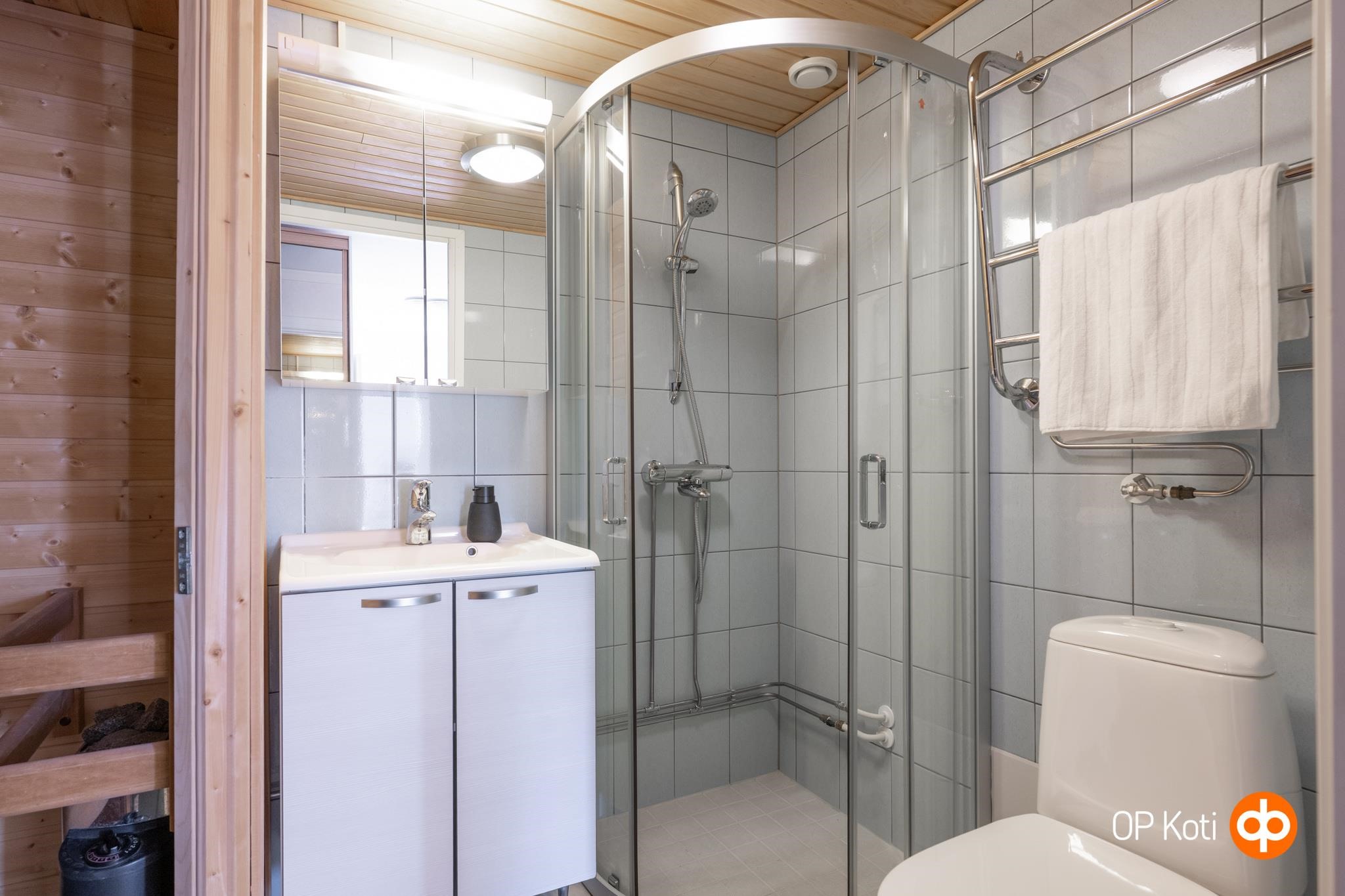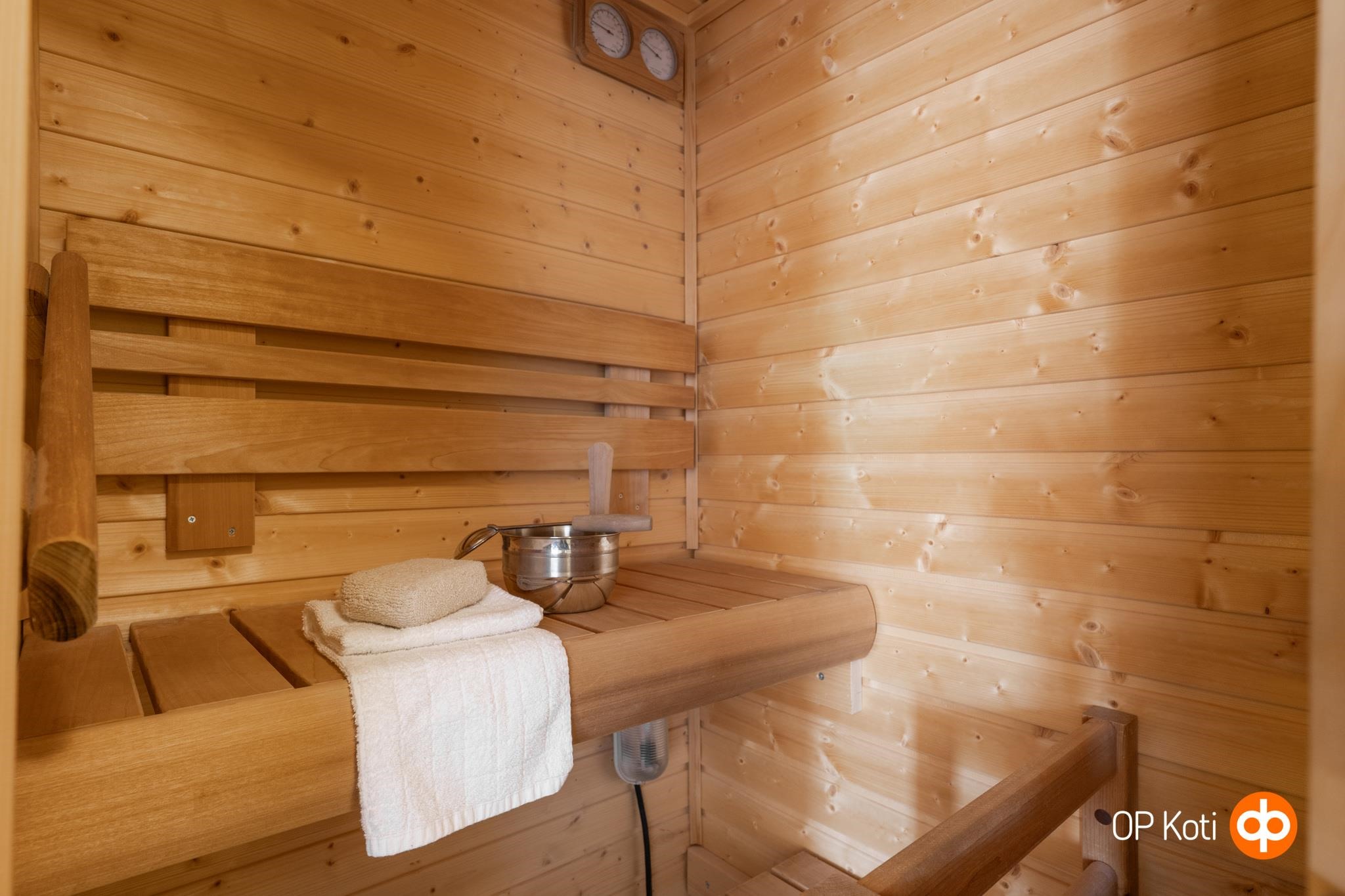- Sauna, sähkökiuas, kylpyhuone, suihkukaappi, peilikaappi, allaskaappi, pesukoneliitäntä, kiinteät valaisimet. Viemärit uusittu?