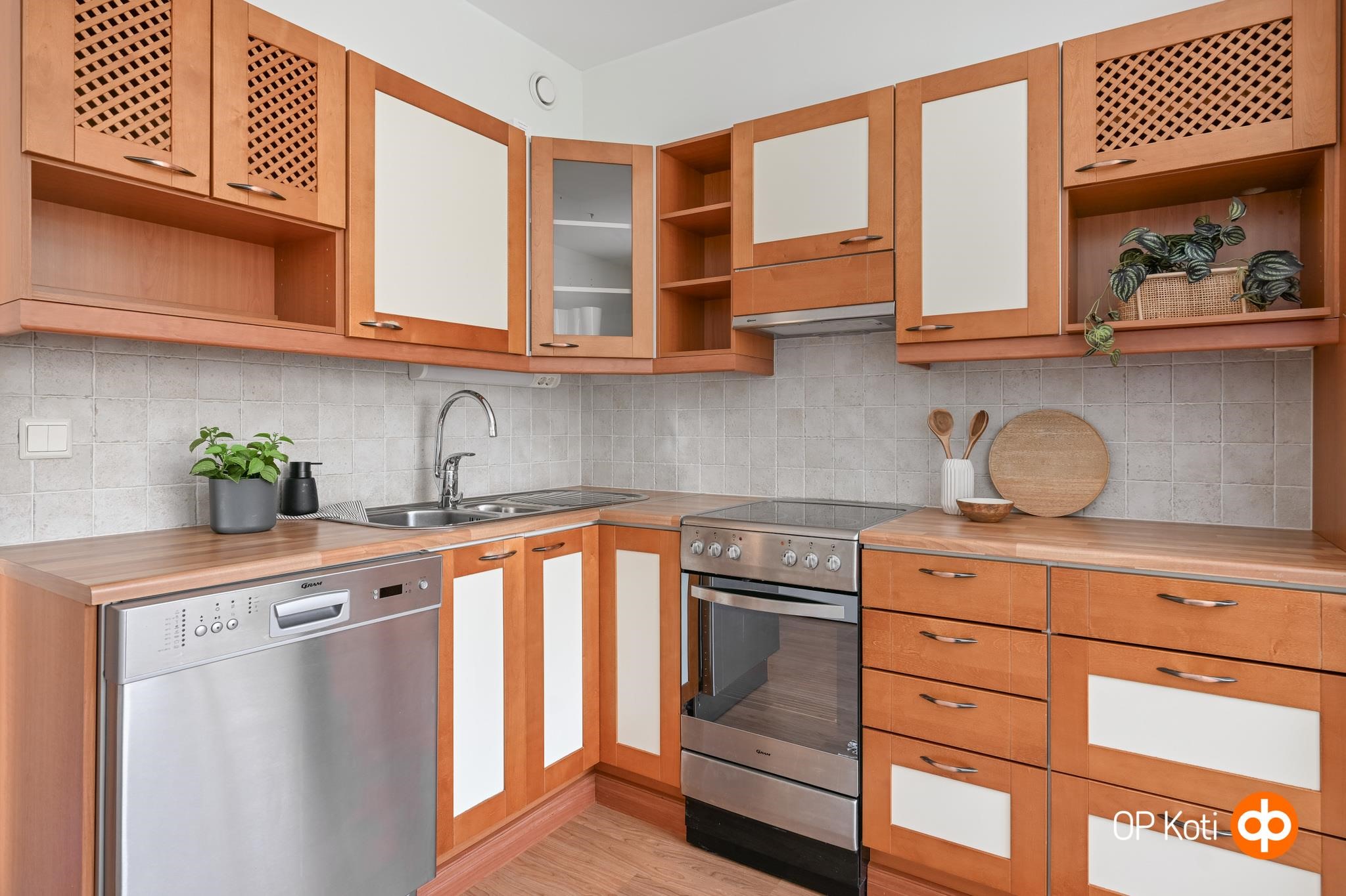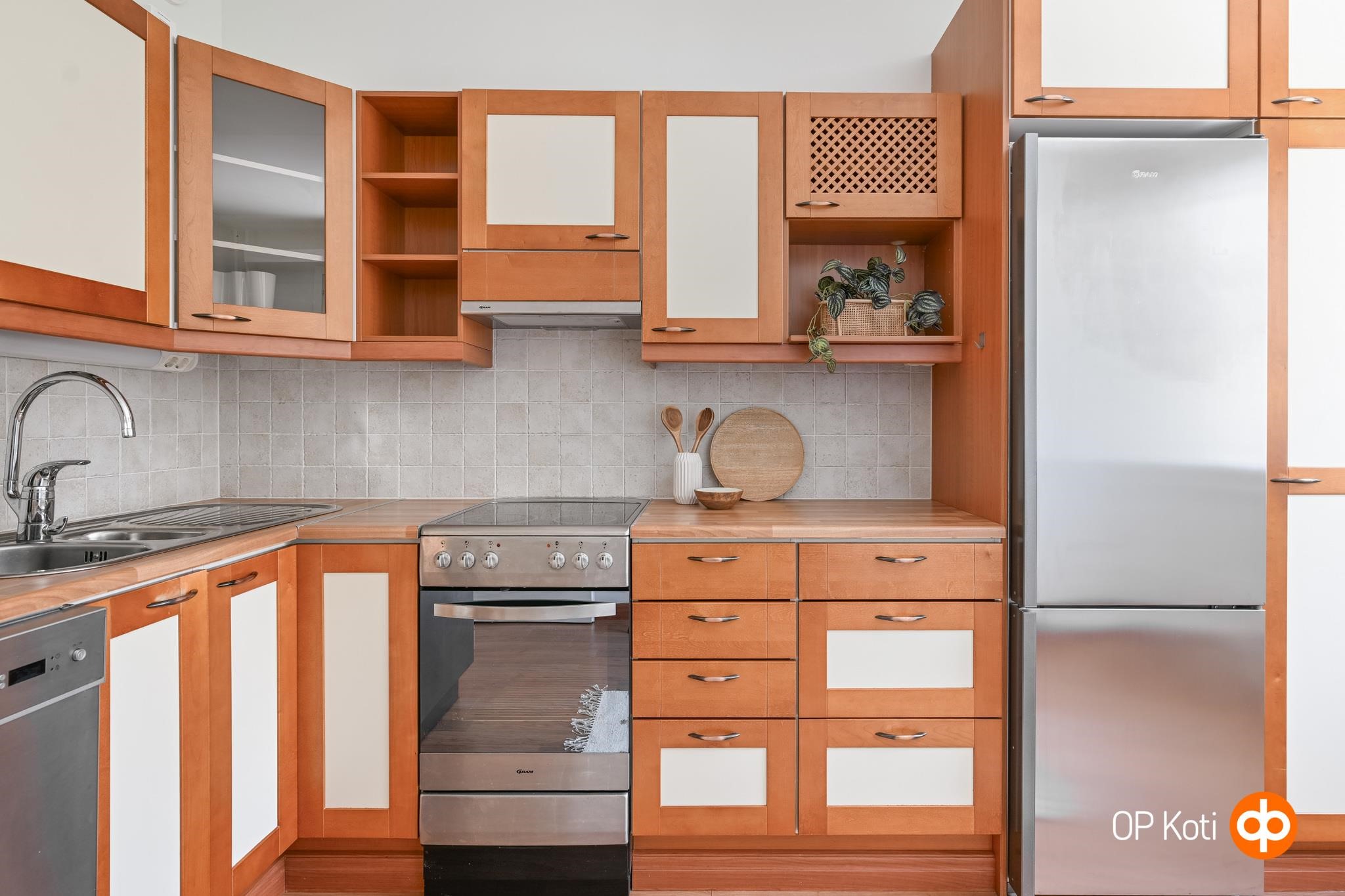 - Jääkaappipakastin, sähköliesi, liesituuletin, astianpesukone, kaapistot, kiinteät valaisimet.