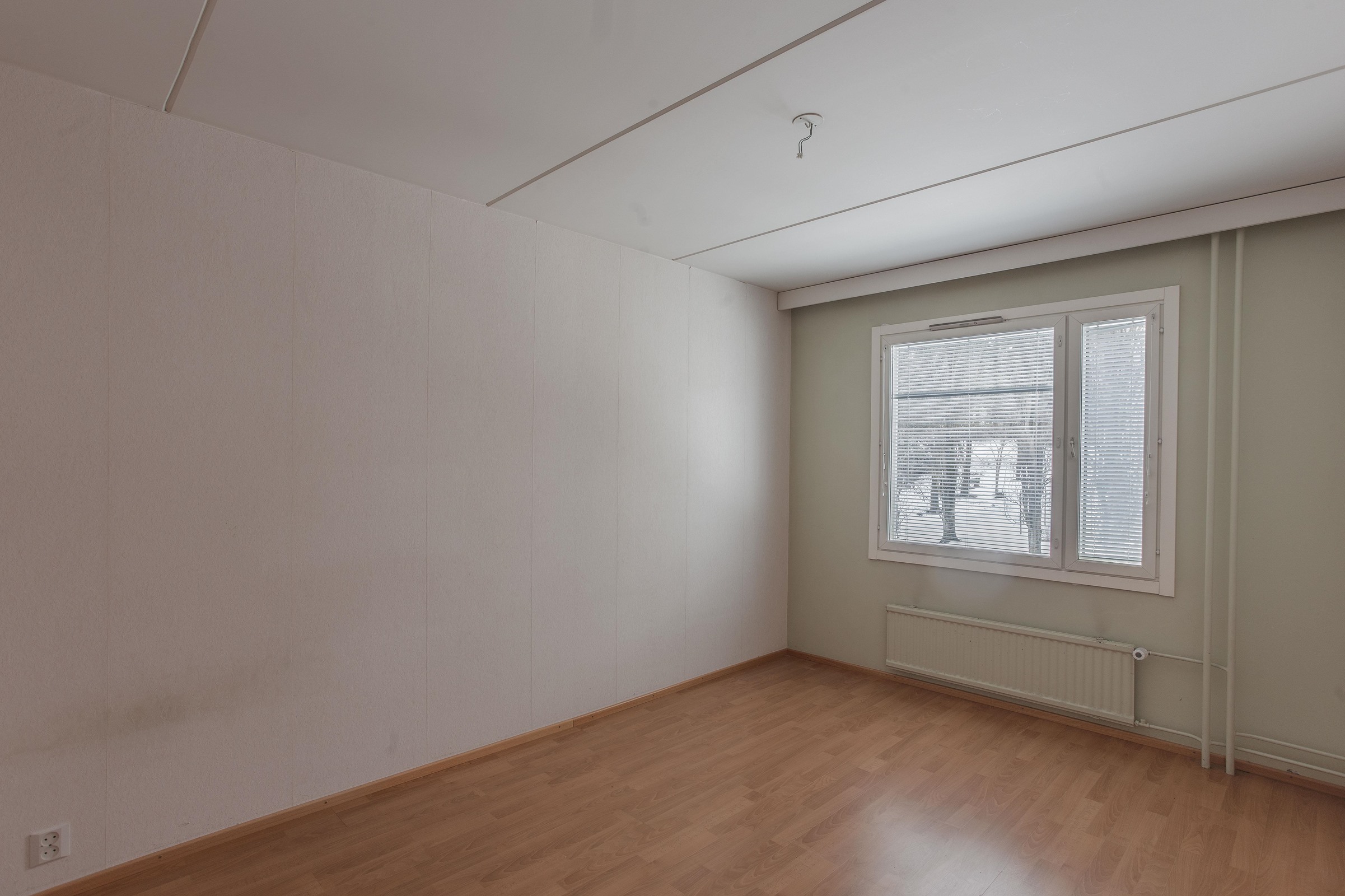 Keittiö: maali ja laminaattilattia. Olohuone: tapetti ja laminaattilattia. Makuuhuone 1: tapetti ja laminaattilattia. Kylpyhuone: kaakeli ja laattalattia. Eteinen: maali ja laminaattilattia.