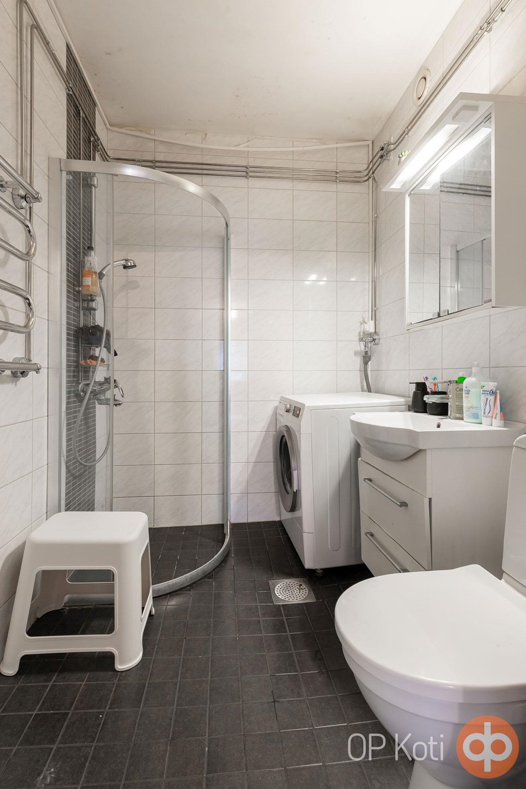 - Kylpyhuone, suihku, peilikaappi, allaskaappi, pesukoneliitäntä, kiinteät valaisimet.