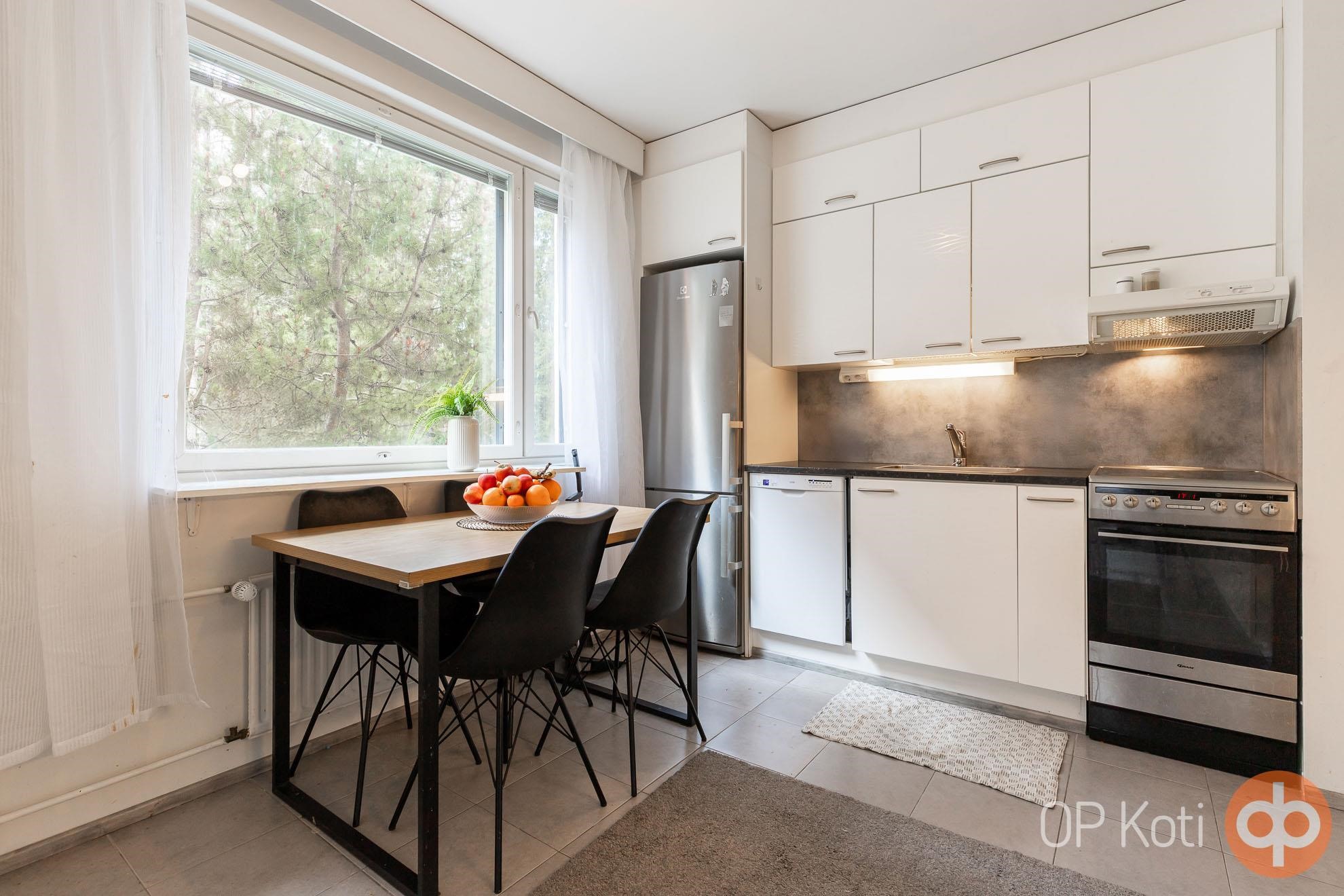 - Jääkaappipakastin, lattialiesi, liesituuletin, kaapistot.