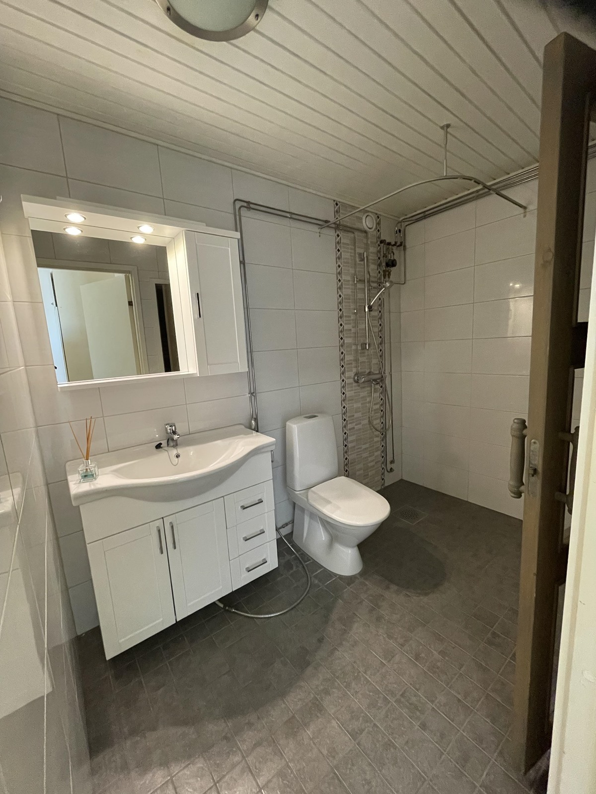 - Sauna, sähkökiuas, kylpyhuone, suihku, peilikaappi, pesukoneliitäntä.