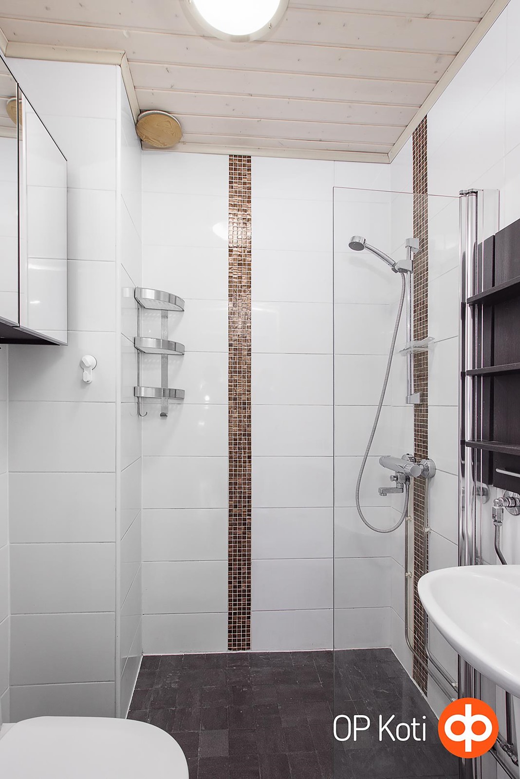 - Kylpyhuone, suihku, suihkuseinä, peilit, peilikaappi, kaapit, pesukoneliitäntä keitiössä, lattialämmitys kylpyhuone sähkö, kiinteät valaisimet.