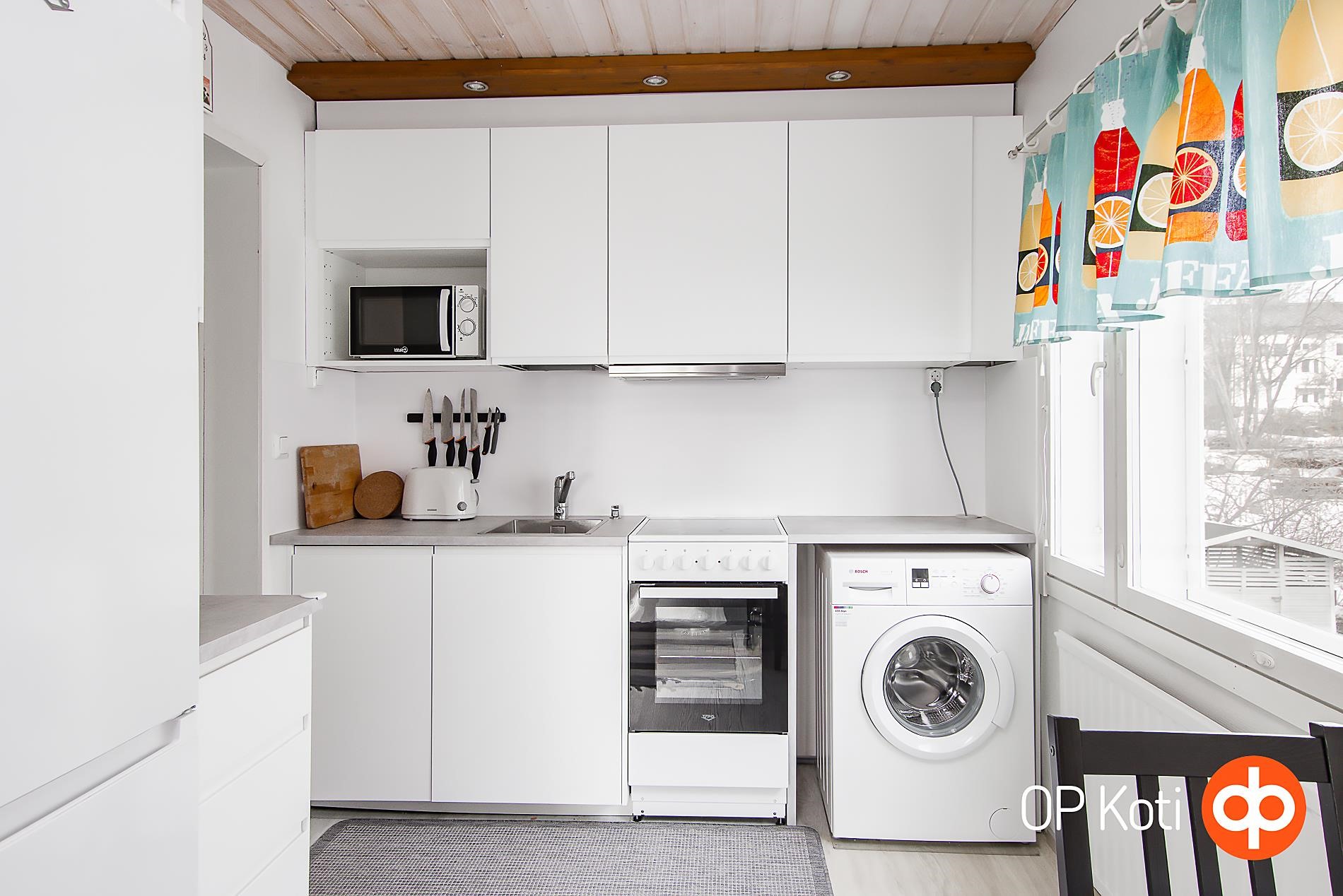 - Jääkaappipakastin, keraaminen liesi, liesituuletin, astianpesukone, kaapistot, kiinteät valaisimet.