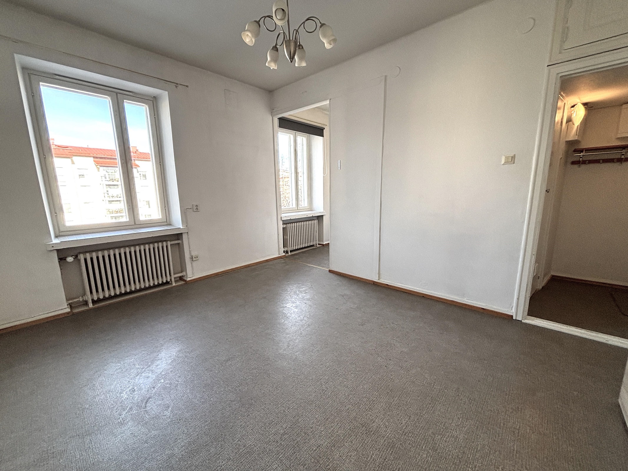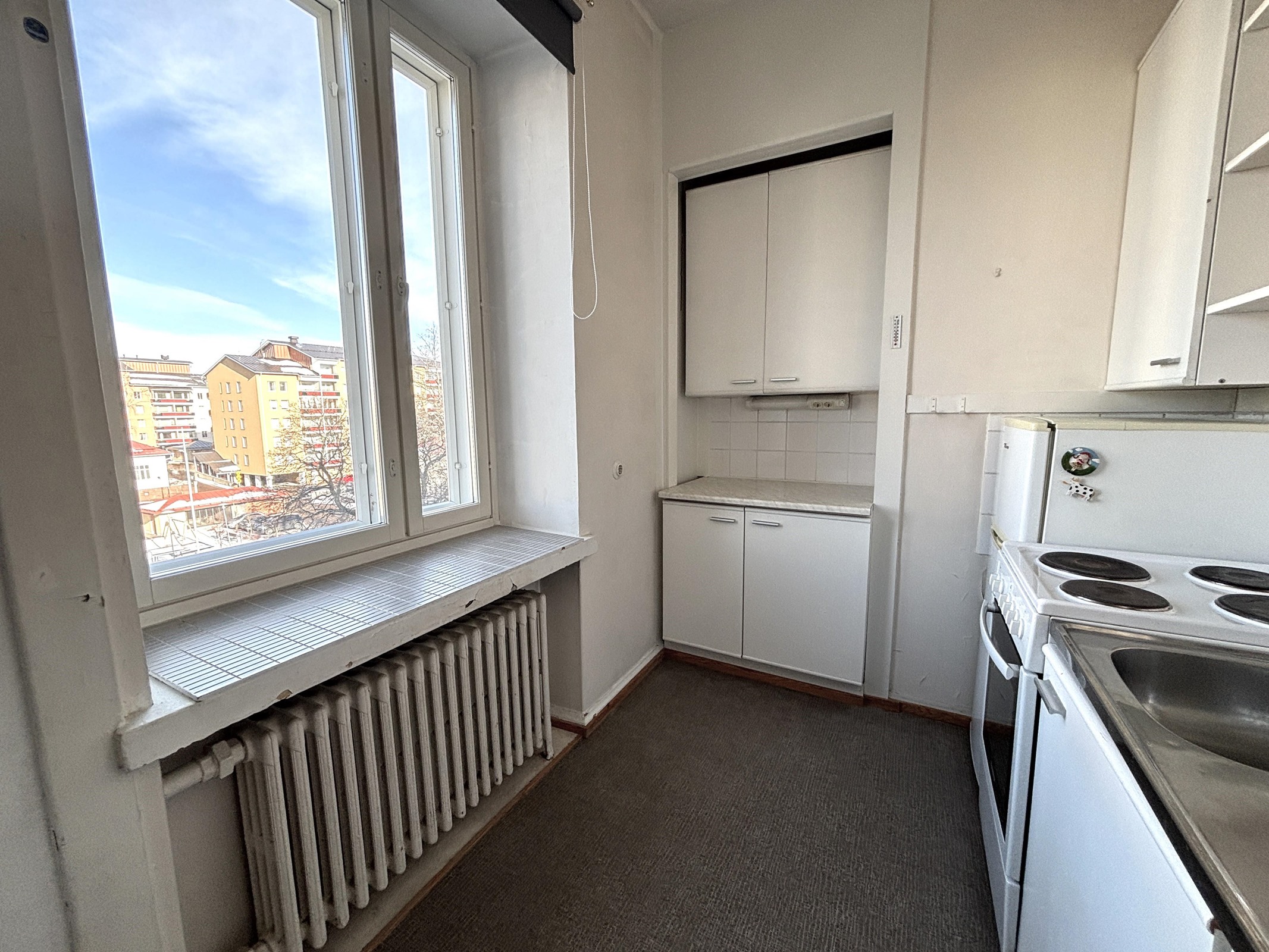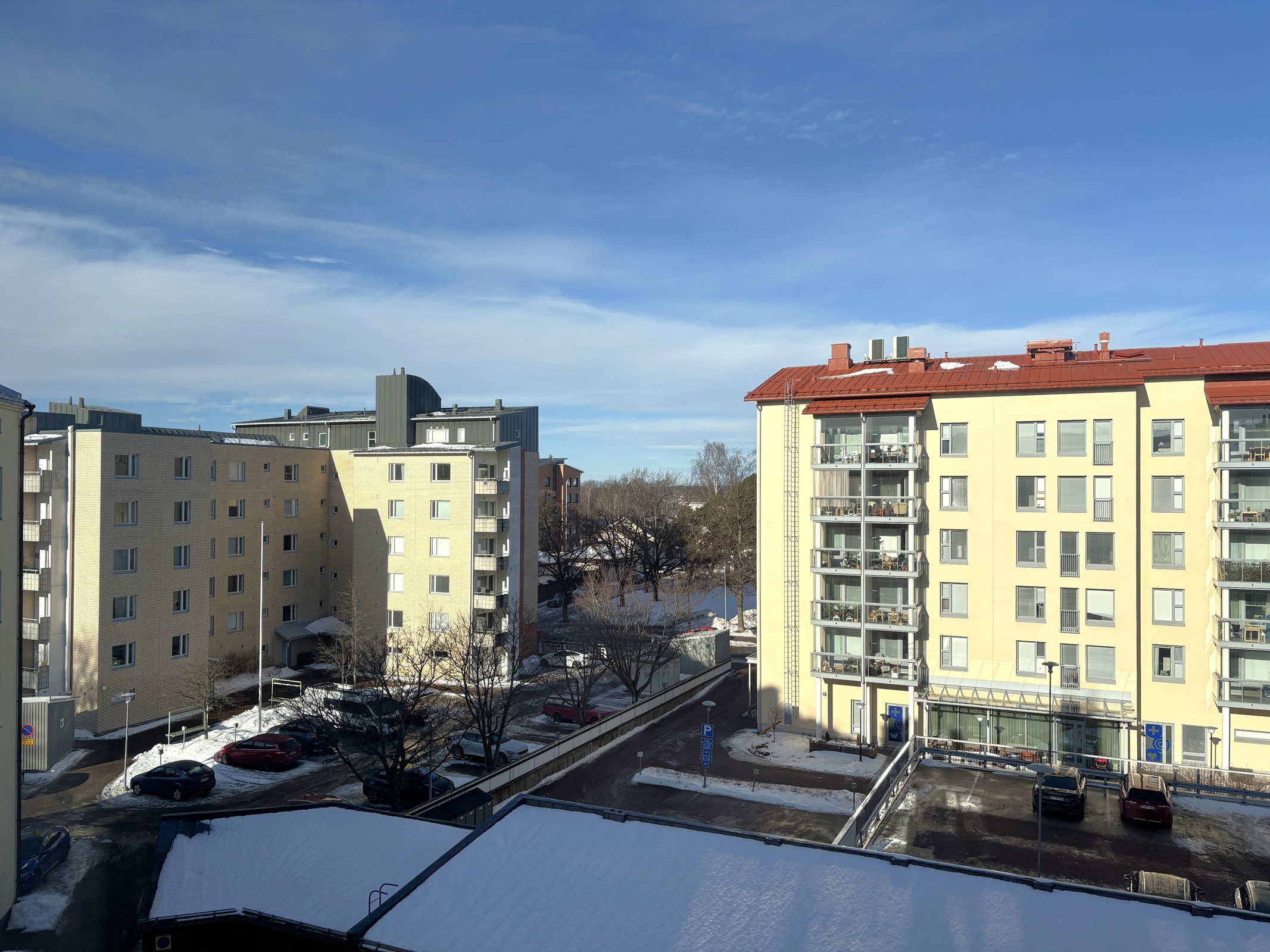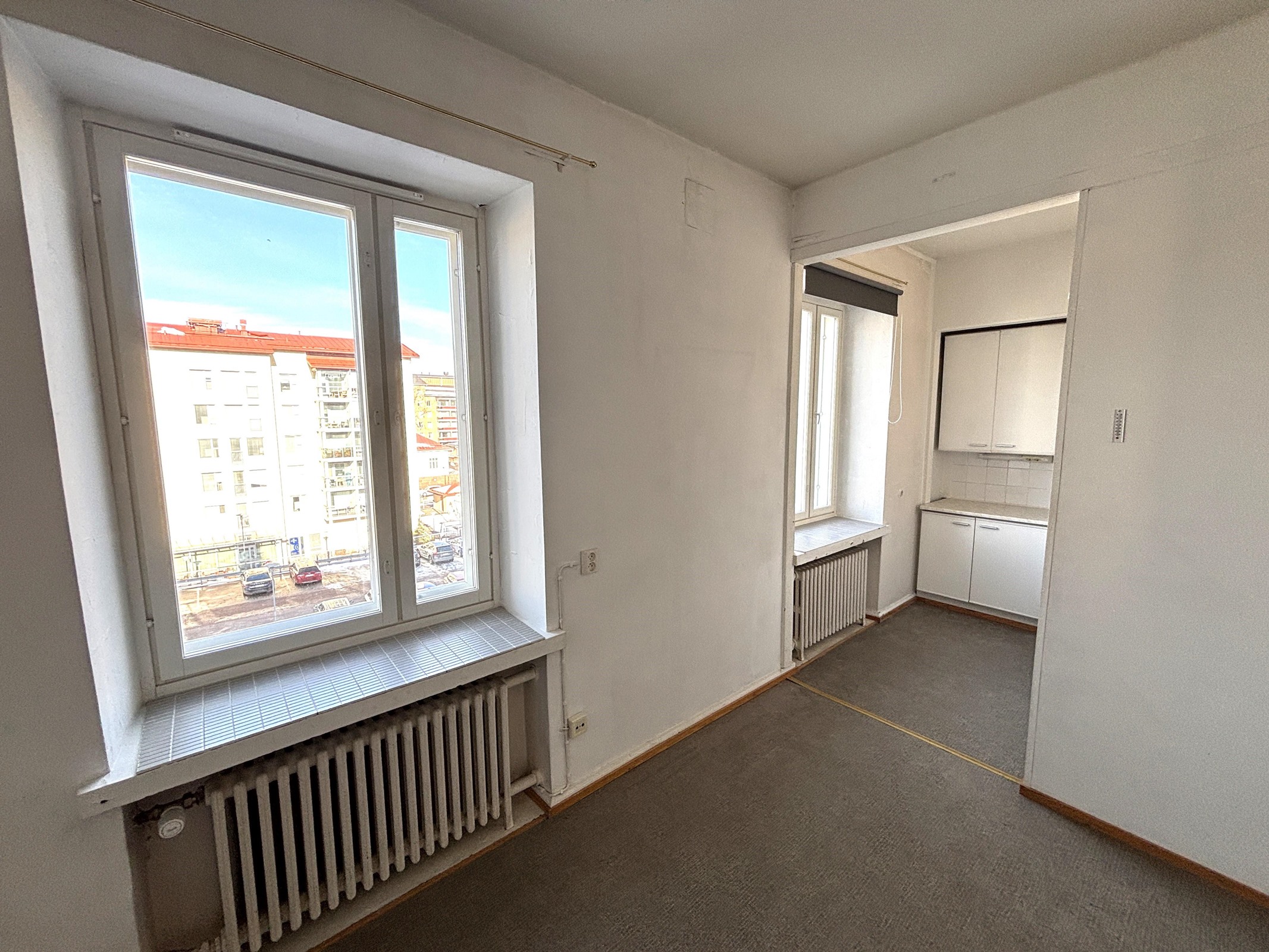 Heti vapaa 4. kerroksen yksiö Kotkansaarelta. Näkymät taloyhtiön pihalle luoteeseen.