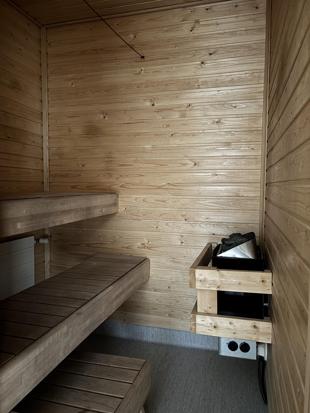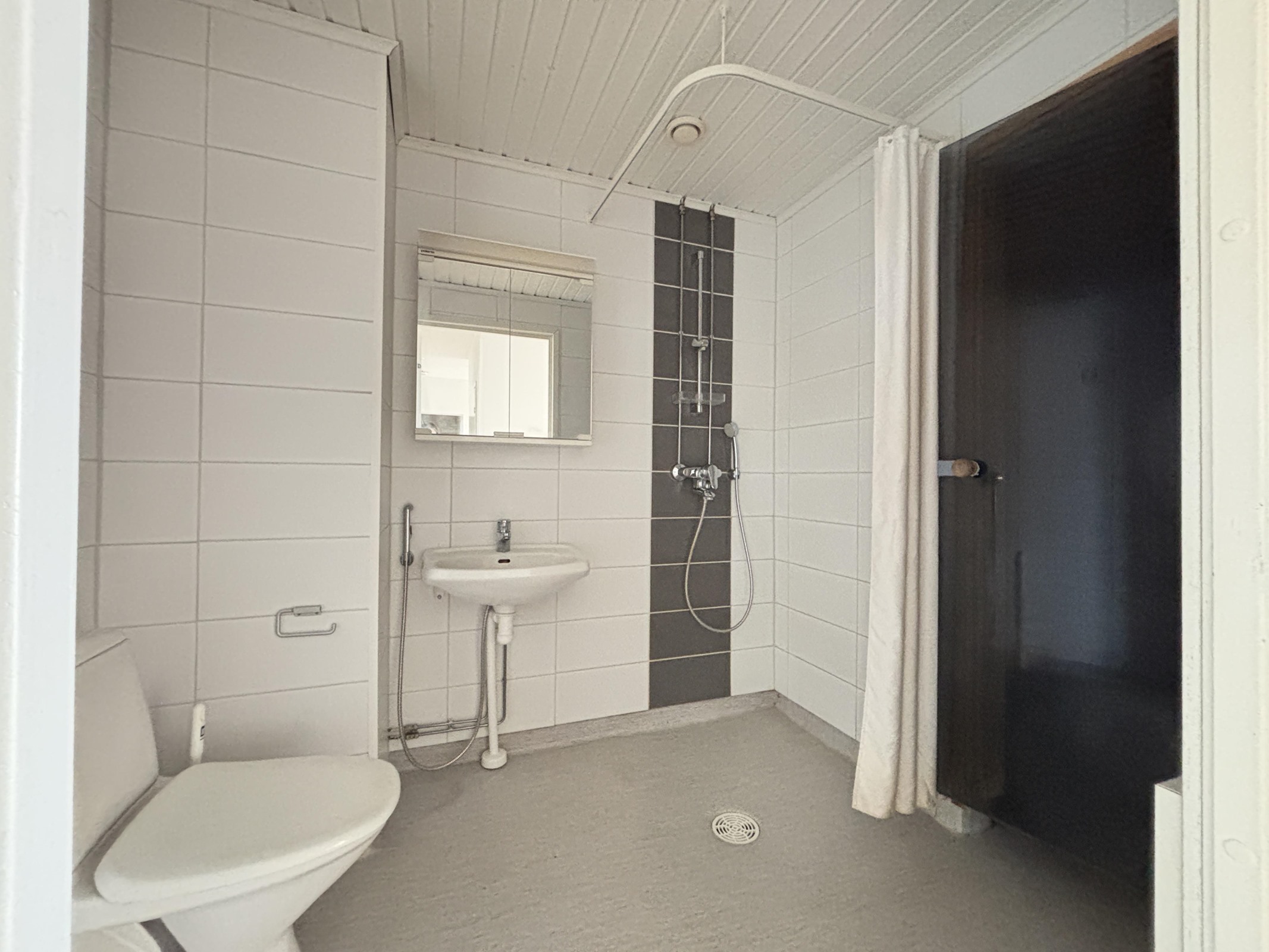 - Sauna, sähkökiuas, kylpyhuone, suihku, peilikaappi, pesukoneliitäntä, kiinteät valaisimet.