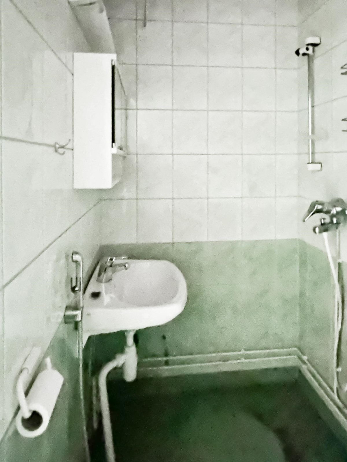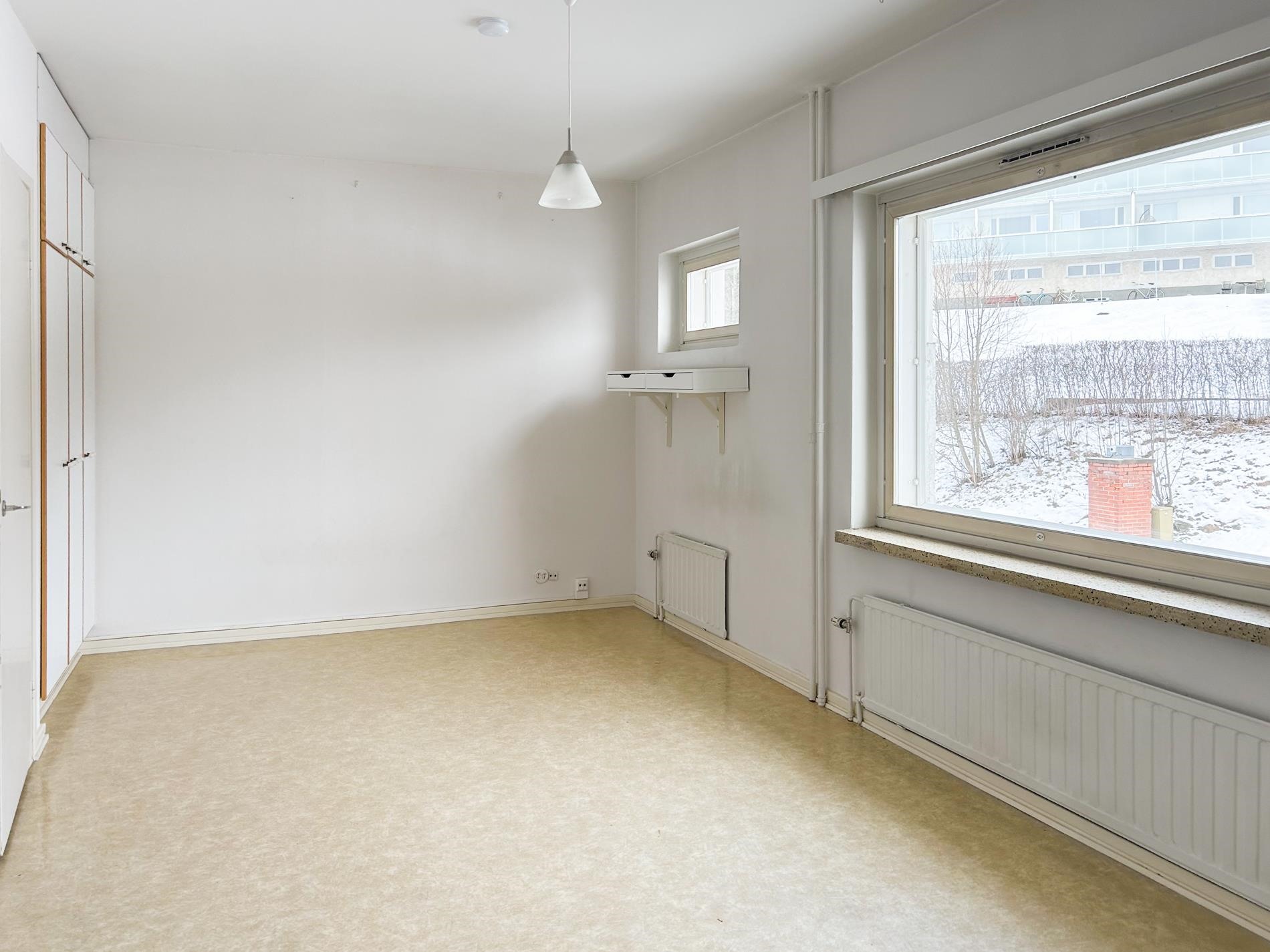 Huone: tapetoidut seinät, lattiassa muovimatto. Kylpyhuone: laatoitetut seinät, lattiassa muovipinnoite.