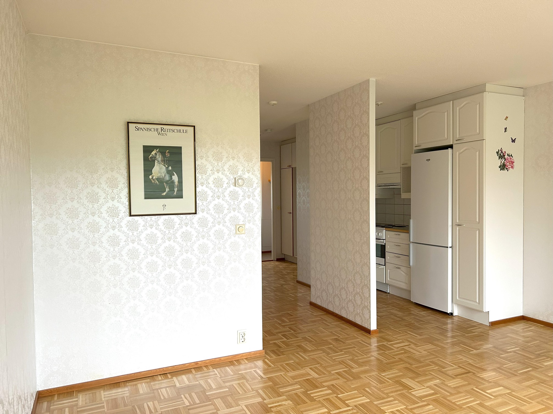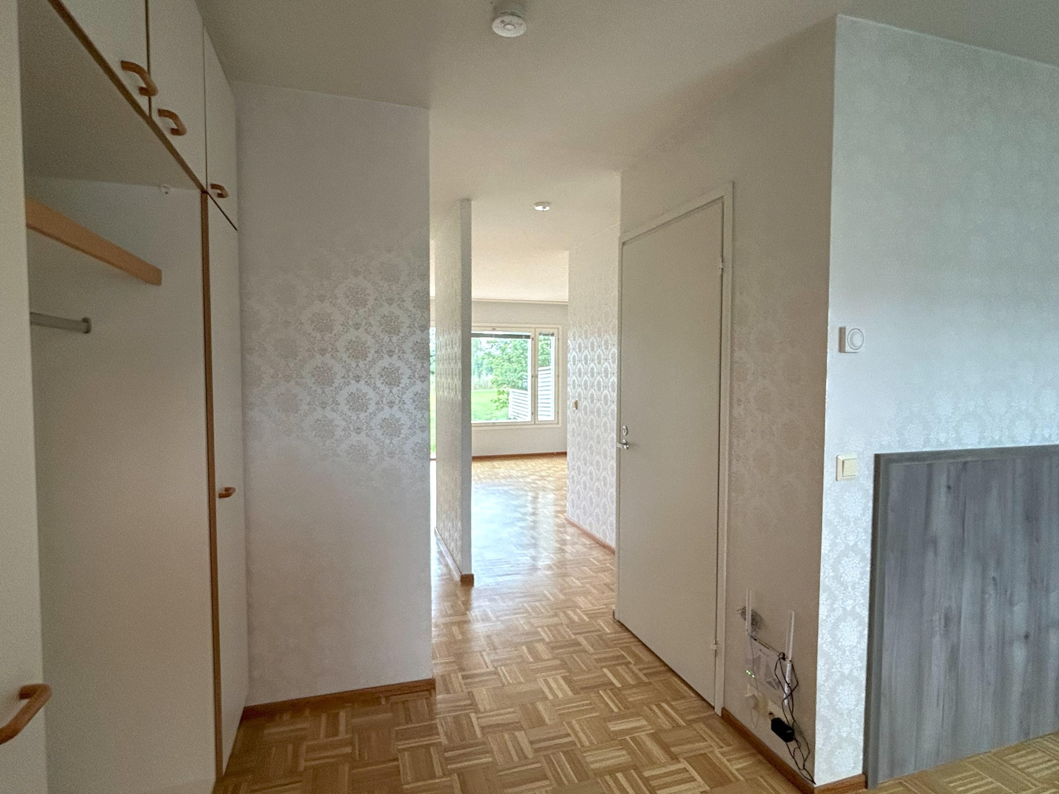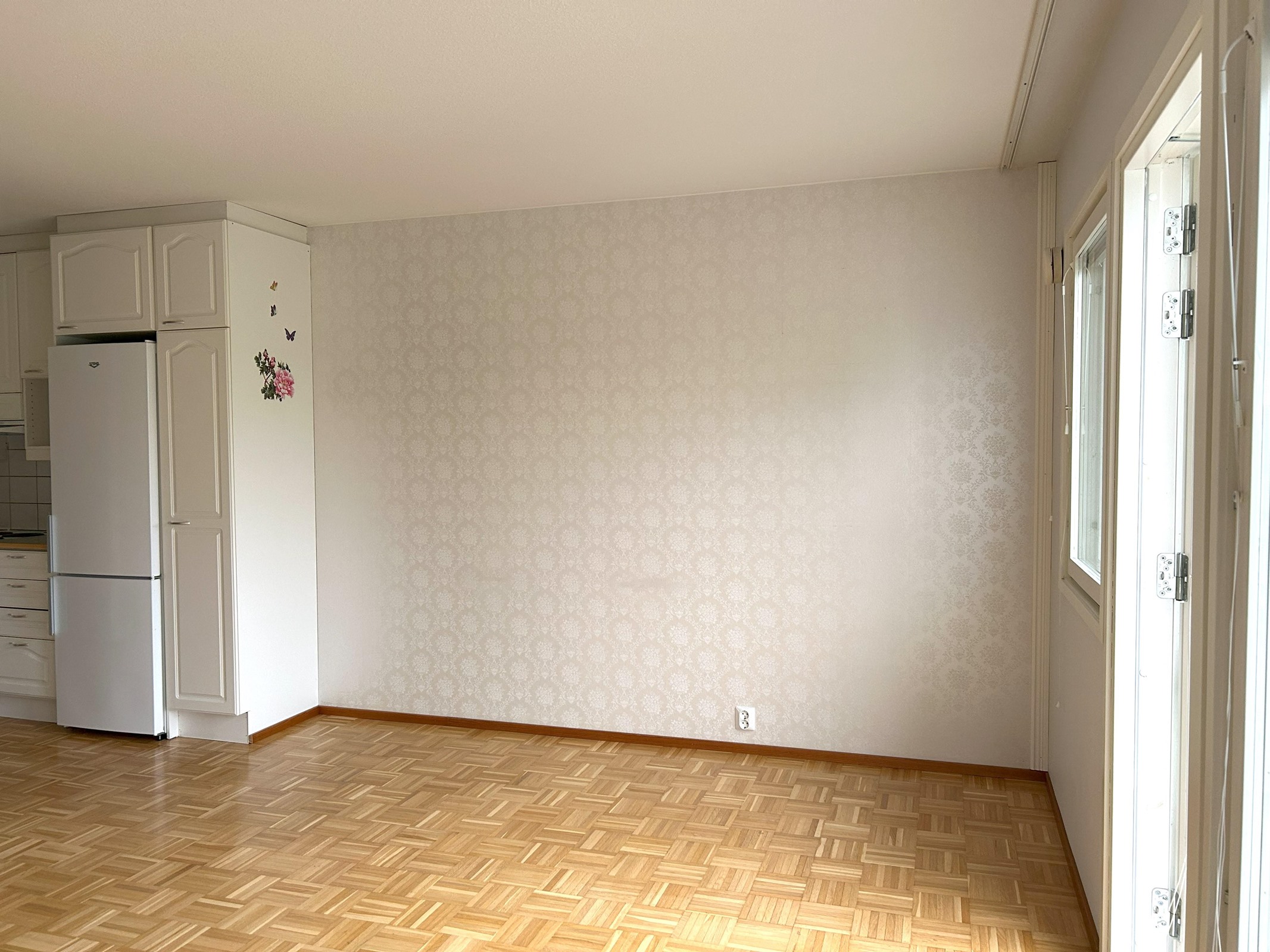 HUONE: Seinät tapetti, parkettilattia. ALKOVI: Seinät tapetti, parkettilattia. KK: Seinät maali / välitilakaakeli, parkettilattia. KPH: Seinät kaakeli, laattalattia.