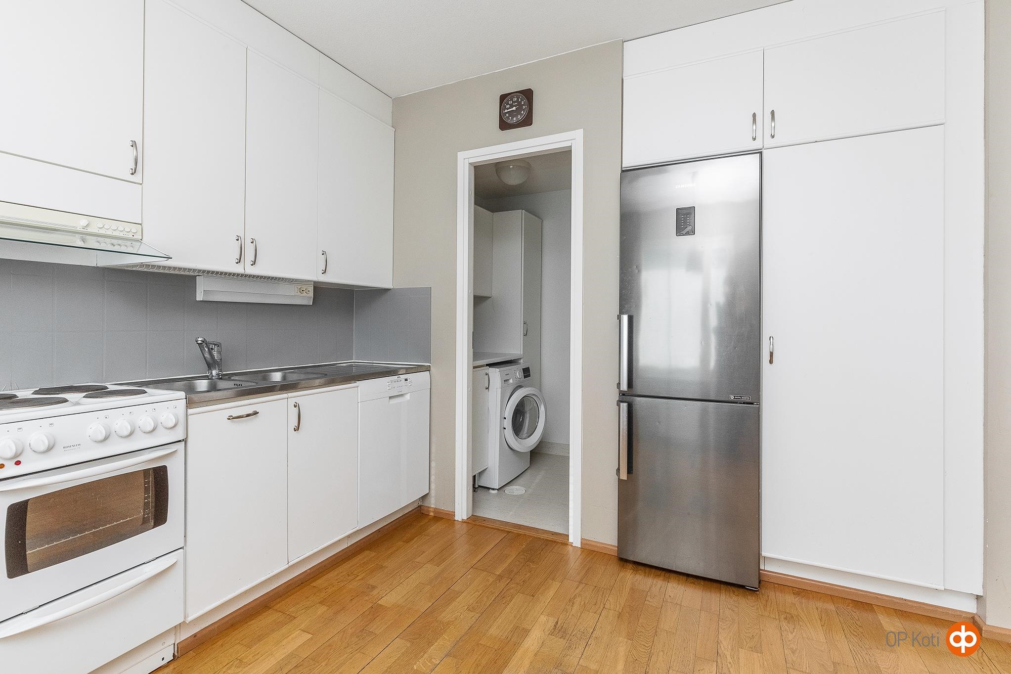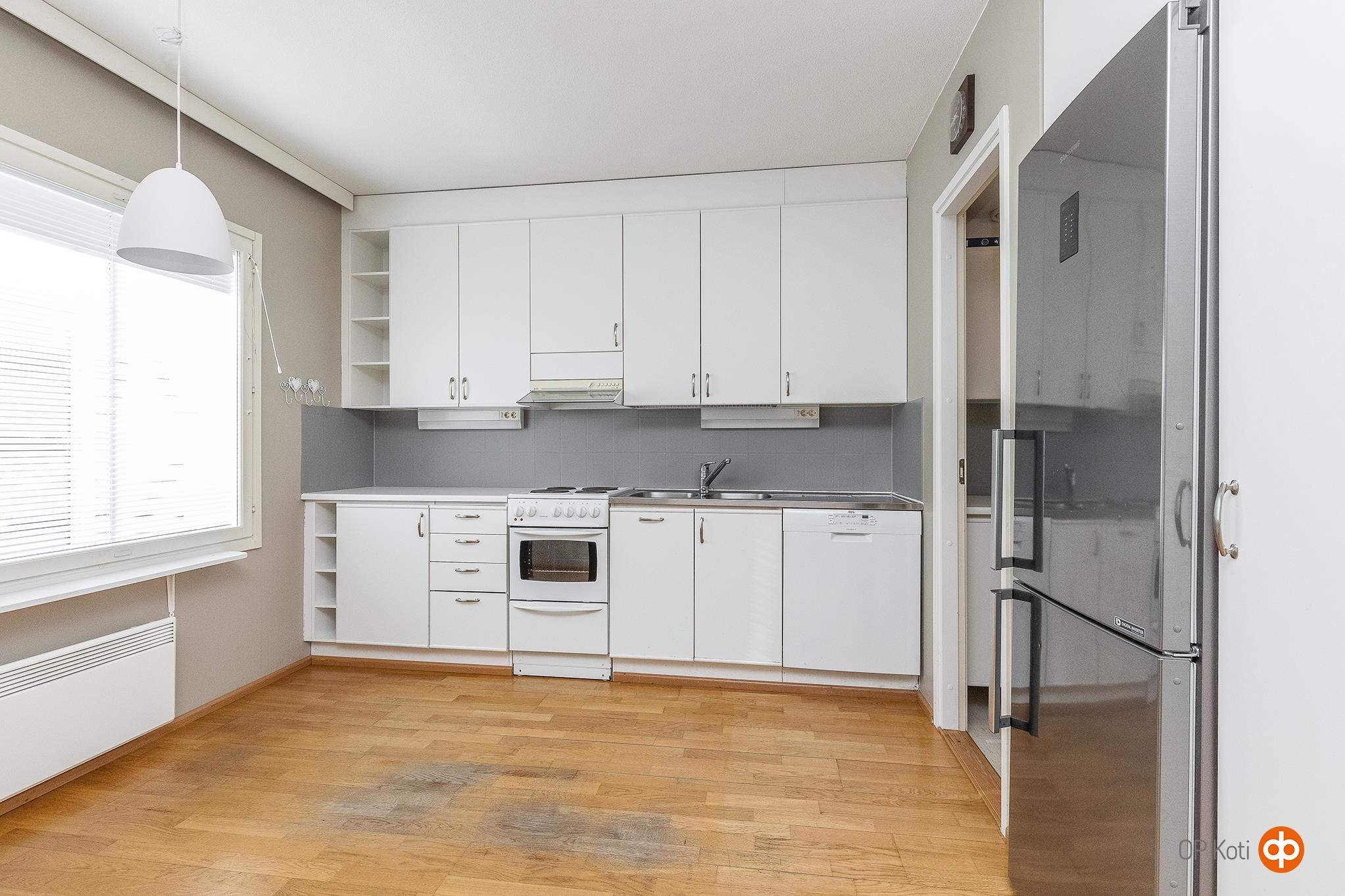 - Jääkaappipakastin, sähköliesi, liesituuletin Talotuuletin, astianpesukone, kaapistot, kiinteät valaisimet. Vaalea keittiö onnistuneesti osittain olohuoneen yhteydessä. Keittiö erotettu olohuoneesta seinäkkeellä, joka auki yläosastaan. Mukavasti kaapistoja ja laskutilaa. Riittävä tila ruokapöydälle. Keittiön yhteydessä kodinhoitotila kaapistoineen.