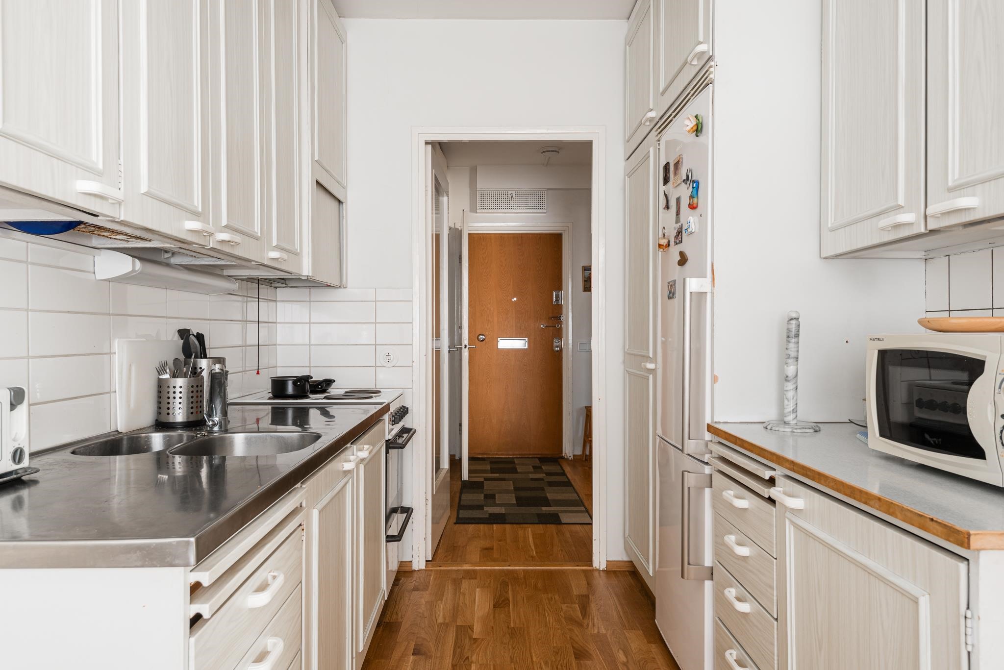 - Jääkaappipakastin, sähköliesi, kaapistot, kiinteät valaisimet.
