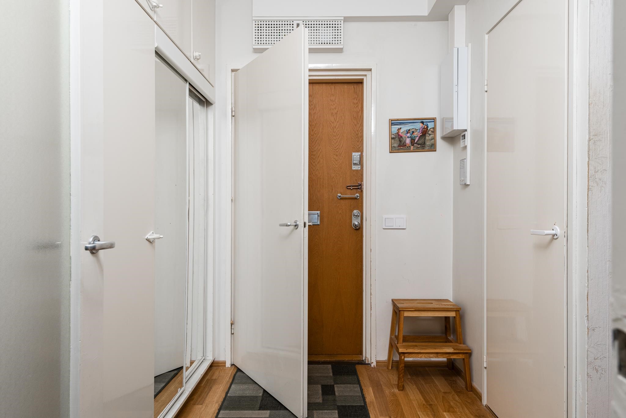 Keittiö: Parketti, maali. Olohuone: Parketti, tapetti. Makuuhuone 1: Muovimatto, tapetti. Makuuhuone 2: Muovimatto, tapetti. Kylpyhuone: Laatta, uusittu putkiremontin yhteydessä 2019. Eteinen: Parketti, maali.