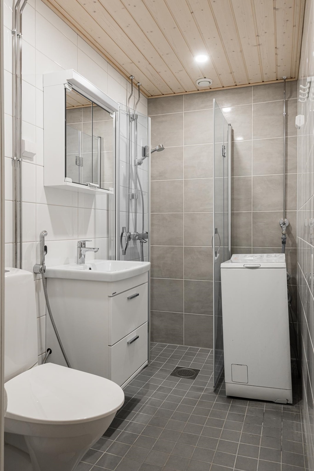 - Suihku, suihkuseinä, peilikaappi, allaskaappi, pesukoneliitäntä, lattialämmitys, kiinteät valaisimet.