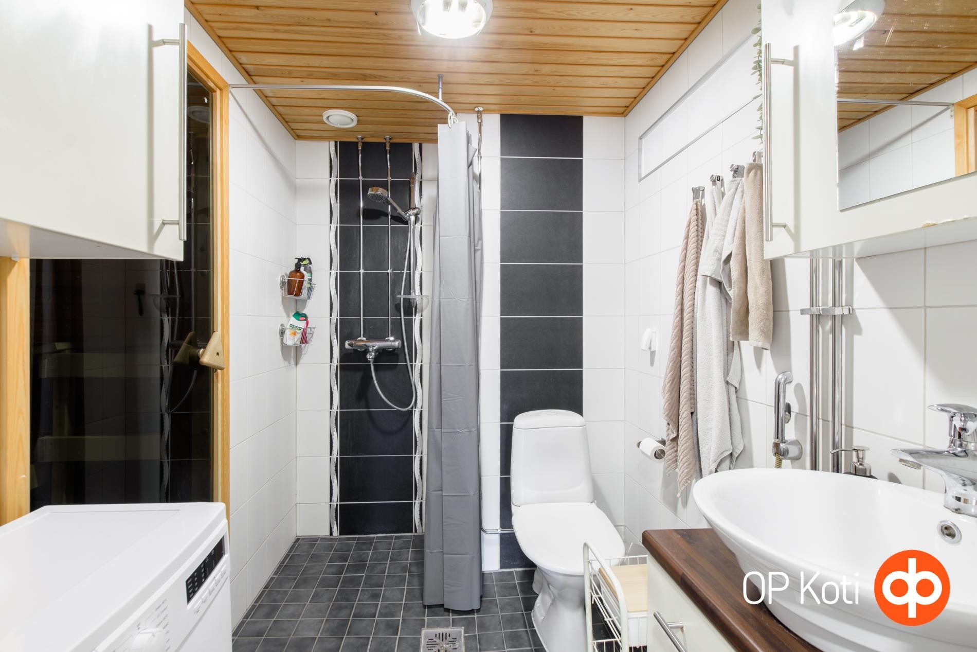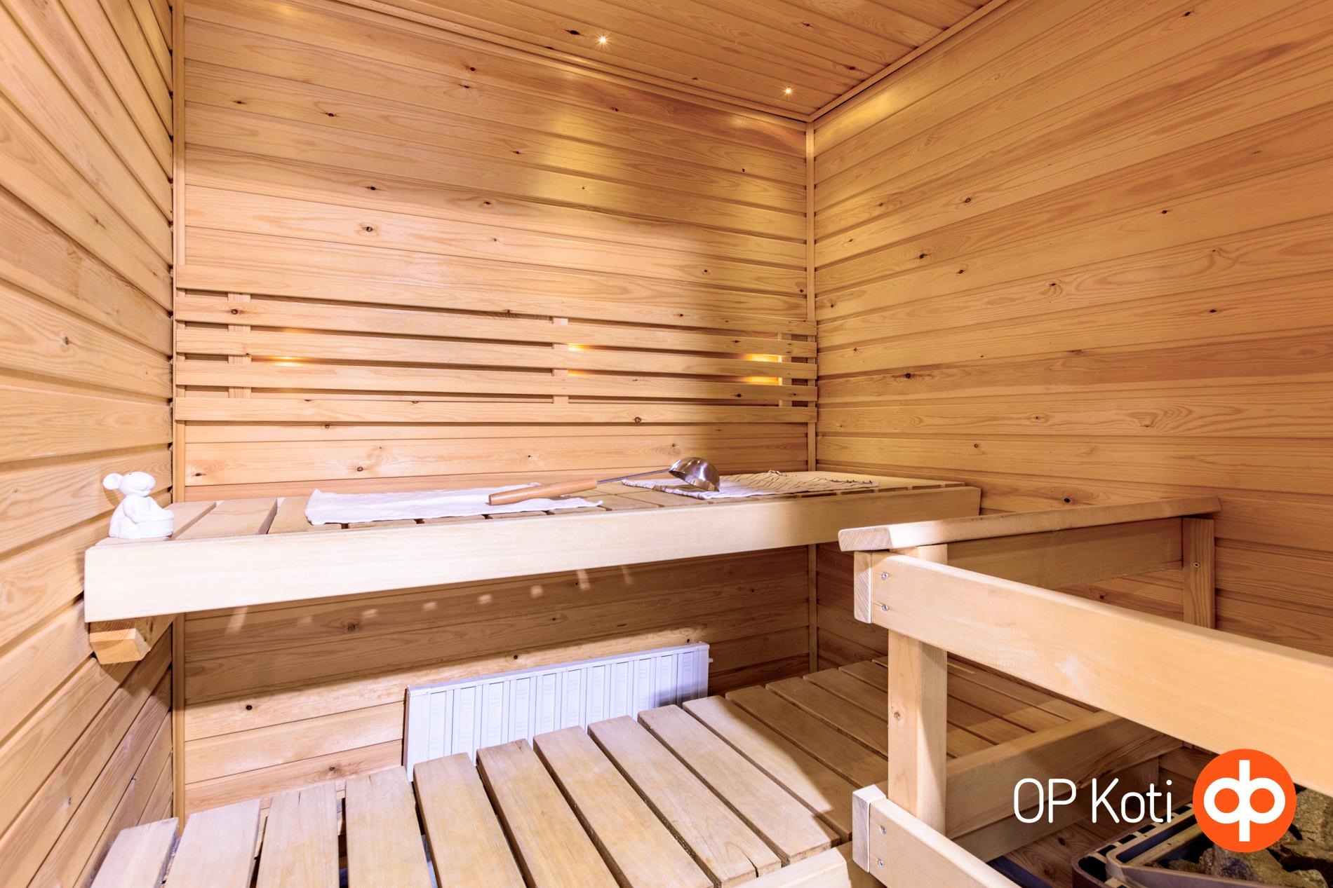 - Sauna, sähkökiuas, kylpyhuone, suihku, peilikaappi, kaapit, allaskaappi, pesukoneliitäntä, kiinteät valaisimet.