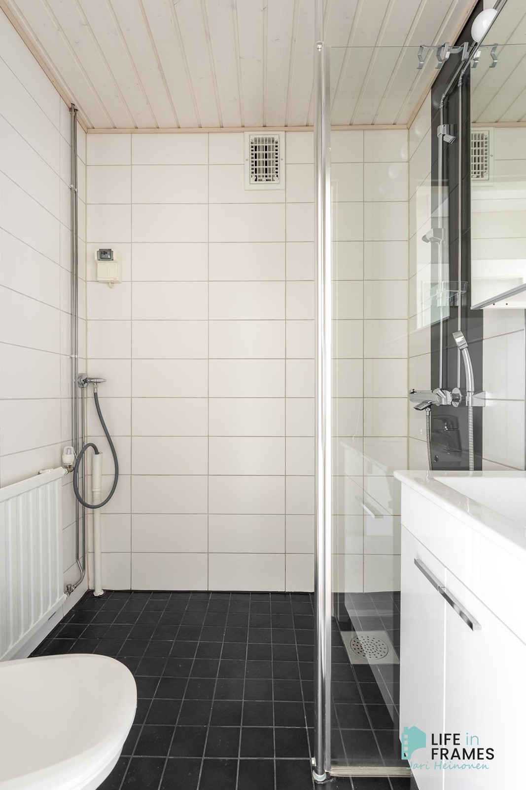 - Kylpyhuone, suihku, allaskaappi, pesukoneliitäntä, kiinteät valaisimet.