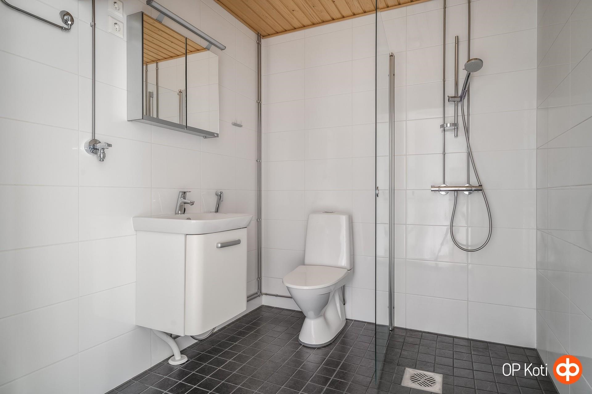 - Suihku, suihkuseinä, peilikaappi, allaskaappi, pesukoneliitäntä, lattialämmitys (mukavuuslattialämmitys sähköllä), kiinteät valaisimet.
