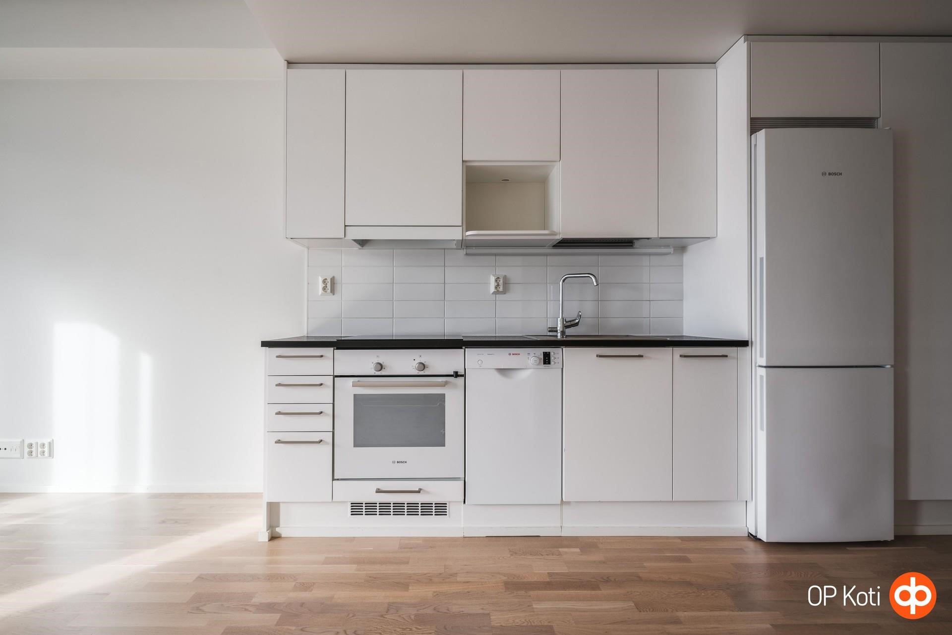 - Jääkaappipakastin, erillisuuni, liesitaso, liesituuletin, astianpesukone, kaapistot, kiinteät valaisimet.