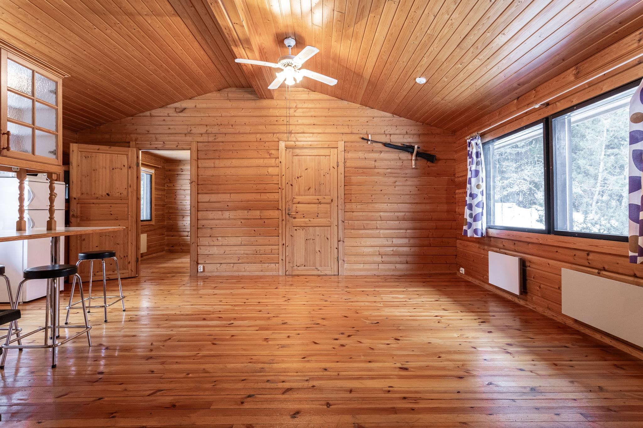 Mökki koostuu tilavasta tuvasta, kahdesta makuuhuoneesta, wc:stä, pukuhuoneesta ja saunasta.