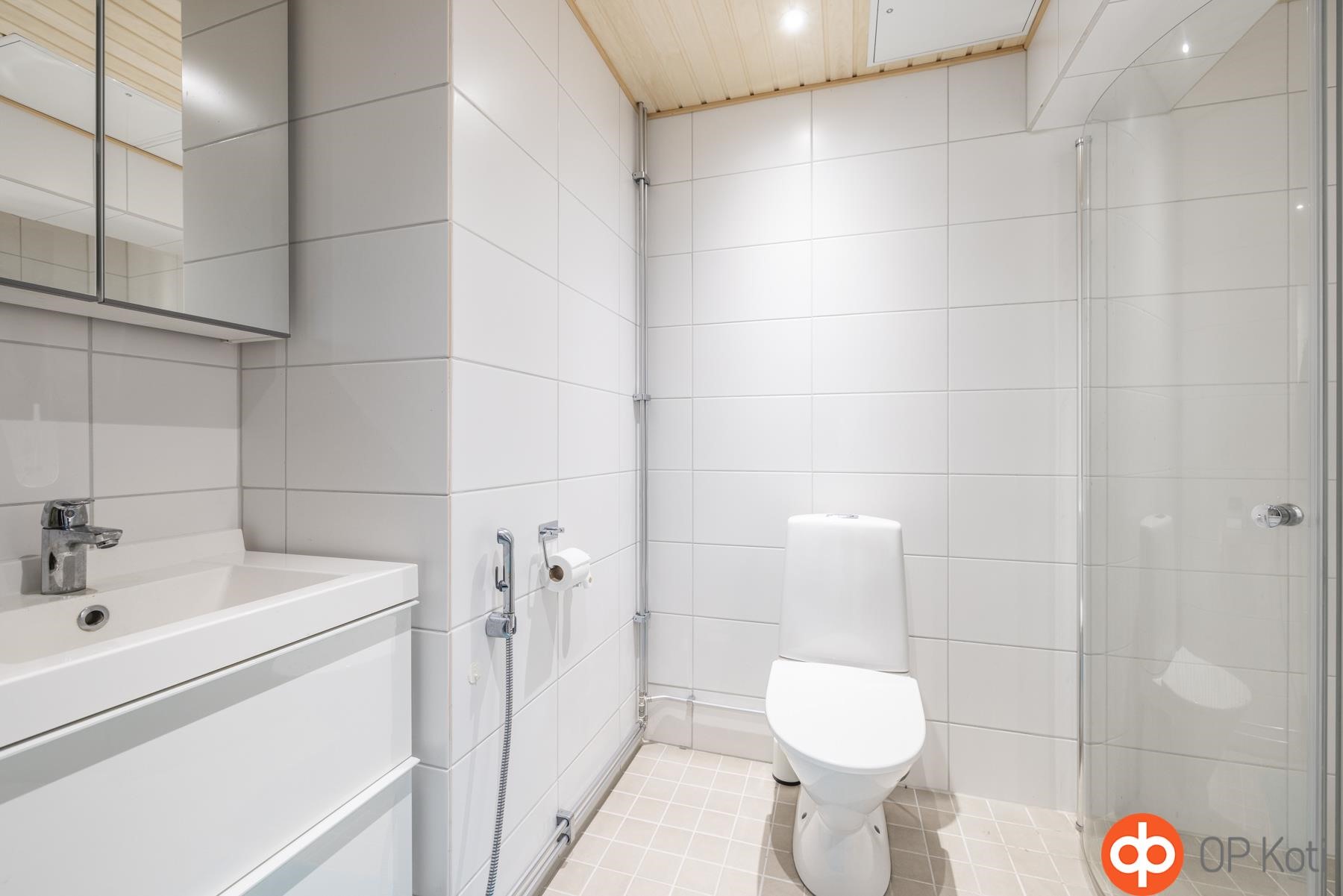 - Kylpyhuone, suihku, peilikaappi, allaskaappi, pesukoneliitäntä, lattialämmitys, kiinteät valaisimet.