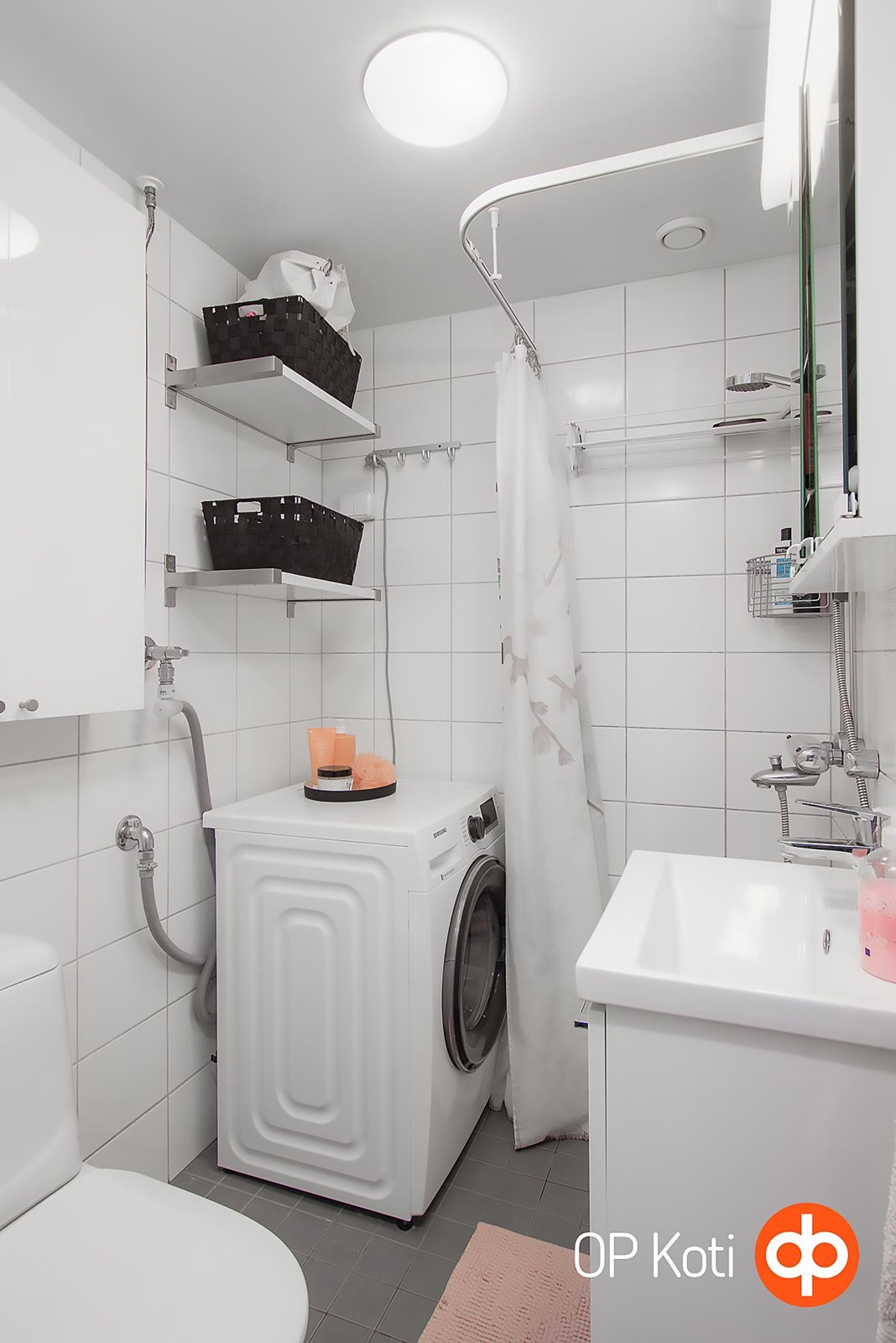 - Kylpyhuone, suihku, peilikaappi, kaapit, pesukoneliitäntä, kiinteät valaisimet.