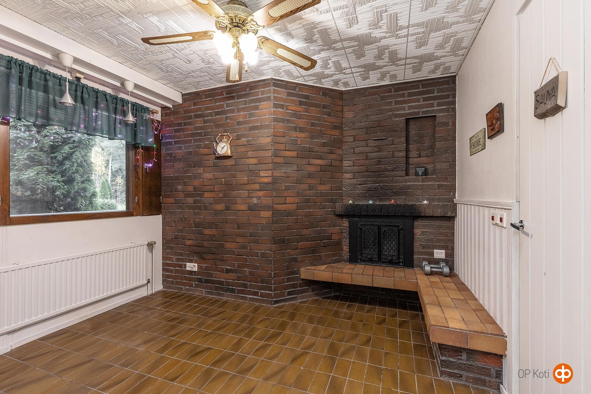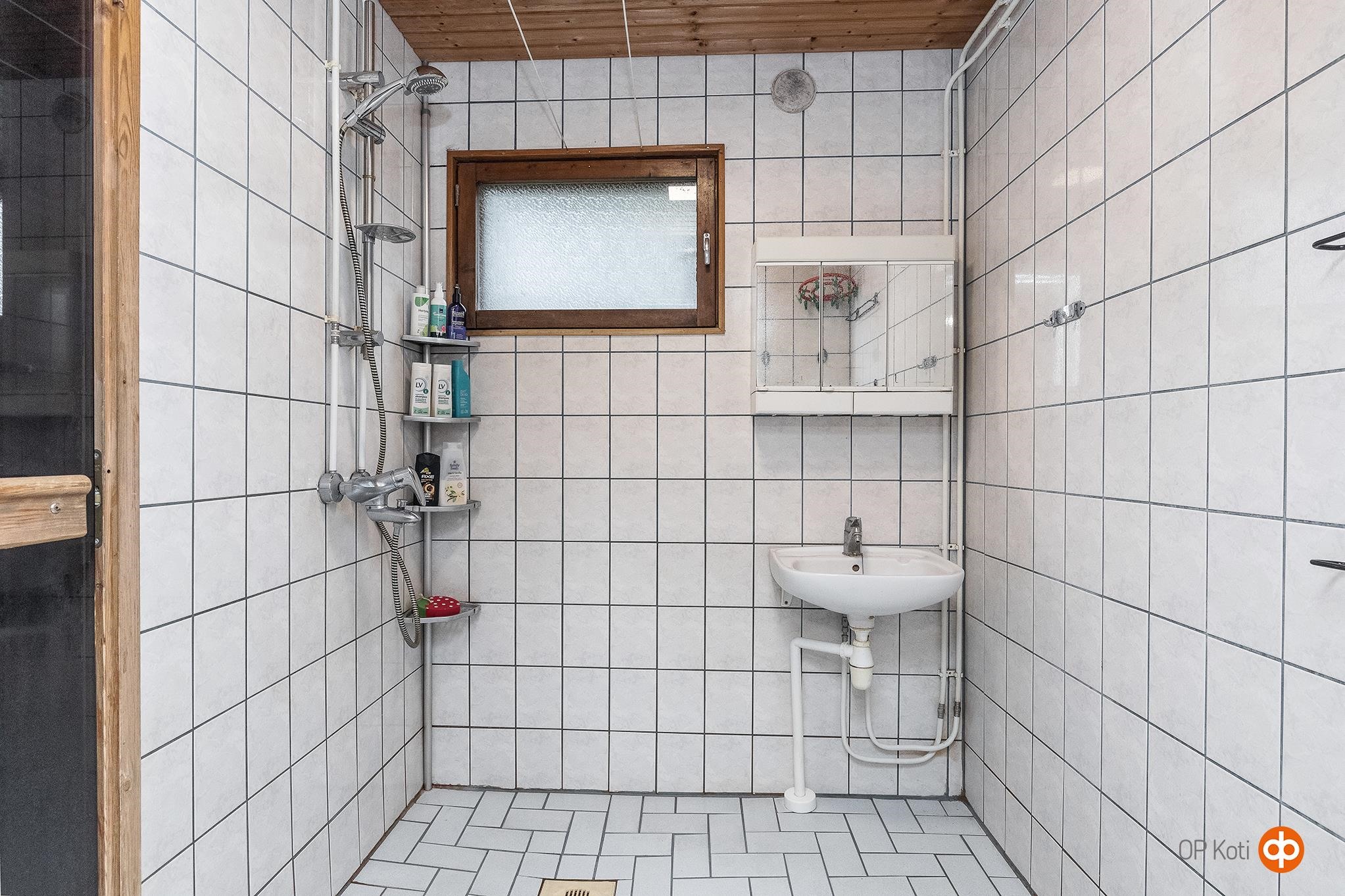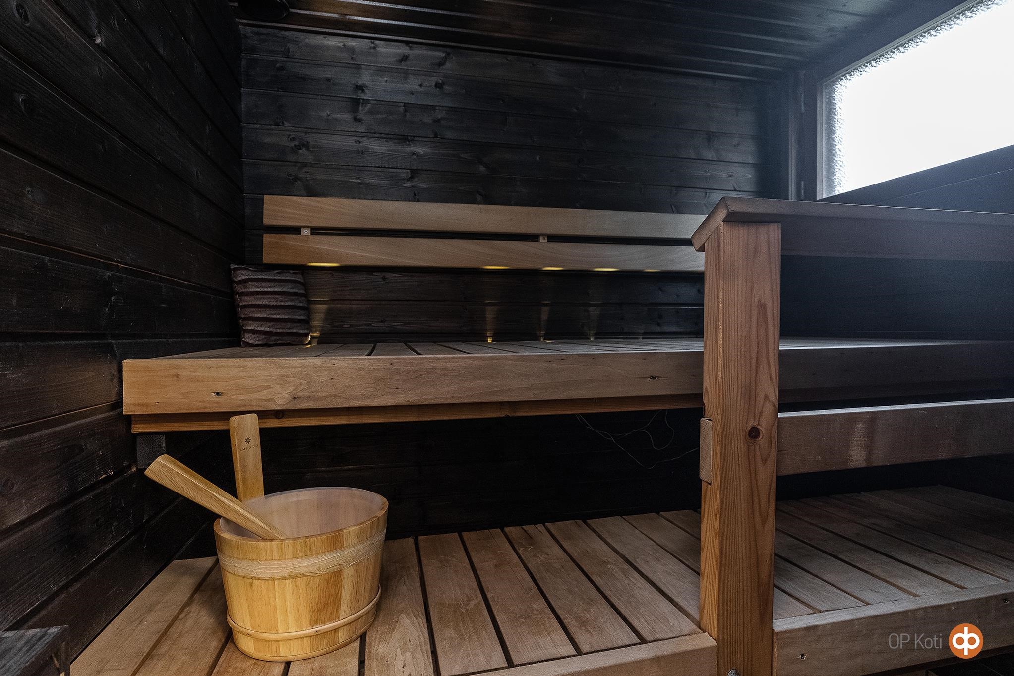 - Sauna, sähkökiuas, kylpyhuone, erillinen wc, suihku, peilit, pesukoneliitäntä, lattialämmitys ph + s, kiinteät valaisimet.