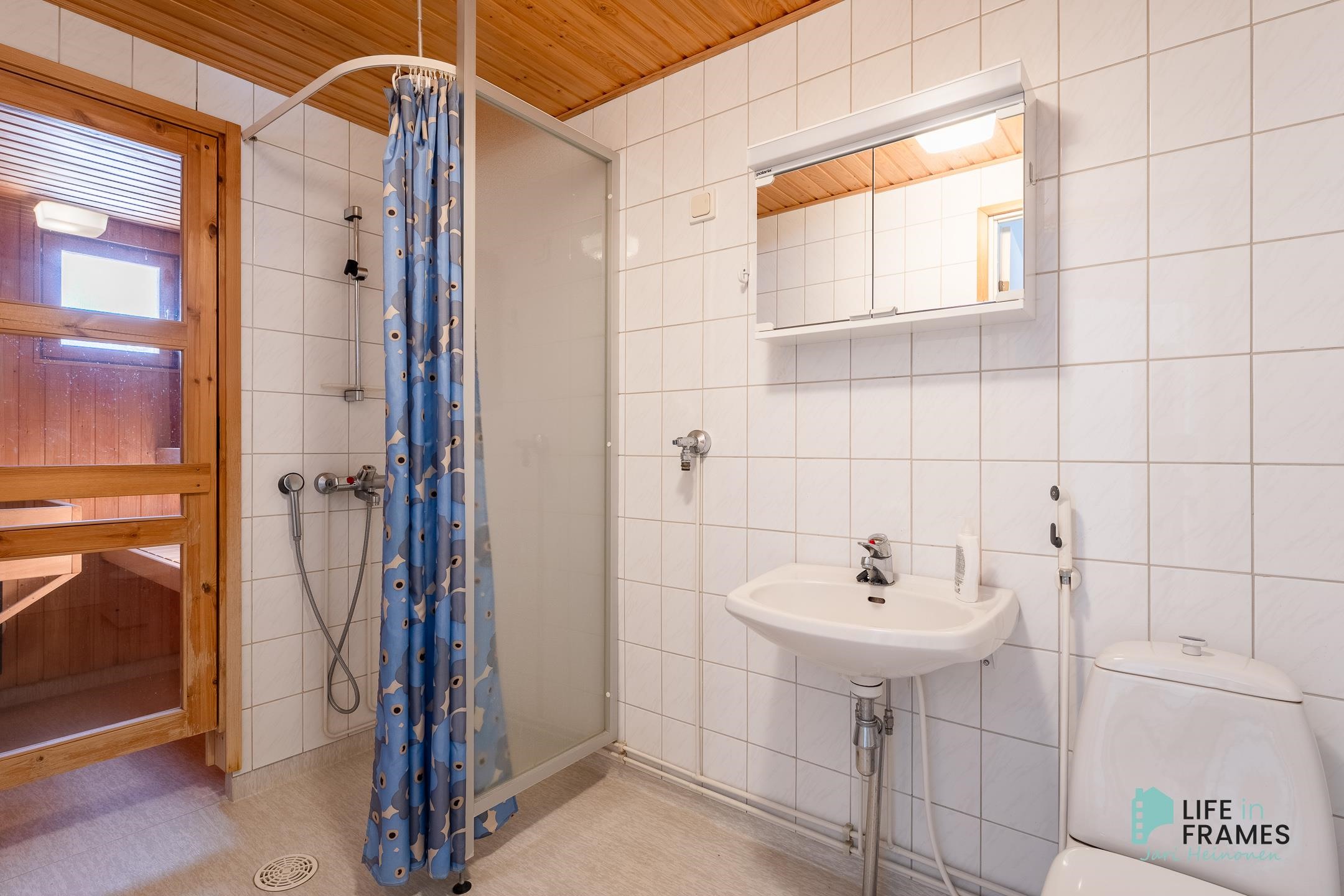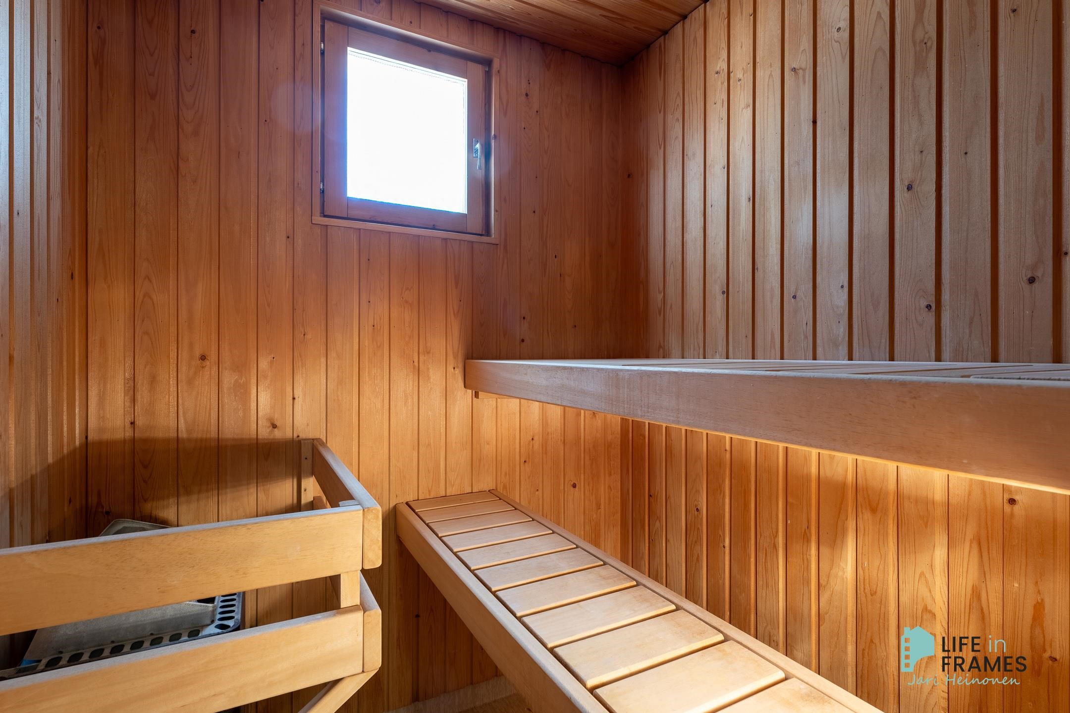 - Sauna, sähkökiuas, kylpyhuone, suihku, peilikaappi, pesukoneliitäntä, lattialämmitys, kiinteät valaisimet.