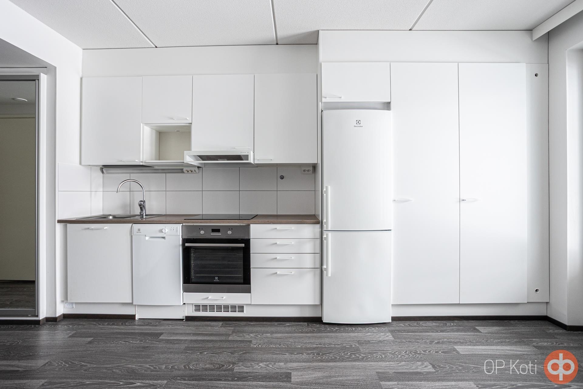 - Jääkaappipakastin, erillisuuni, keraaminen liesi, liesituuletin, astianpesukone, kaapistot, kiinteät valaisimet.