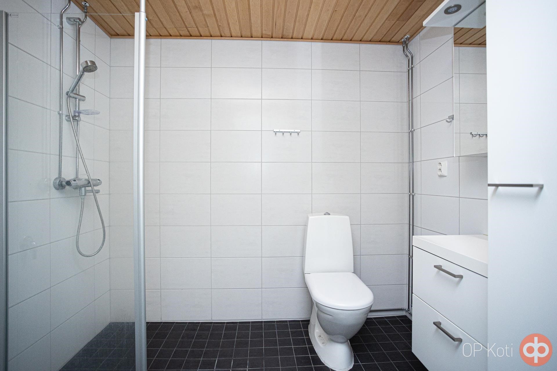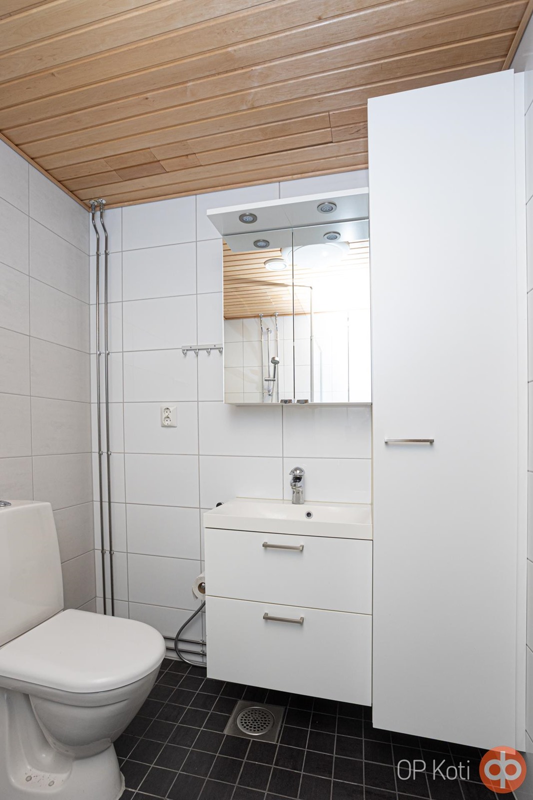 - Kylpyhuone, suihkuseinä, peilikaappi, allaskaappi, pesukoneliitäntä, lattialämmitys Vesikiertoinen, kiinteät valaisimet.