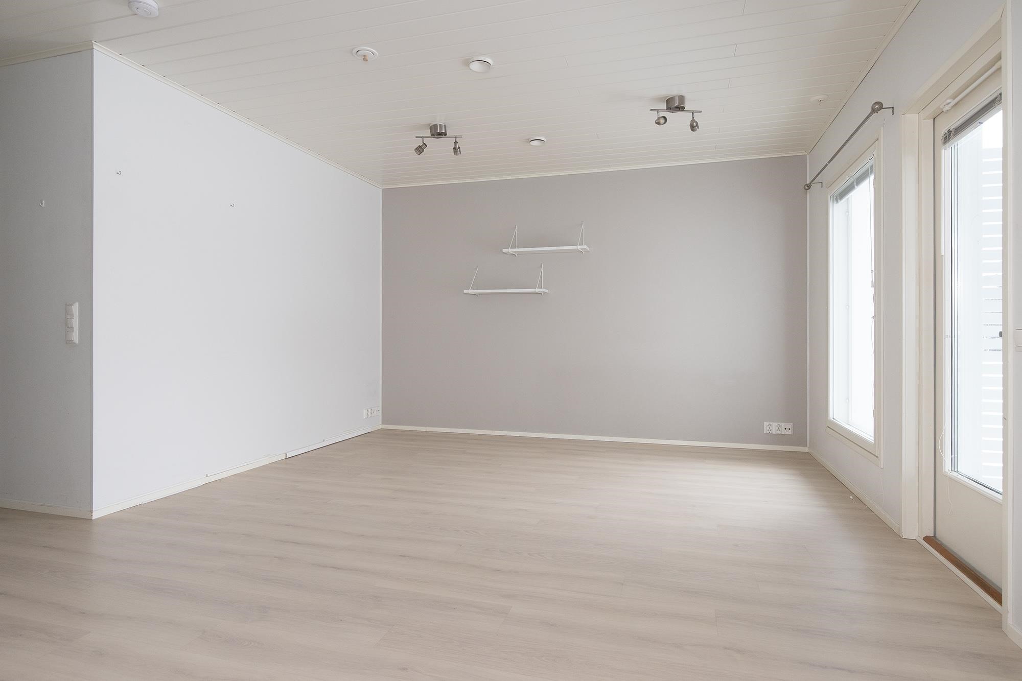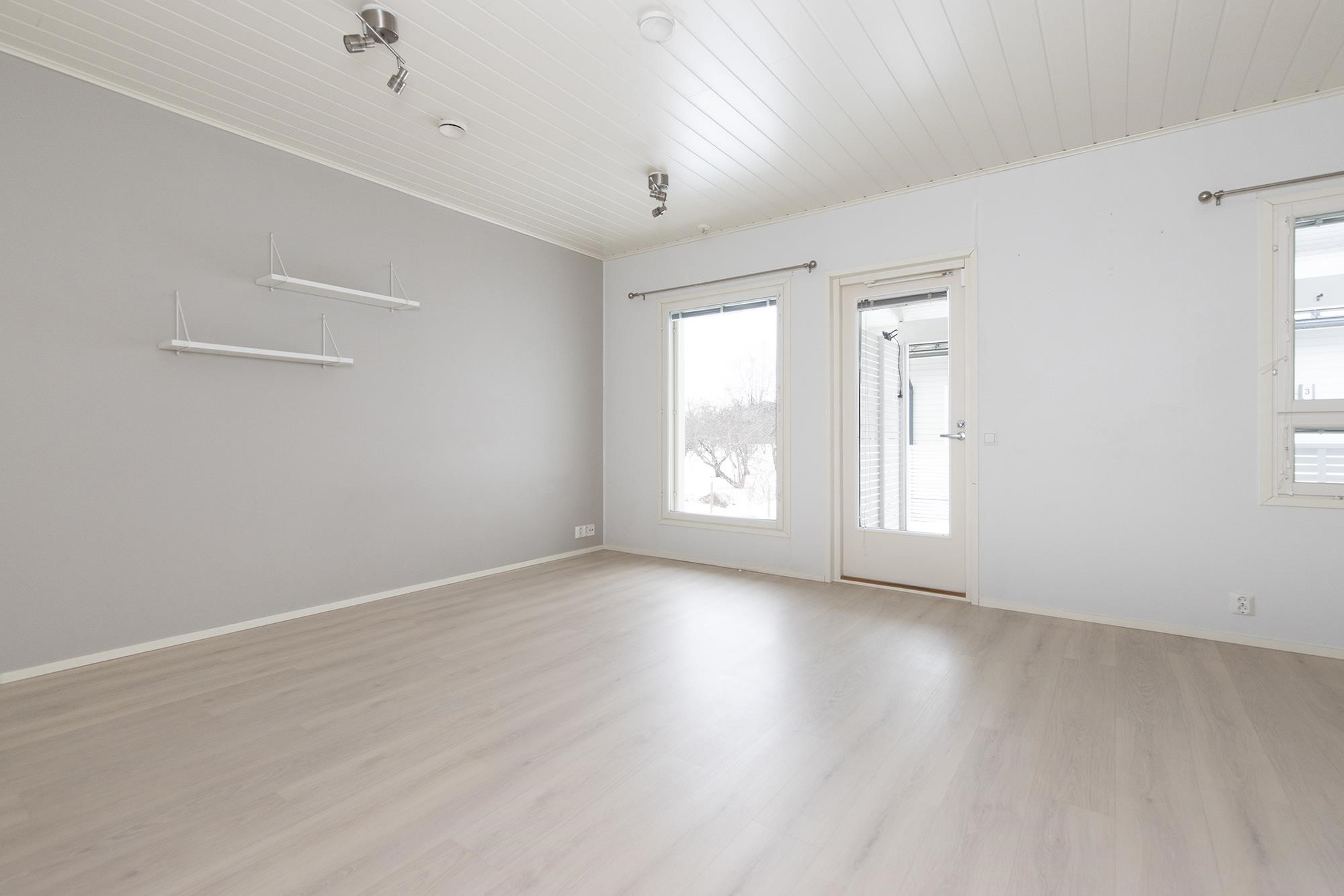 Keittiö: Laminaatti, maalattu. Olohuone: Laminaatti, maalattu. Makuuhuone 1: Laminaatti, maalattu/tapetti. Sauna: Laatta, paneeli. Kylpyhuone: Laatta, laatta.