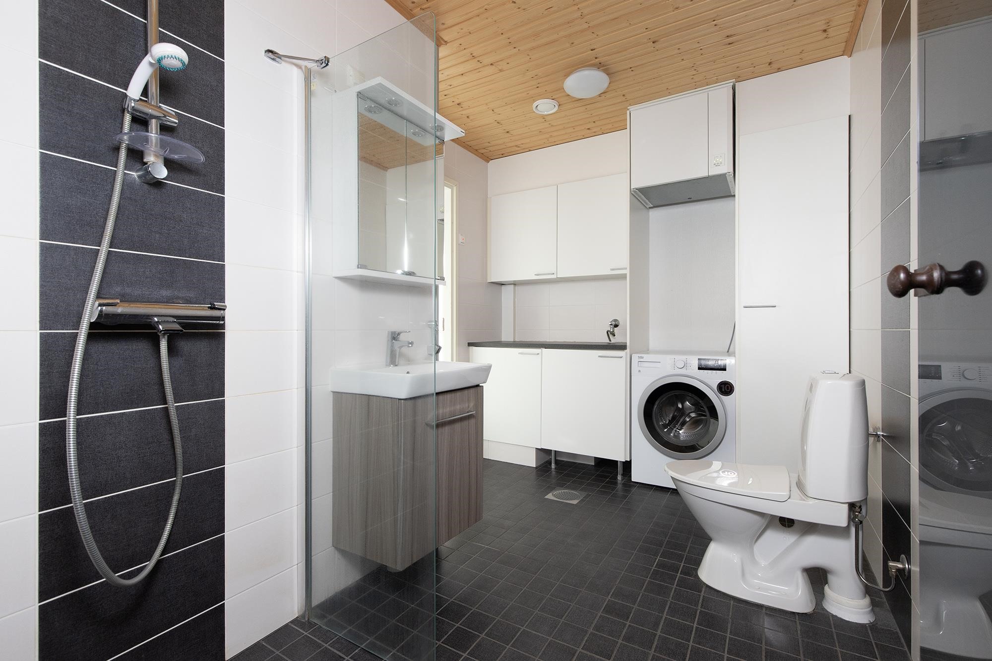 - Sauna, sähkökiuas, kylpyhuone, suihku, suihkuseinä, peilikaappi, allaskaappi, pesukoneliitäntä, lattialämmitys.
