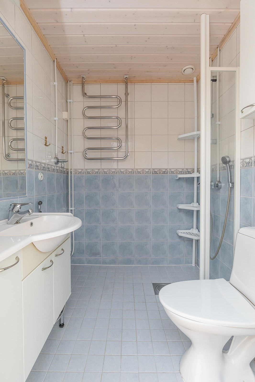 - Kylpyhuone, suihku, allaskaappi, pesukoneliitäntä, kiinteät valaisimet.