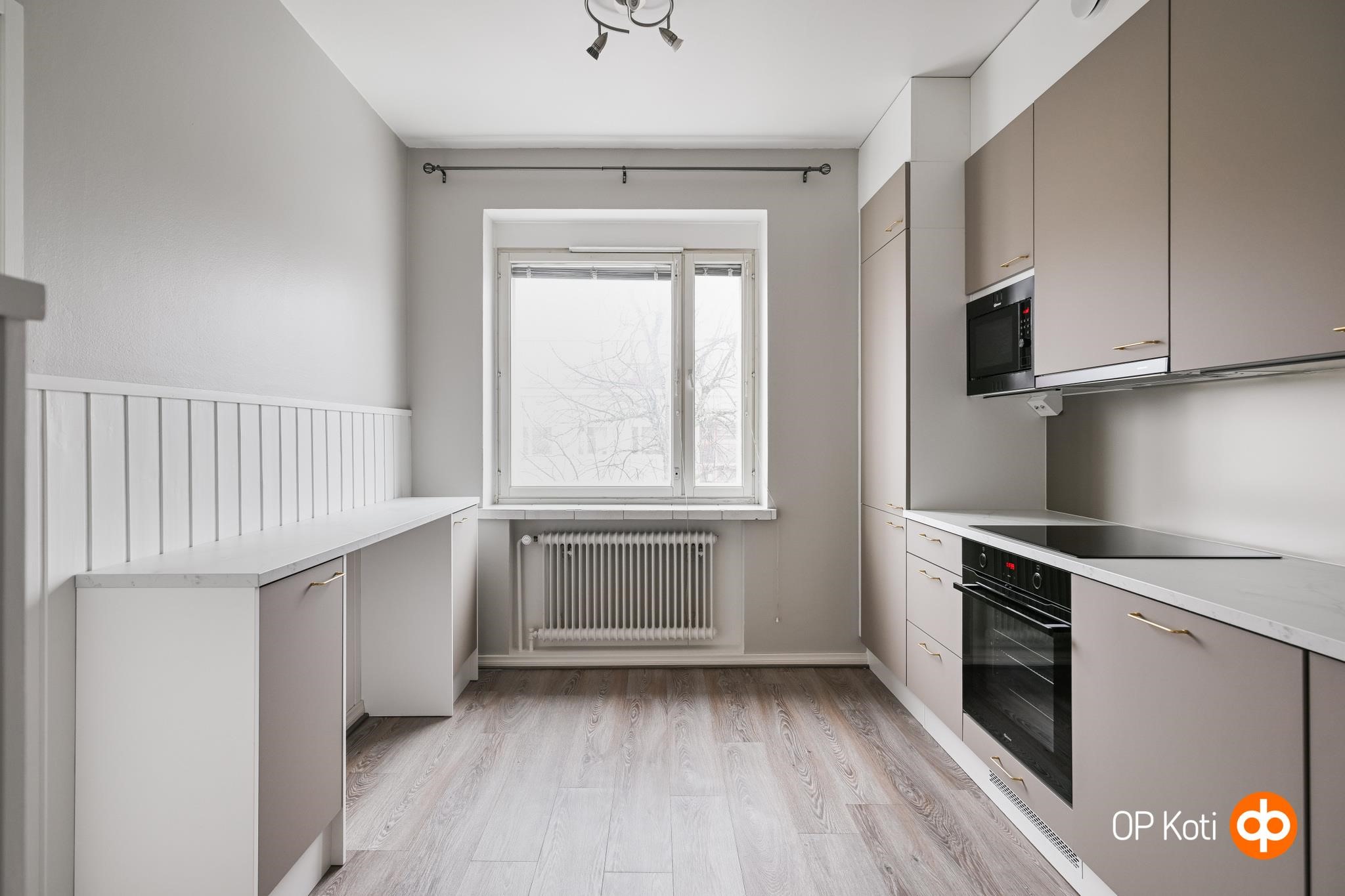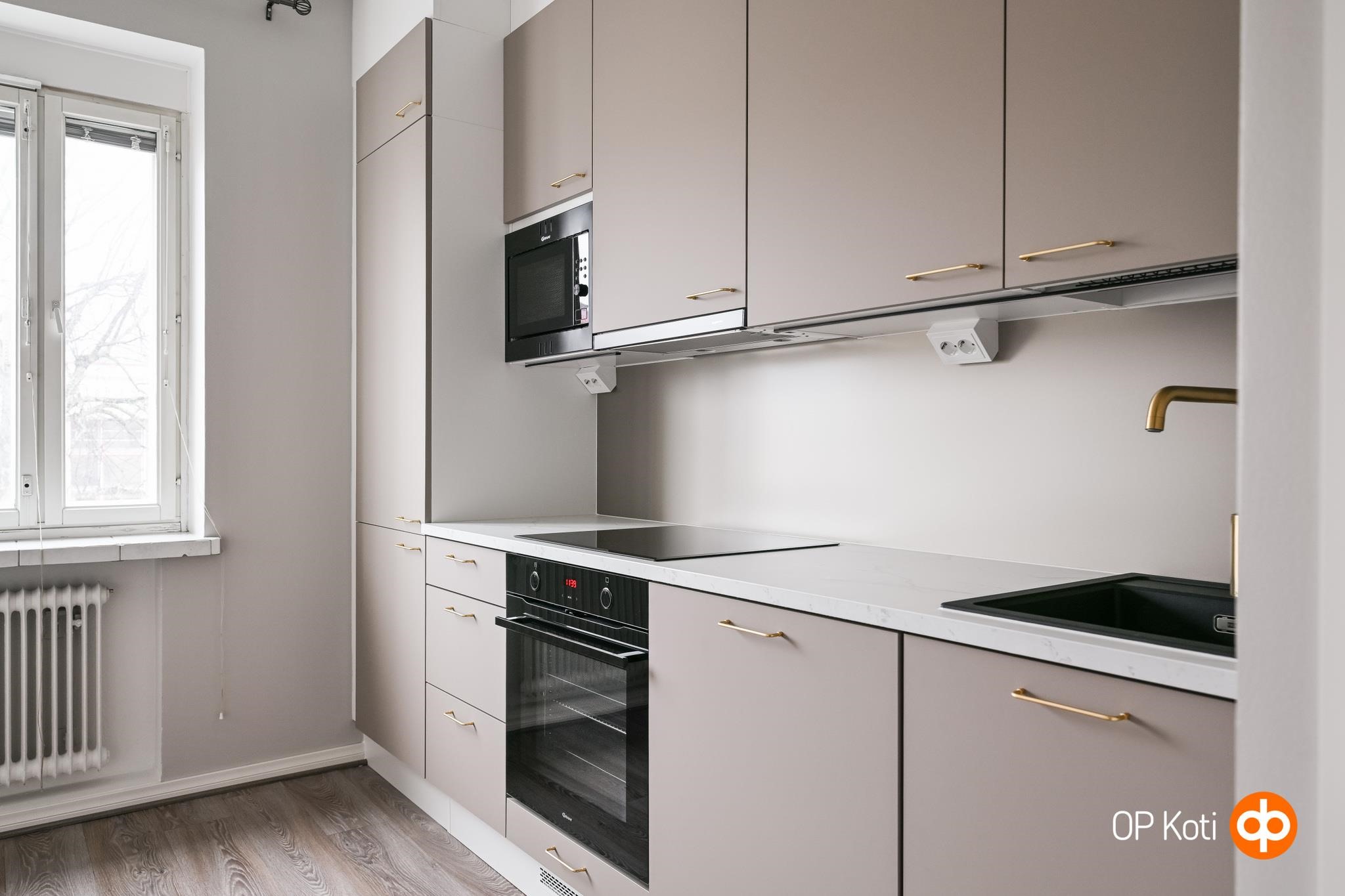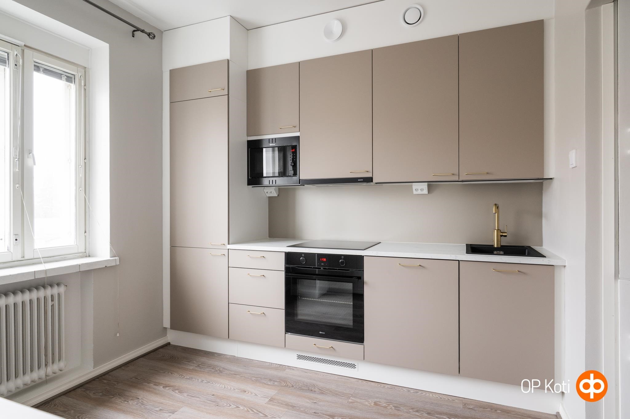 - Jääkaappipakastin, erillisuuni, liesitaso, induktioliesi, liesituuletin, mikroaaltouuni, astianpesukone, kaapistot, kiinteät valaisimet. Keittiö remontoitu 2026, integroidut kodinkoneet.