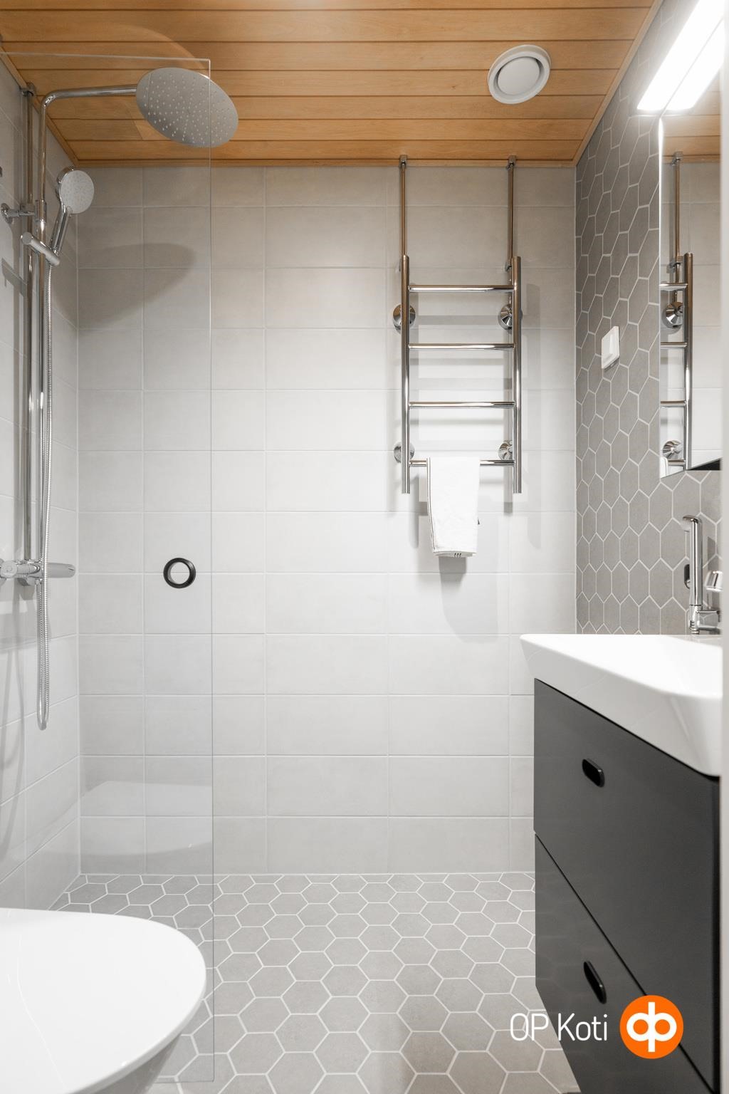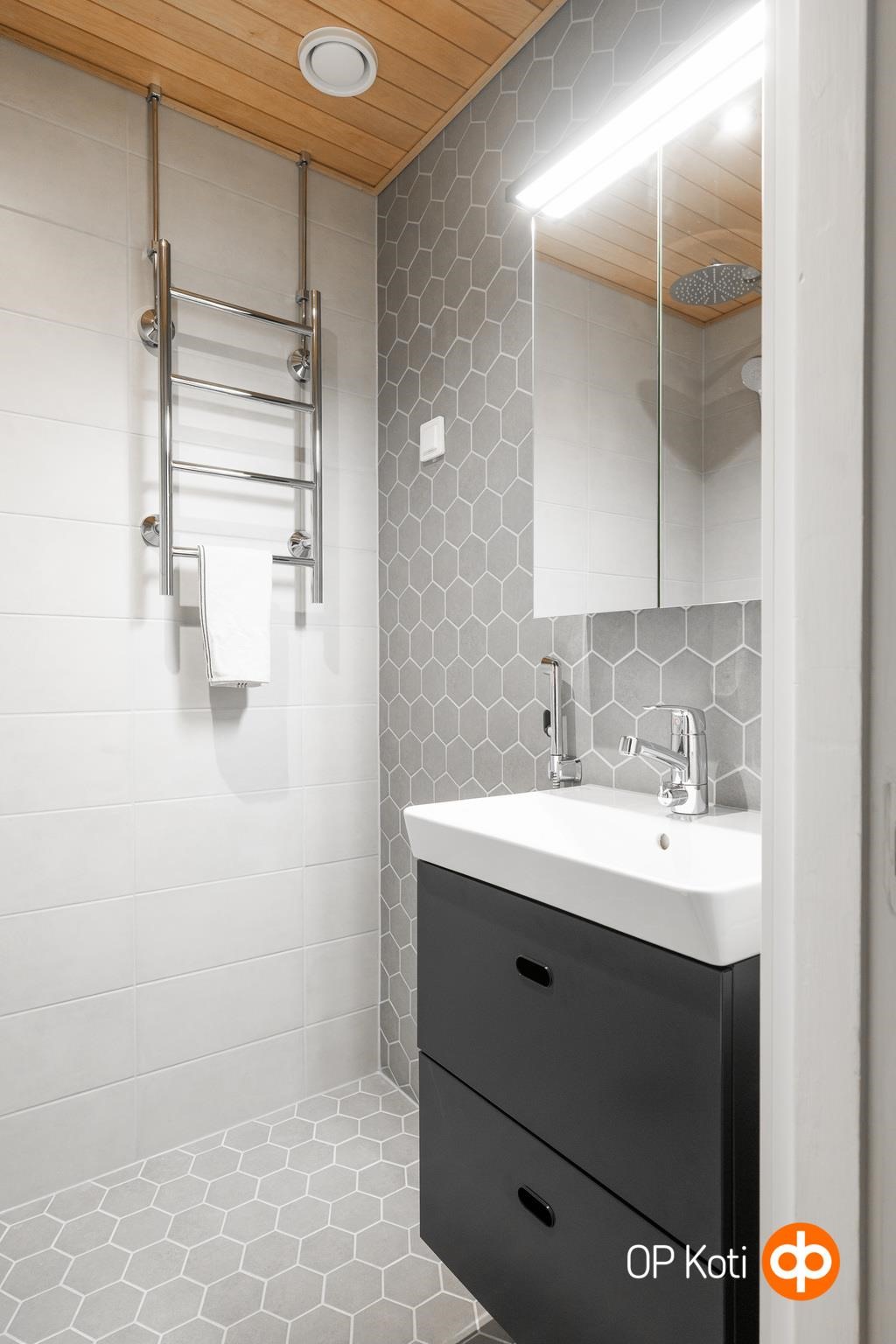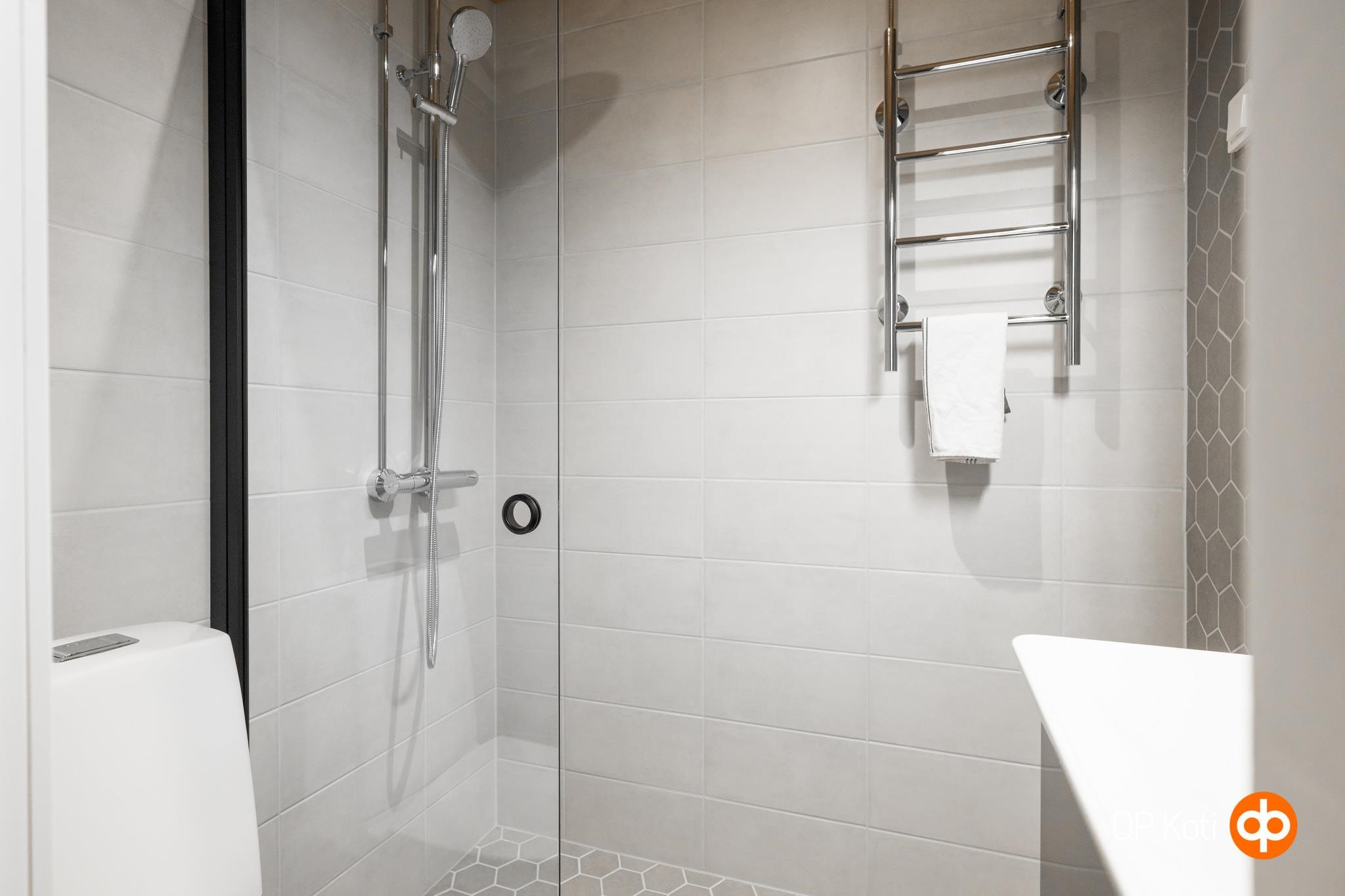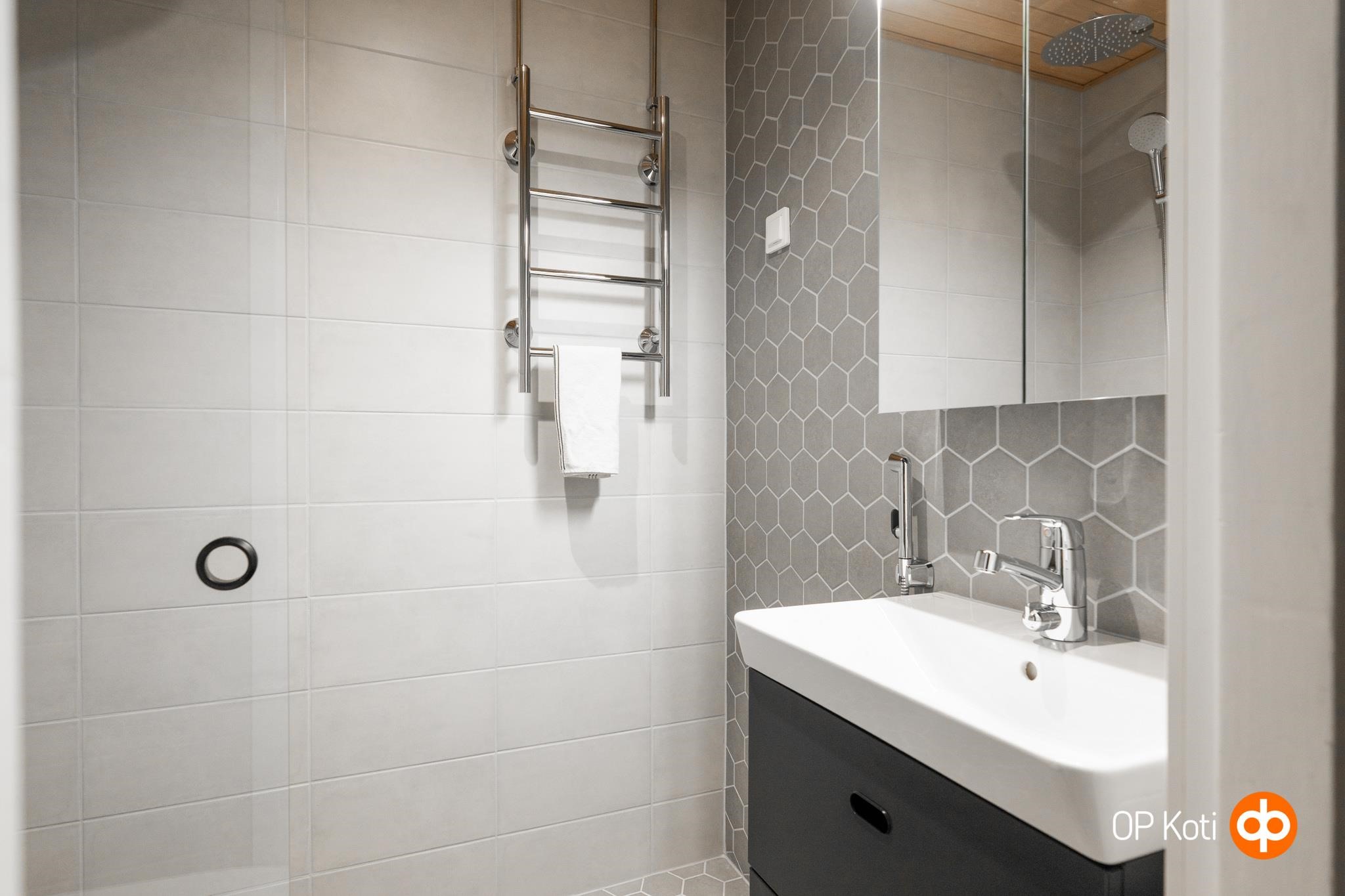 - Kylpyhuone, suihku, suihkuseinä, peilikaappi, allaskaappi, pesukoneliitäntä, lattialämmitys, kiinteät valaisimet. Kph remontoitu 2026