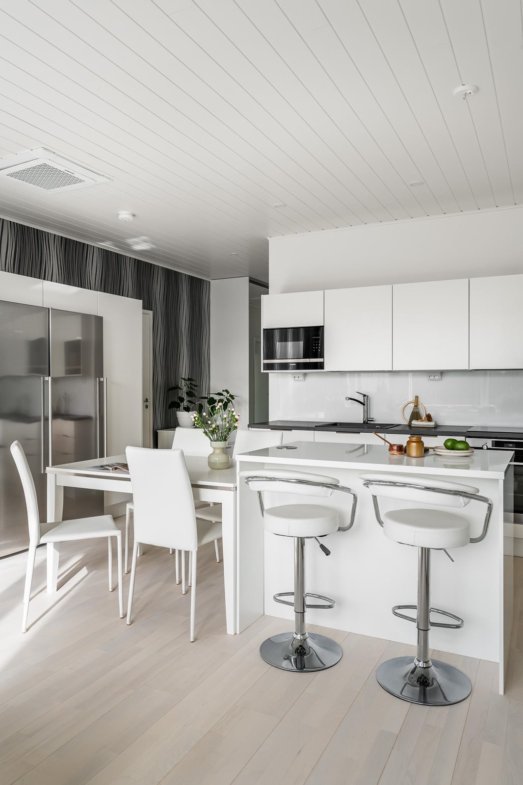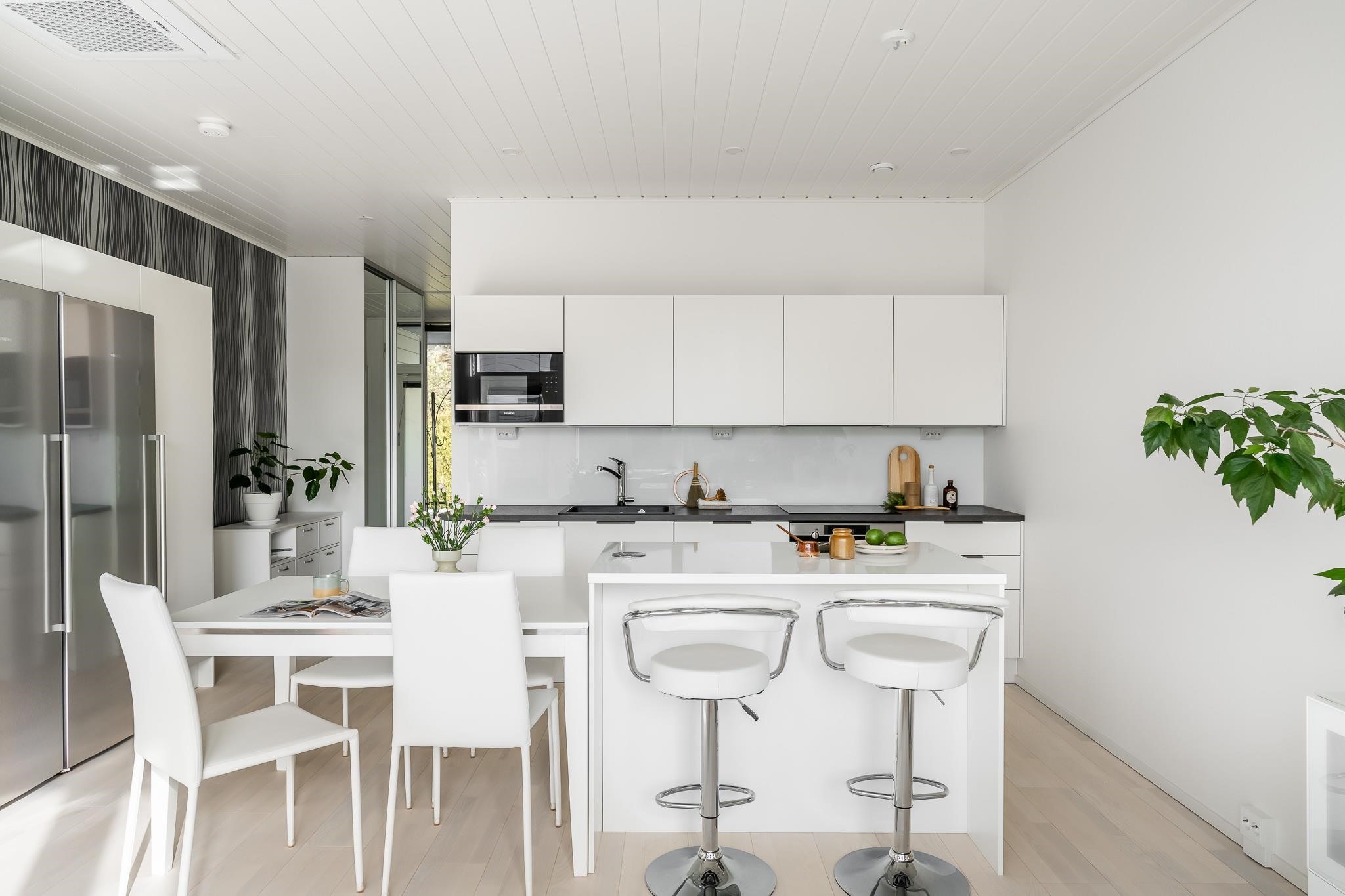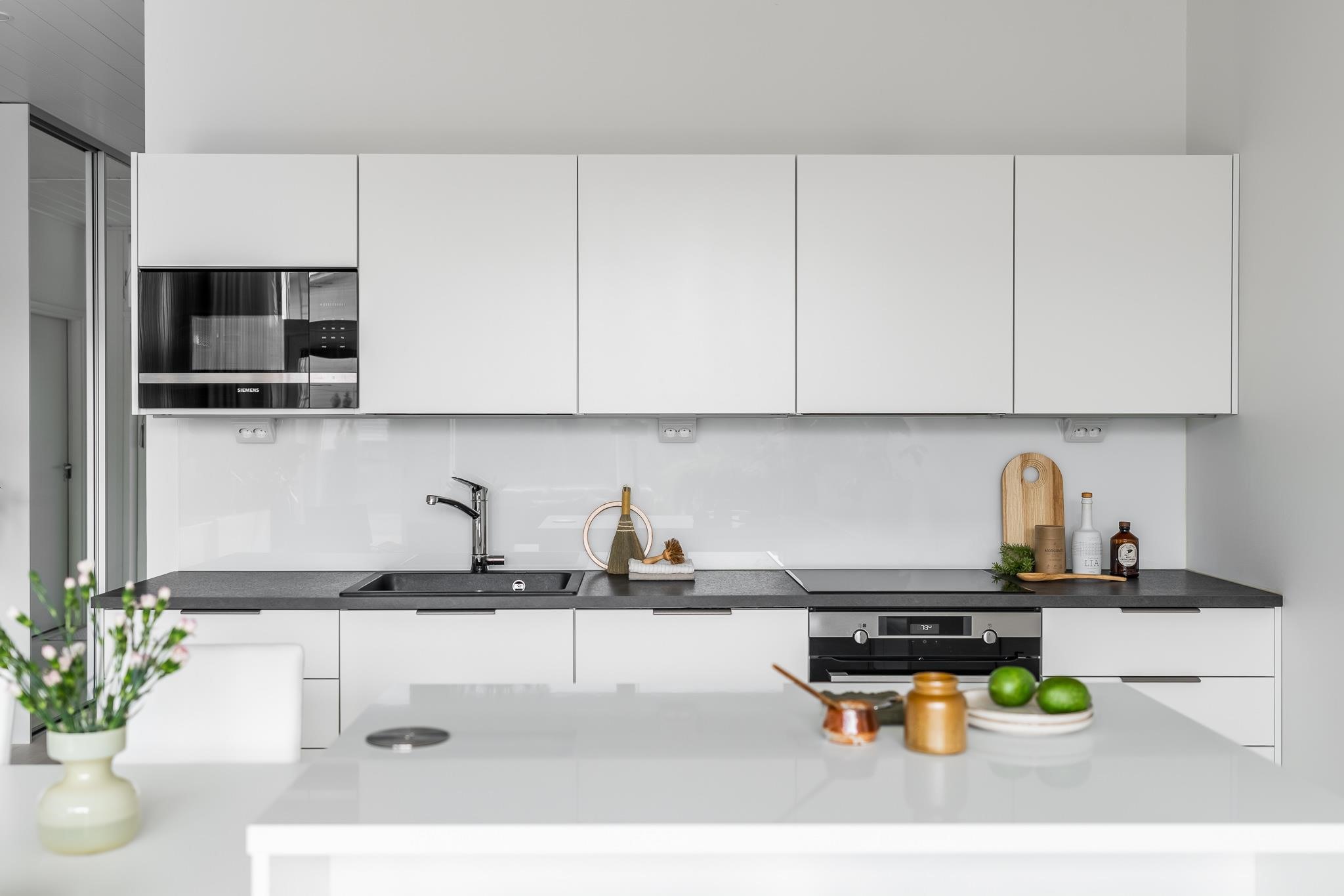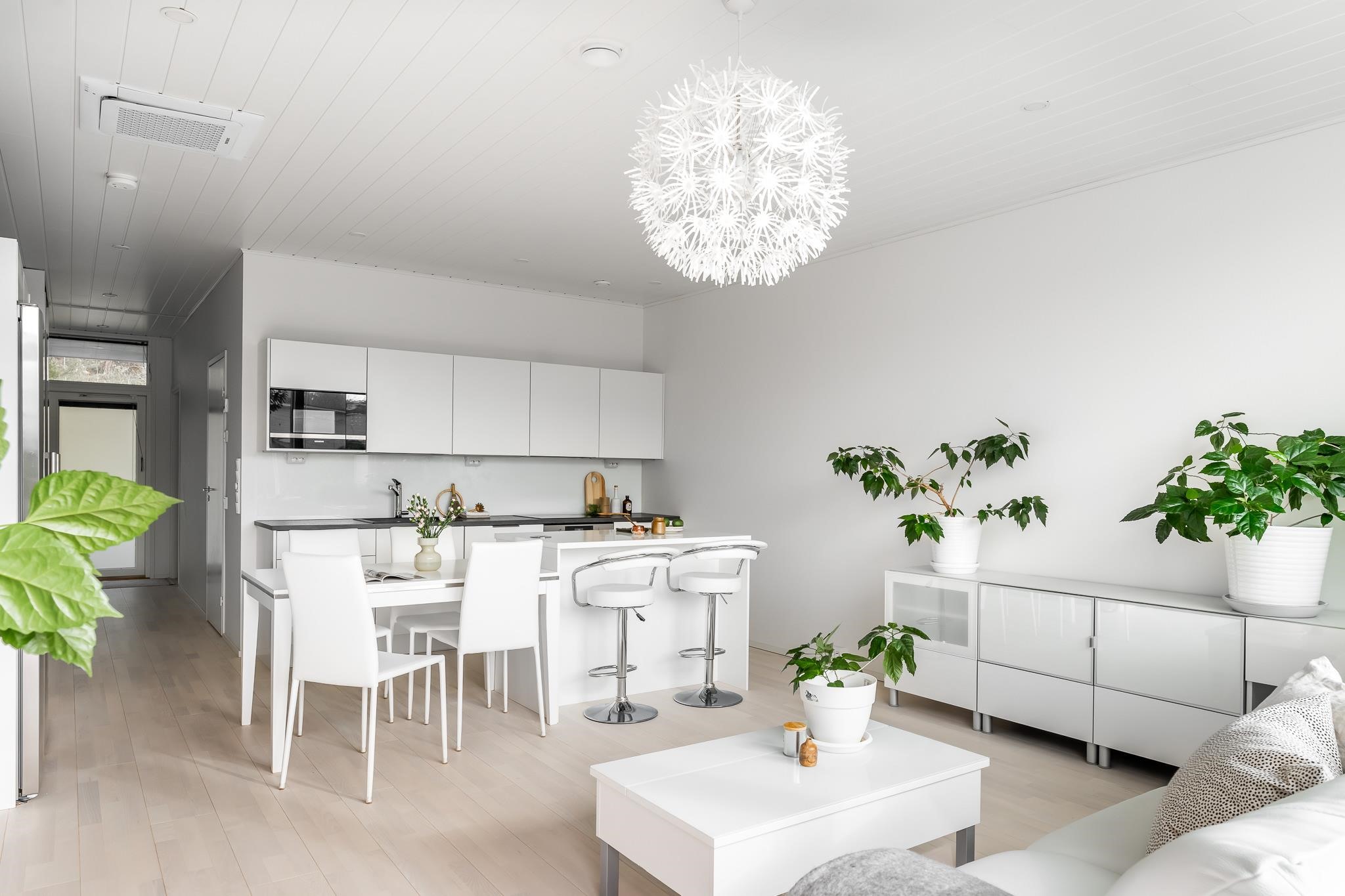 - Jääkaappi, pakastekaappi, erillisuuni, induktioliesi, liesituuletin, mikroaaltouuni, astianpesukone, kaapistot Puustelli, irralliset saarekkeet, kiinteät valaisimet.