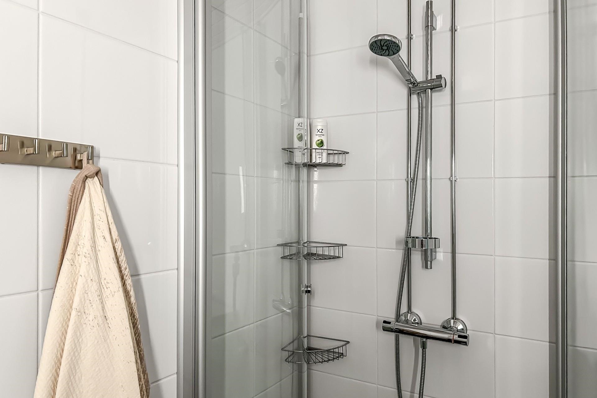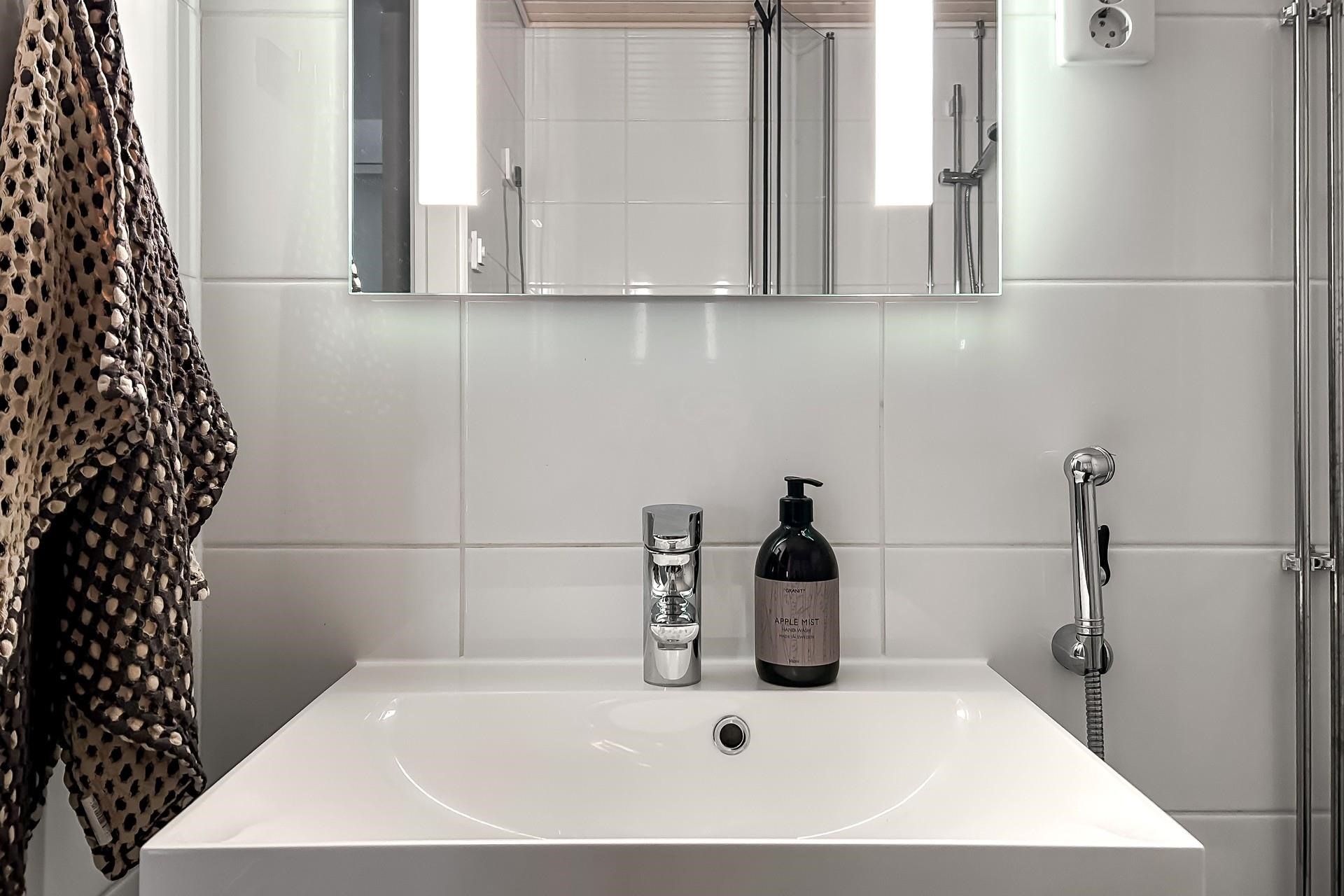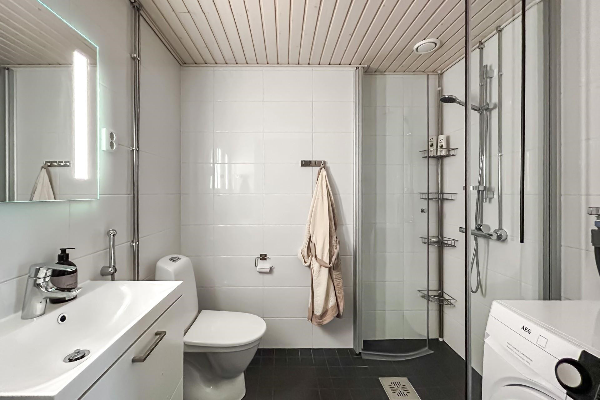 - Kylpyhuone, suihku, suihkuseinä, peilikaappi, allaskaappi, pesukoneliitäntä, lattialämmitys (mukavuus sähkö), kiinteät valaisimet.